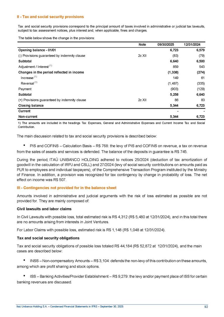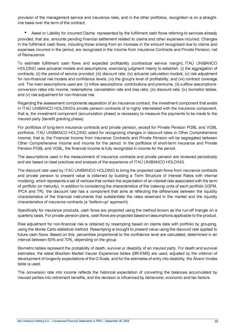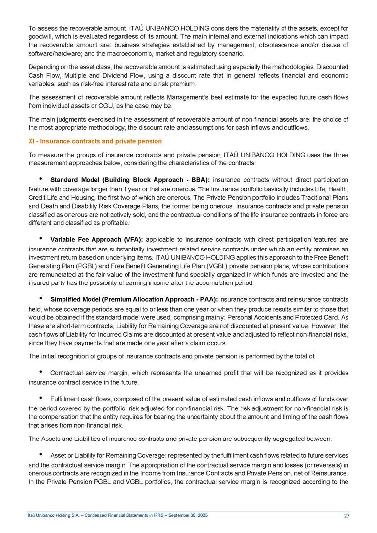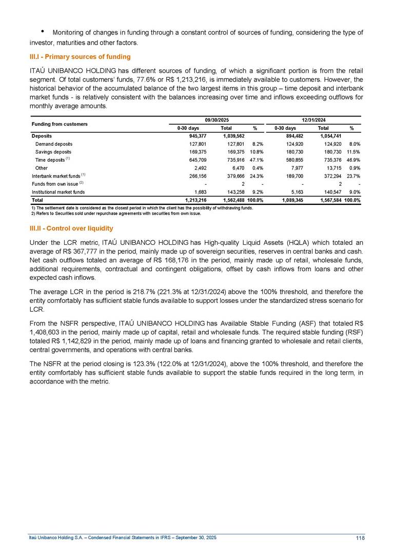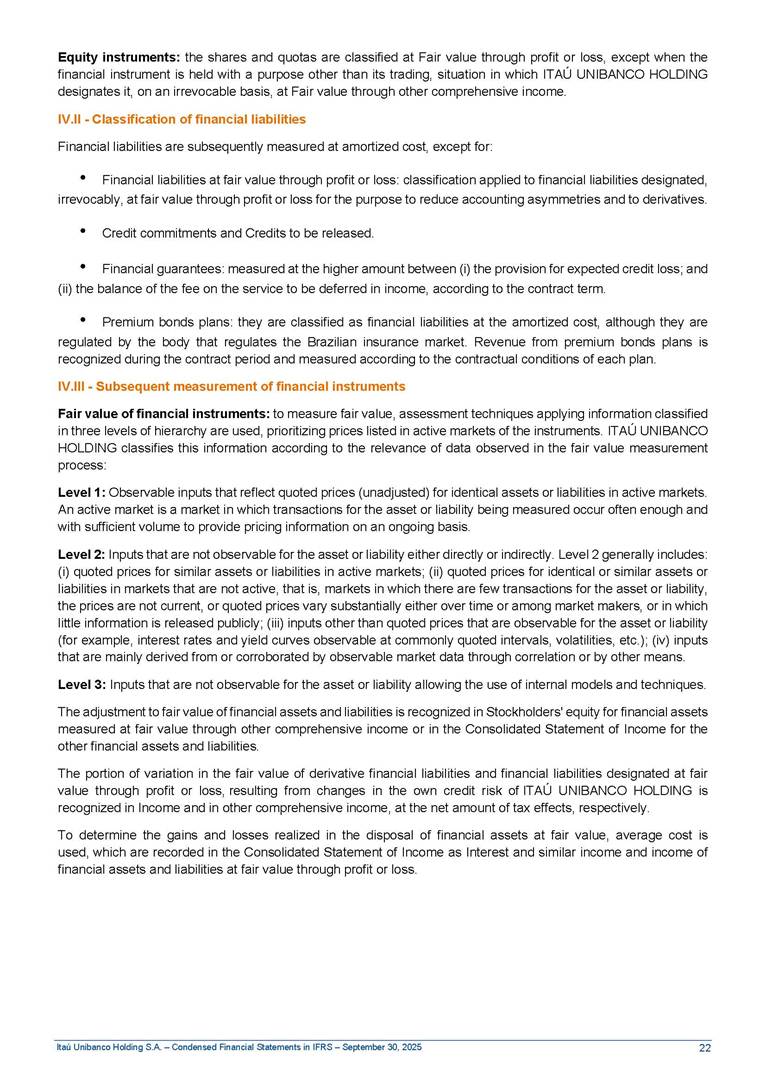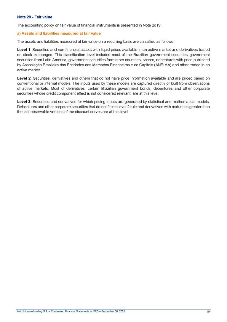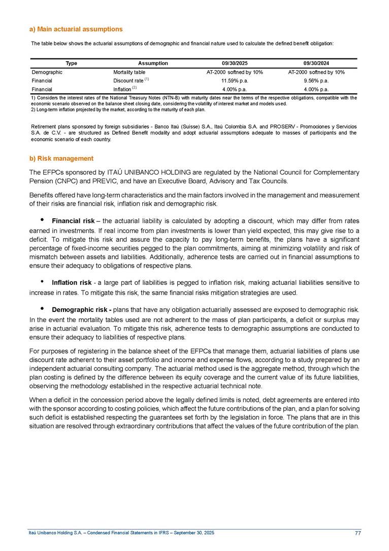 Condensed Financial Statements in IFRS Itaú Unibanco Holding S.A. September 30, 2025 Itaú Day 2025 We held the 5th edition of Itaú Day, an event in which we shared with the market information about the evolution of our business and its impact on our clients’ experience. Itaú Day was attended by the Co-chairmen of the Board of Directors and all members of the Executive Committee. More than 35,000 people have already watched the event, which is available on our Investor Relations website. Management Report 9M25 Key indicators and ratios of our performance from January to September 2025 over the same period of the previous year: Highlights of the first nine months of 2025 Access the full content Recurring Result R$33.1 billion 9M24 8.8% Credit Portfolio1 R$1.4 trillion 9M24 6.1% ROE Recurring 21.1% 9M24 stable Net interest Income2 R$91.8 billion 38.8% Efficiency Ratio3 14.8% Tier 1 Capital Ratio4 13.8% -30 bps -40 bps The credit portfolio1 expanded in Brazil: 6.0% in individuals and 8.7% in companies. There was decrease of 1.2% in Latin America. The 13.8% growth in net interest income² was mainly related to: (i) higher revenues with loan operations, due to higher volume; and (ii) in interbank deposits. The expected credit loss from financial assets increased by 13.9% due to higher expected credit loss with loan and lease operations. General and administrative expenses decreased by 4.8%, mainly due to the reduction in selling of non-financial products, provision for tax and social security lawsuits and other risks. Our accumulated efficiency ratio³ in the first nine months of 2025 decreased 30 bps and stood at 38.8%. (1) Credit portfolio includes financial guarantees provided and private securities. (2) The sum of (i) Interest and Similar Income, (ii) Interest and Similar Expenses, (iii) Income of Financial Assets and Liabilities at Fair Value through Profit or Loss, (iv) Foreign exchange results and exchange variations in foreign transactions. For better comparability, the tax effects of managerial adjustments were reclassified. (3) Efficiency ratio based in BRGAAP managerial disclosure. (4) Considering the limit of 1.5% for AT1, according to CMN Res. No. 4,958. Without this limit, the Tier I Capital Ratio would be 15.3% in Sep-24. Increase of 2.9% in commissions and banking fees and income from insurance and private pension contracts, as a result of the 30.4% increase in income from insurance and private pension contracts, due to the higher financial result for the period and higher insurance sales, mainly related to life and credit life, partially offset by the 1.2% reduction in commissions and banking fees, due to the higher revenues related to current account services, payments and collections and investment banking activities. Performance 9M25 X 9M24 2 3 (1) The sum of (i) Interest and Similar Income, (ii) Interest and Similar Expenses, (iii) Income of Financial Assets and Liabilities at Fair Value through Profit or Loss, (iv) Foreign exchange results and exchange variations in foreign transactions, (v) Commissions and Banking Fees, (vi) Income from Insurance Contracts and Private Pension, net of Reinsurance, and (vii) Other Income. For better comparability, the tax effects of managerial adjustments were reclassified. (2) The sum of (i) Interest and Similar Income, (ii) Interest and Similar Expenses, (iii) Income of Financial Assets and Liabilities at Fair Value through Profit or Loss, (iv) Foreign exchange results and exchange variations in foreign transactions. For better comparability, the tax effects of managerial adjustments were reclassified. (3) The sum on the Commissions and Banking Fees and Income from Insurance Contracts and Private Pension, net of Reinsurance. (4) The Return is calculated by dividing the Net income attributable to owners of the parent company by the Average Stockholders’ Equity. The quotient was multiplied by the number of periods in the year to derive the annualized rate. (5) The return is calculated by dividing the Recurring Result by the Average Stockholders’ Equity. The quotient was multiplied by the number of periods in the year to derive the annualized rate. (6) Source: Bloomberg. (7) The number of outstanding shares has been adjusted to reflect the 10% bonus that took place on March 20, 2025. Therefore, the indicators per share were reclassified. We present below the key indicators comprising our results: In R$ billions Income information 9M25 9M24 Variation Operating Revenues1 Net Interest Income2 Commissions and Banking Fees and Income from Insurance and Private Pension Contracts3 Expected Credit Loss from Financial Assets General and Administrative Expenses Net Income Net Income Attributable to Owners of the Parent Company Recurring Result Return on Average Equity - Annualized4 Recurring Return on Average Equity - Annualized5 Shares 9M257 9M24 7 Variation Net Income per Share - R$ Book Value per Share - R$ (in circulation on 09/30) Dividends and Interest on Own Capital net of Taxes per Share - R$ Average Financial Daily Trading Volume B3 (ON+PN) NYSE (ADR) Market Capitalization6 133.0 91.8 41.1 (24.9) (59.2) 33.7 33.0 33.1 21.0% 21.1% 130.0 80.6 40.0 (21.8) (62.2) 31.0 30.3 30.5 20.9% 21.1% 2.3% 13.8% 2.9% 13.9% -4.8% 8.7% 8.9% 8.8% 10 bps stable 3.06 20.02 0.75 1.8 0.8 1.0 397.2 2.81 18.69 0.71 1.4 0.8 0.6 330.8 8.9% 7.1% 4.9% 29.0% 2.5% 64.6% 20.1% 4 Know more Know more Know more We created a focused structure for crypto fund management Through Itaú Asset, we created our first dedicated structure for cryptoassets. This initiative reinforces our commitment to delivering innovative and tailored solutions to our clients, offering products that cover all allocation possibilities in the financial market. Our new crypto-focused team is now part of the Multimesas structure (similar to multi-asset), which includes more than 130 investment professionals. We are the first bank to offer Pix for small and medium-sized businesses using the Guaran