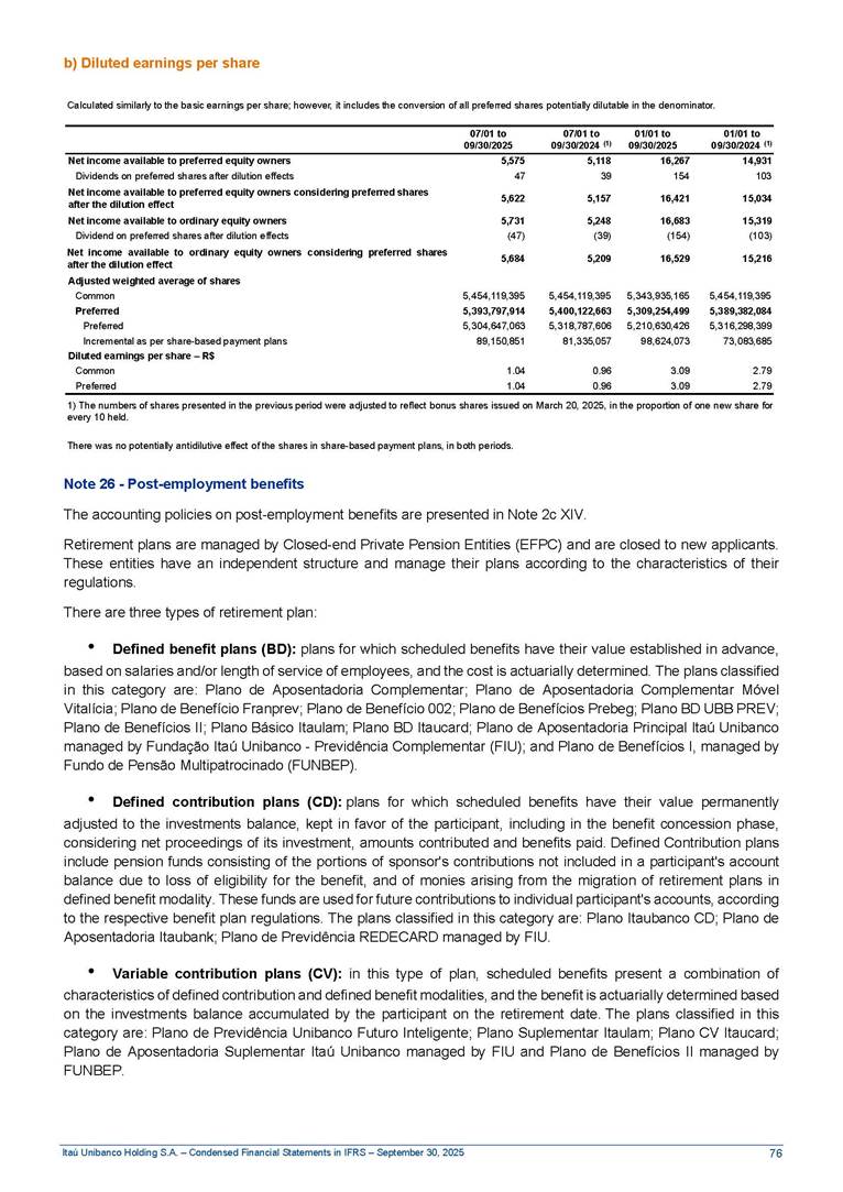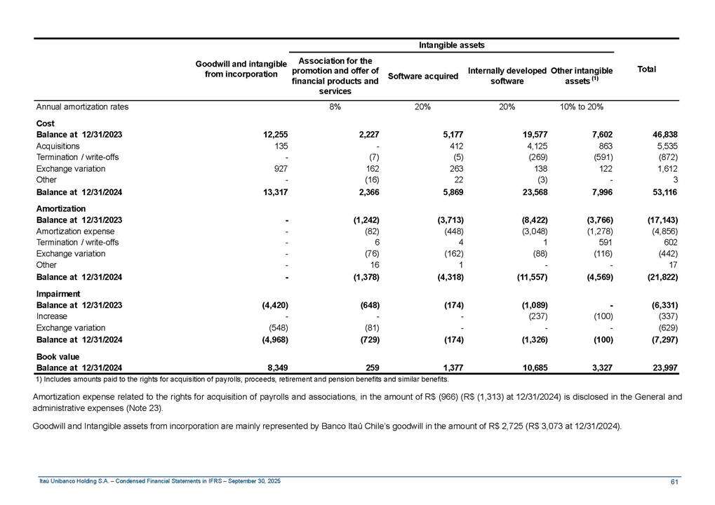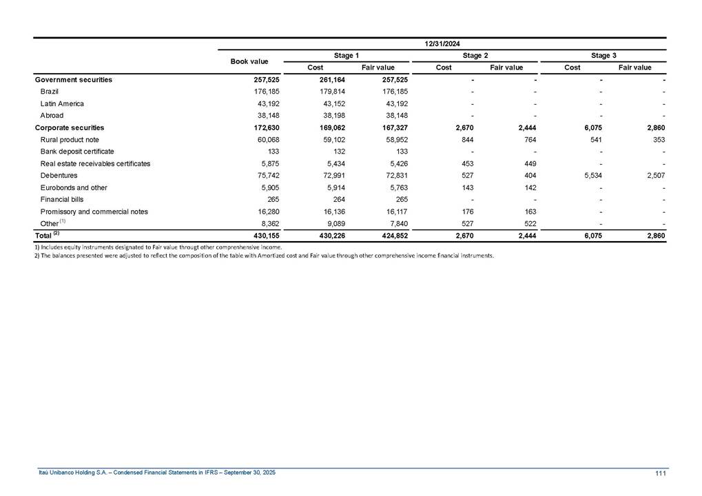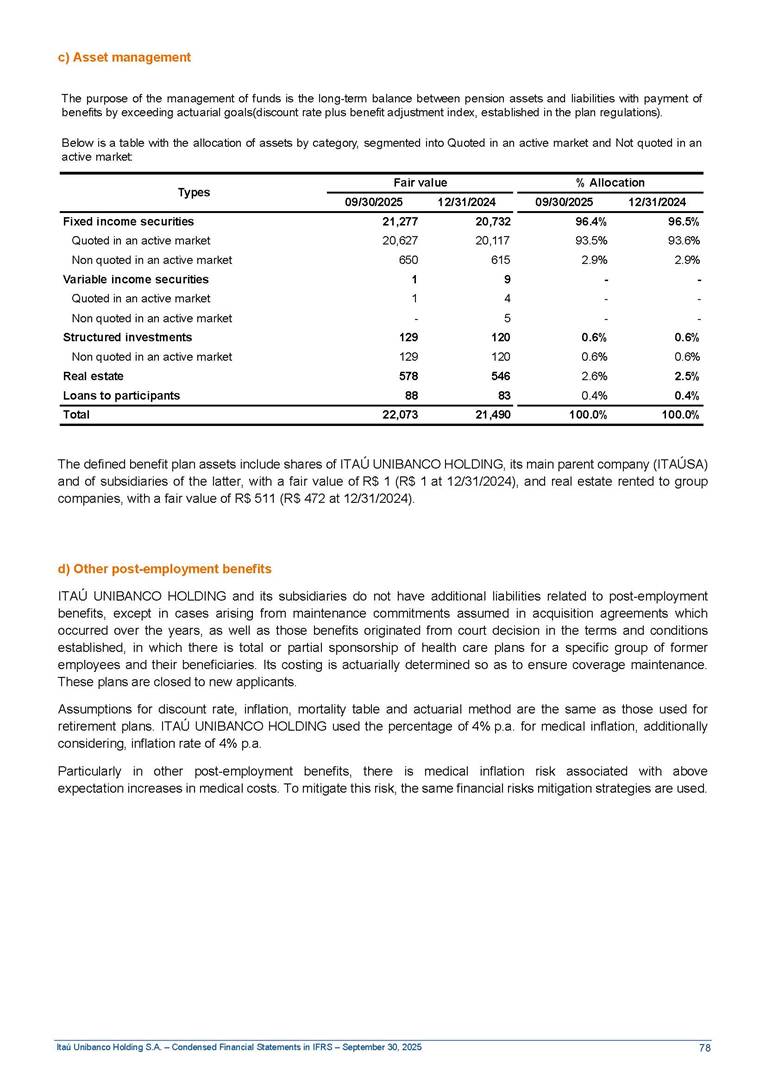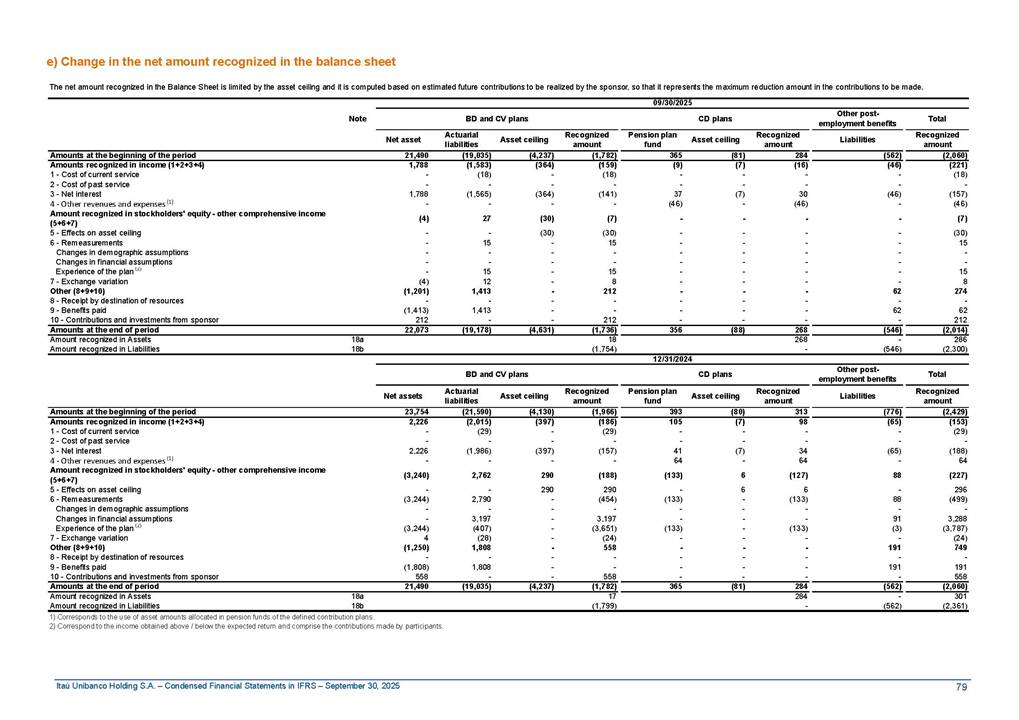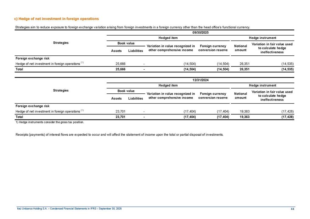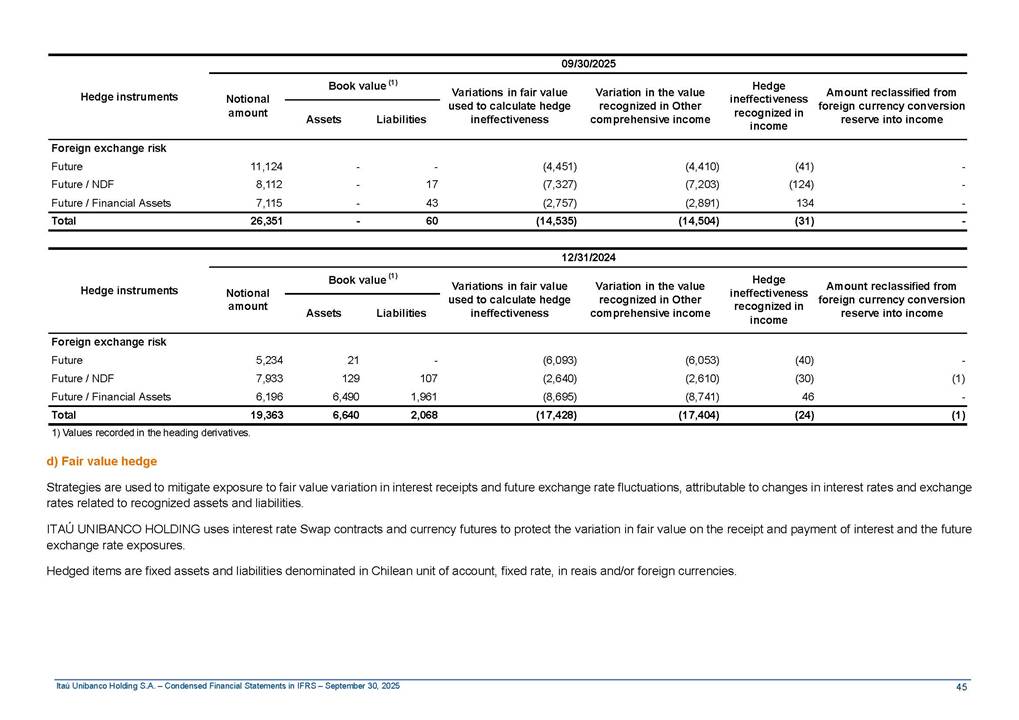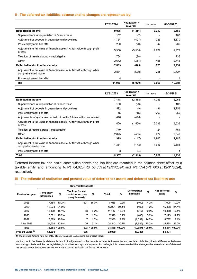 Condensed Financial Statements in IFRS Itaú Unibanco Holding S.A. September 30, 2025 Itaú Day 2025 We held the 5th edition of Itaú Day, an event in which we shared with the market information about the evolution of our business and its impact on our clients’ experience. Itaú Day was attended by the Co-chairmen of the Board of Directors and all members of the Executive Committee. More than 35,000 people have already watched the event, which is available on our Investor Relations website. Management Report 9M25 Key indicators and ratios of our performance from January to September 2025 over the same period of the previous year: Highlights of the first nine months of 2025 Access the full content Recurring Result R$33.1 billion 9M24 8.8% Credit Portfolio1 R$1.4 trillion 9M24 6.1% ROE Recurring 21.1% 9M24 stable Net interest Income2 R$91.8 billion 38.8% Efficiency Ratio3 14.8% Tier 1 Capital Ratio4 13.8% -30 bps -40 bps The credit portfolio1 expanded in Brazil: 6.0% in individuals and 8.7% in companies. There was decrease of 1.2% in Latin America. The 13.8% growth in net interest income² was mainly related to: (i) higher revenues with loan operations, due to higher volume; and (ii) in interbank deposits. The expected credit loss from financial assets increased by 13.9% due to higher expected credit loss with loan and lease operations. General and administrative expenses decreased by 4.8%, mainly due to the reduction in selling of non-financial products, provision for tax and social security lawsuits and other risks. Our accumulated efficiency ratio³ in the first nine months of 2025 decreased 30 bps and stood at 38.8%. (1) Credit portfolio includes financial guarantees provided and private securities. (2) The sum of (i) Interest and Similar Income, (ii) Interest and Similar Expenses, (iii) Income of Financial Assets and Liabilities at Fair Value through Profit or Loss, (iv) Foreign exchange results and exchange variations in foreign transactions. For better comparability, the tax effects of managerial adjustments were reclassified. (3) Efficiency ratio based in BRGAAP managerial disclosure. (4) Considering the limit of 1.5% for AT1, according to CMN Res. No. 4,958. Without this limit, the Tier I Capital Ratio would be 15.3% in Sep-24. Increase of 2.9% in commissions and banking fees and income from insurance and private pension contracts, as a result of the 30.4% increase in income from insurance and private pension contracts, due to the higher financial result for the period and higher insurance sales, mainly related to life and credit life, partially offset by the 1.2% reduction in commissions and banking fees, due to the higher revenues related to current account services, payments and collections and investment banking activities. Performance 9M25 X 9M24 2 3 (1) The sum of (i) Interest and Similar Income, (ii) Interest and Similar Expenses, (iii) Income of Financial Assets and Liabilities at Fair Value through Profit or Loss, (iv) Foreign exchange results and exchange variations in foreign transactions, (v) Commissions and Banking Fees, (vi) Income from Insurance Contracts and Private Pension, net of Reinsurance, and (vii) Other Income. For better comparability, the tax effects of managerial adjustments were reclassified. (2) The sum of (i) Interest and Similar Income, (ii) Interest and Similar Expenses, (iii) Income of Financial Assets and Liabilities at Fair Value through Profit or Loss, (iv) Foreign exchange results and exchange variations in foreign transactions. For better comparability, the tax effects of managerial adjustments were reclassified. (3) The sum on the Commissions and Banking Fees and Income from Insurance Contracts and Private Pension, net of Reinsurance. (4) The Return is calculated by dividing the Net income attributable to owners of the parent company by the Average Stockholders’ Equity. The quotient was multiplied by the number of periods in the year to derive the annualized rate. (5) The return is calculated by dividing the Recurring Result by the Average Stockholders’ Equity. The quotient was multiplied by the number of periods in the year to derive the annualized rate. (6) Source: Bloomberg. (7) The number of outstanding shares has been adjusted to reflect the 10% bonus that took place on March 20, 2025. Therefore, the indicators per share were reclassified. We present below the key indicators comprising our results: In R$ billions Income information 9M25 9M24 Variation Operating Revenues1 Net Interest Income2 Commissions and Banking Fees and Income from Insurance and Private Pension Contracts3 Expected Credit Loss from Financial Assets General and Administrative Expenses Net Income Net Income Attributable to Owners of the Parent Company Recurring Result Return on Average Equity - Annualized4 Recurring Return on Average Equity - Annualized5 Shares 9M257 9M24 7 Variation Net Income per Share - R$ Book Value per Share - R$ (in circulation on 09/30) Dividends and Interest on Own Capital net of Taxes per Share - R$ Average Financial Daily Trading Volume B3 (ON+PN) NYSE (ADR) Market Capitalization6 133.0 91.8 41.1 (24.9) (59.2) 33.7 33.0 33.1 21.0% 21.1% 130.0 80.6 40.0 (21.8) (62.2) 31.0 30.3 30.5 20.9% 21.1% 2.3% 13.8% 2.9% 13.9% -4.8% 8.7% 8.9% 8.8% 10 bps stable 3.06 20.02 0.75 1.8 0.8 1.0 397.2 2.81 18.69 0.71 1.4 0.8 0.6 330.8 8.9% 7.1% 4.9% 29.0% 2.5% 64.6% 20.1% 4 Know more Know more Know more We created a focused structure for crypto fund management Through Itaú Asset, we created our first dedicated structure for cryptoassets. This initiative reinforces our commitment to delivering innovative and tailored solutions to our clients, offering products that cover all allocation possibilities in the financial market. Our new crypto-focused team is now part of the Multimesas structure (similar to multi-asset), which includes more than 130 investment professionals. We are the first bank to offer Pix for small and medium-sized businesses using the Guaran