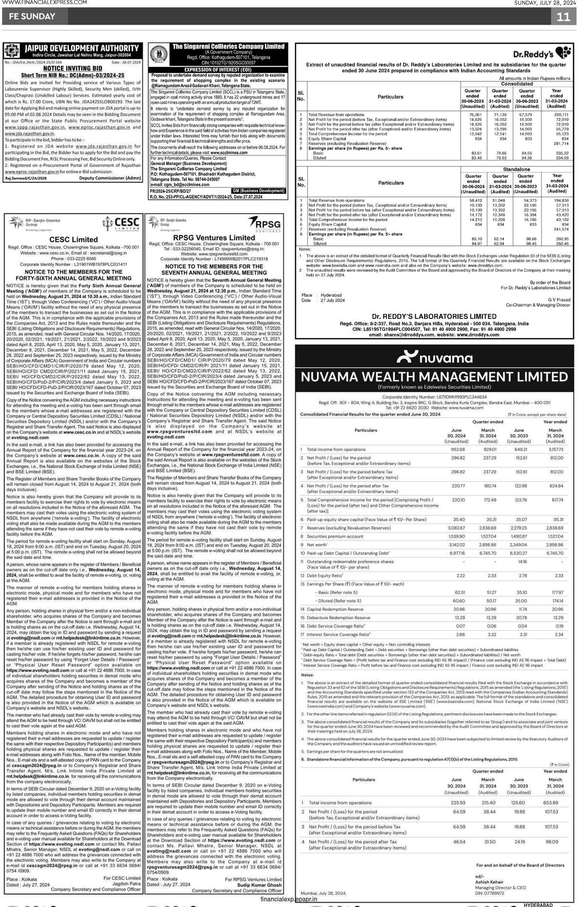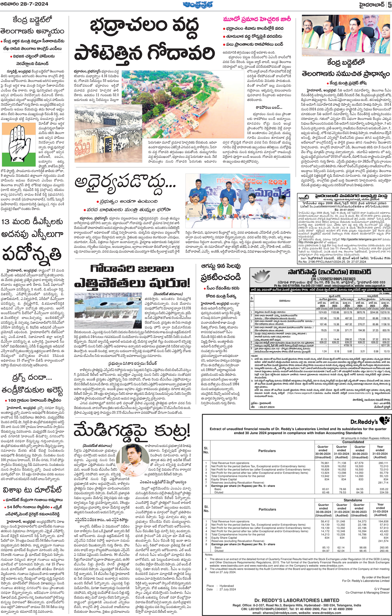 Pursuant to Regulation 47 of the Securities and Exchange Board of India (Listing Obligations and Disclosure Requirements) Regulation, 2015, as amended, please find enclosed copies of newspaper advertisement regarding the unaudited financial results of the Company for the quarter ended June 30, 2024, as published in Financial Express and Andhra Prabha on July 28, 2024.