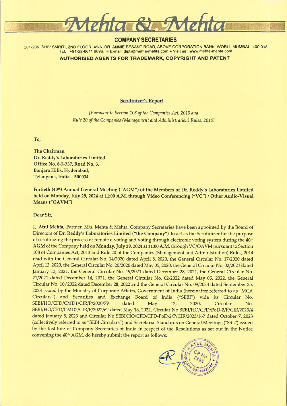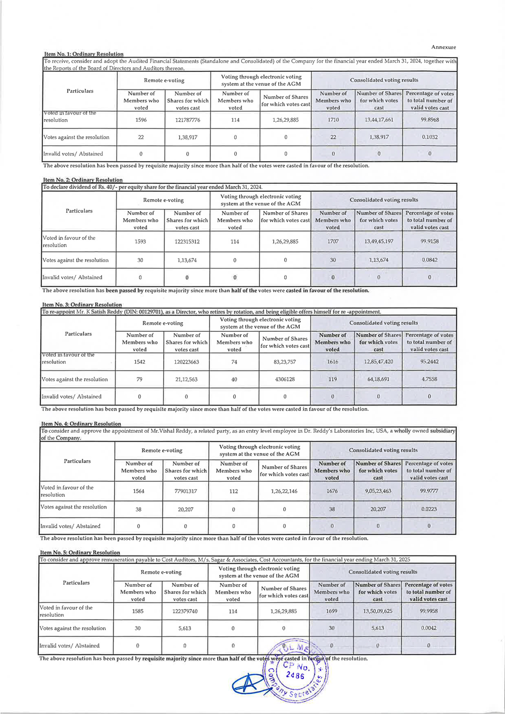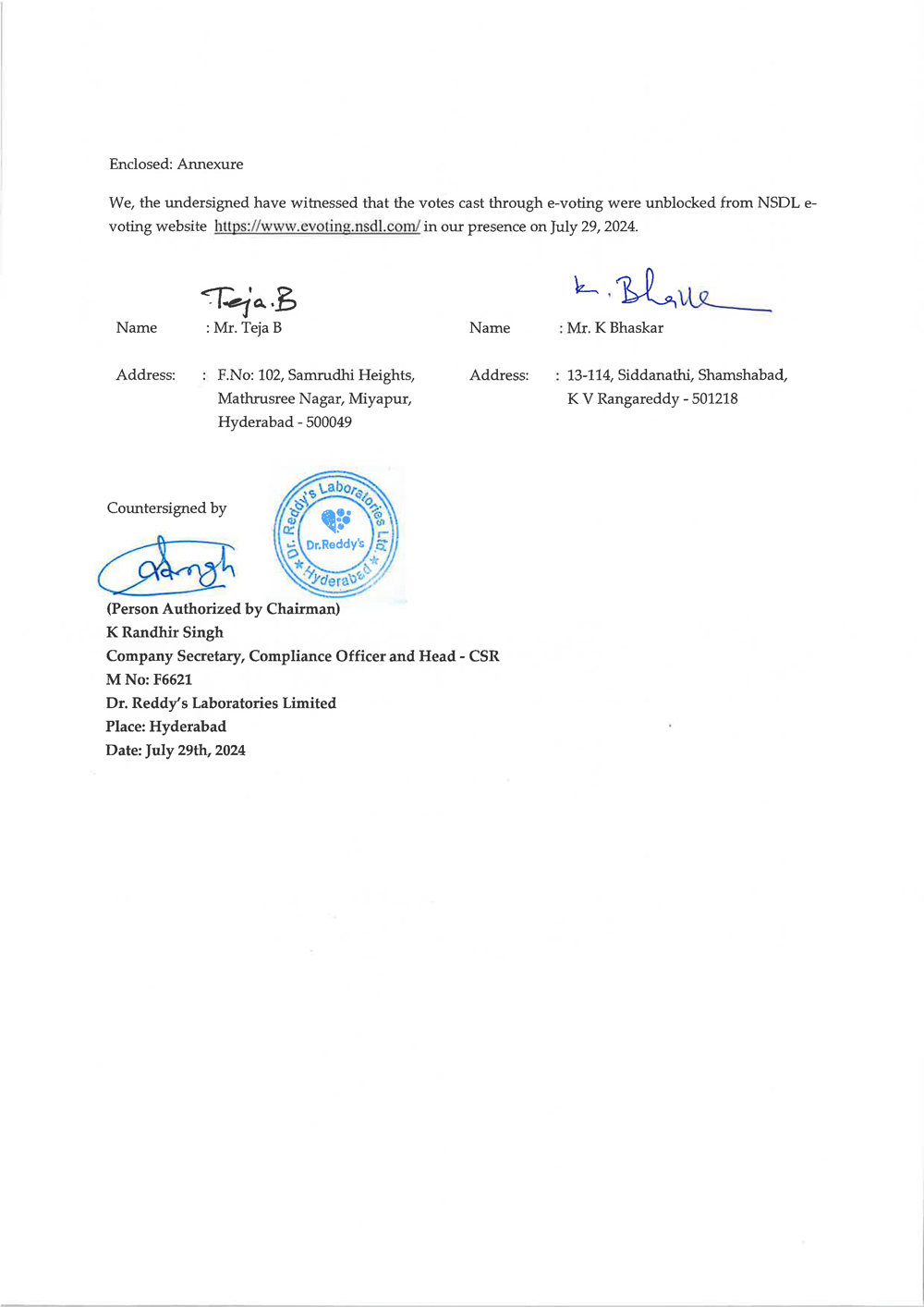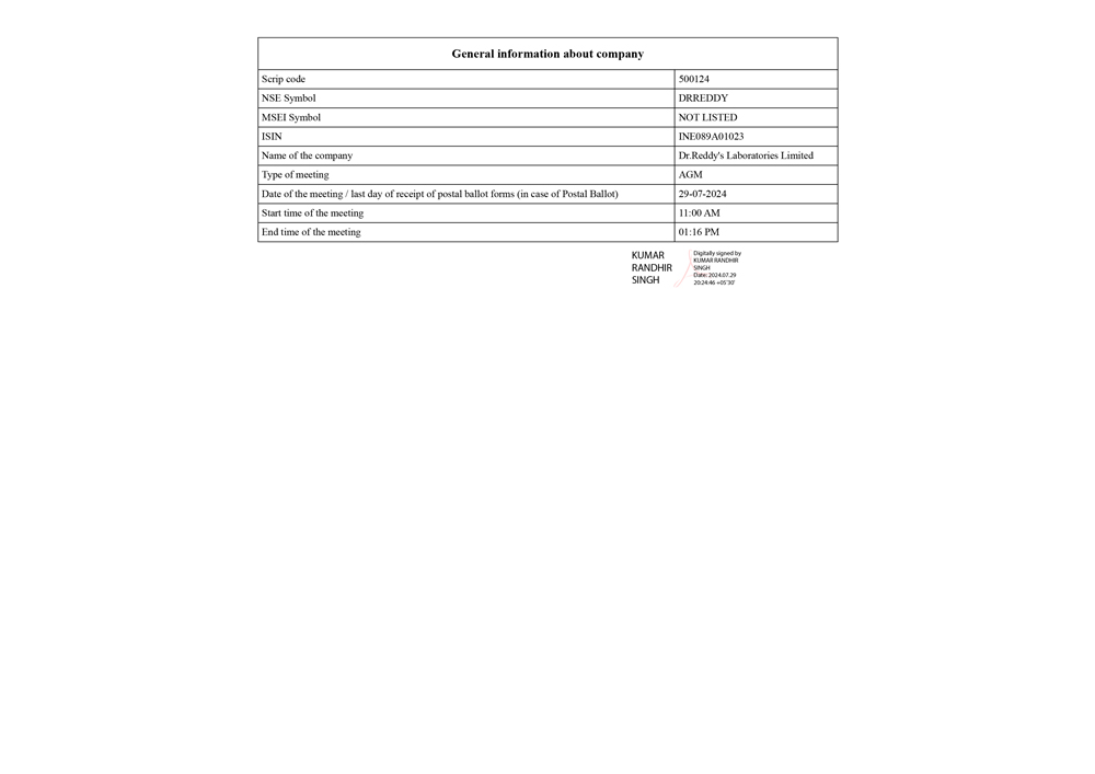 Summary of proceedings of the 40th Annual General Meeting (AGM) of the members of Dr. Reddy’s Laboratories Limited (‘the Company’) held on Monday, July 29, 2024 at 11.00 AM (IST) through Video Conferencing (VC) /Other Audio Visual Means (OAVM).