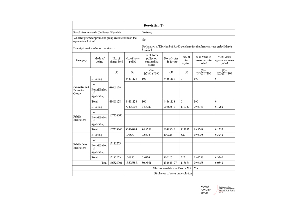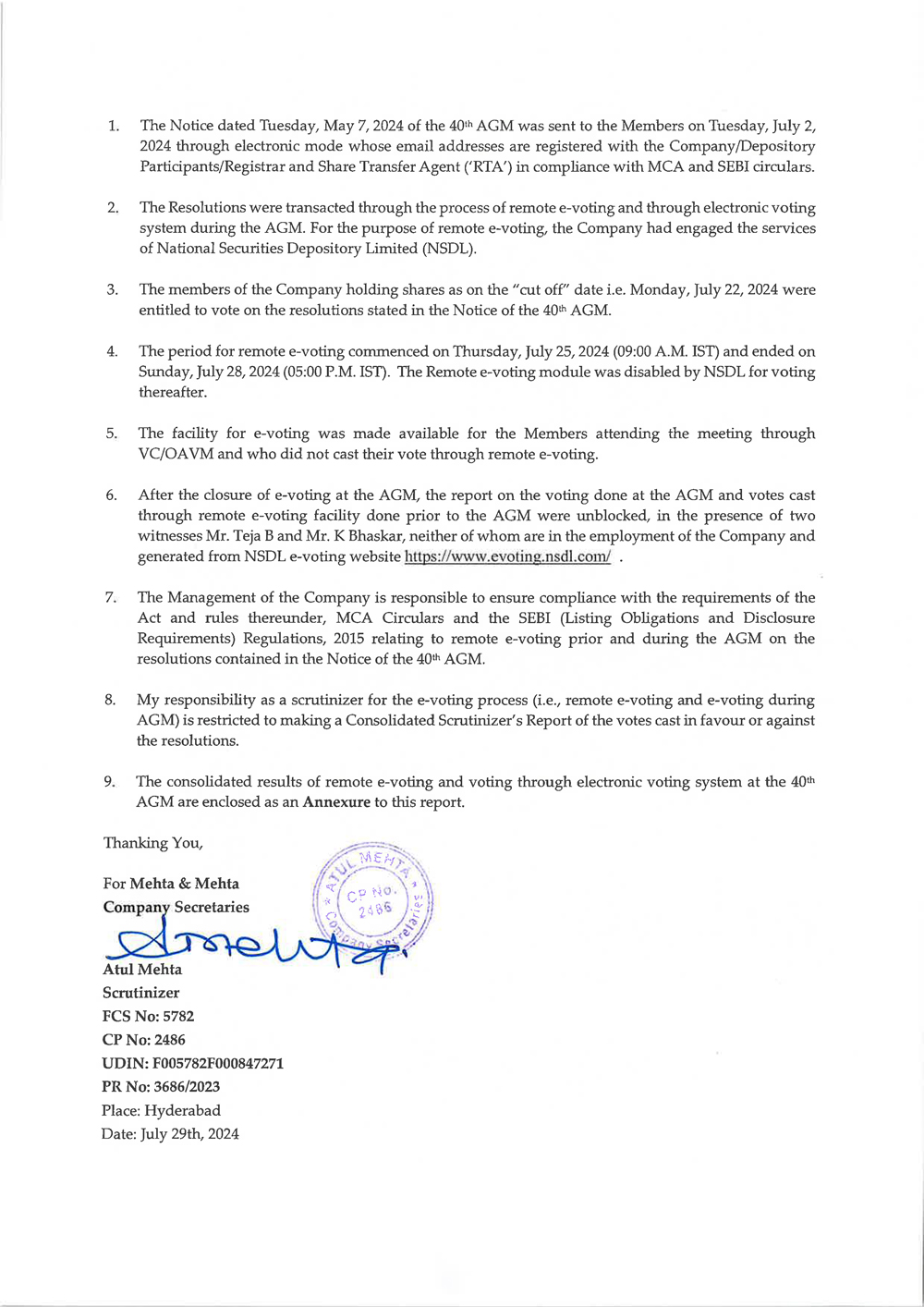The Scrutinizer’s Report was received, and accordingly all the resolutions as set out in the Notice of the 40th AGM were declared as passed by requisite majority.