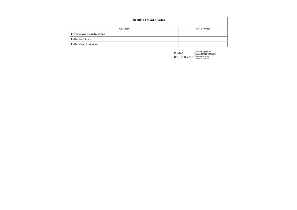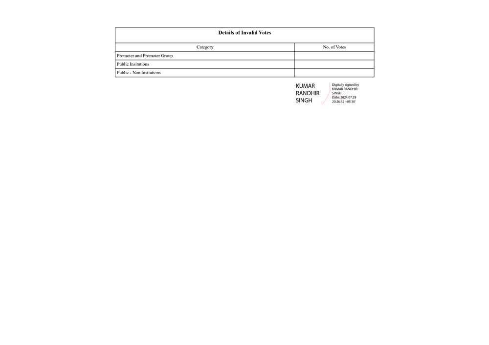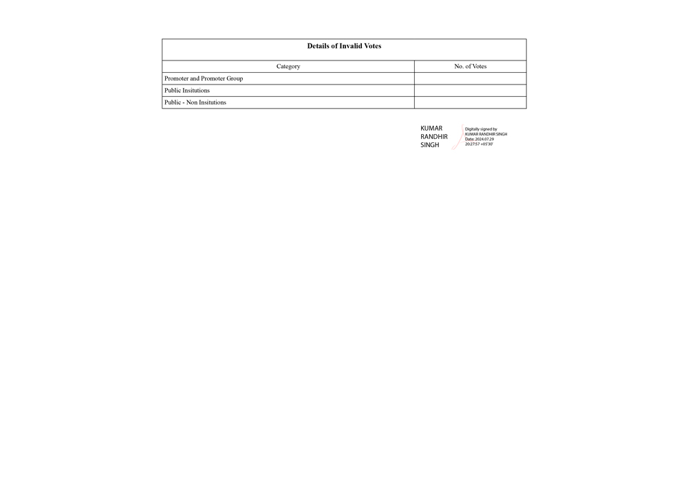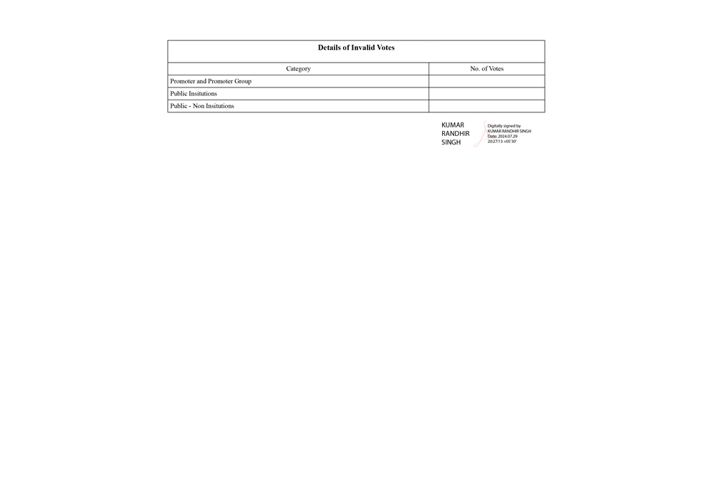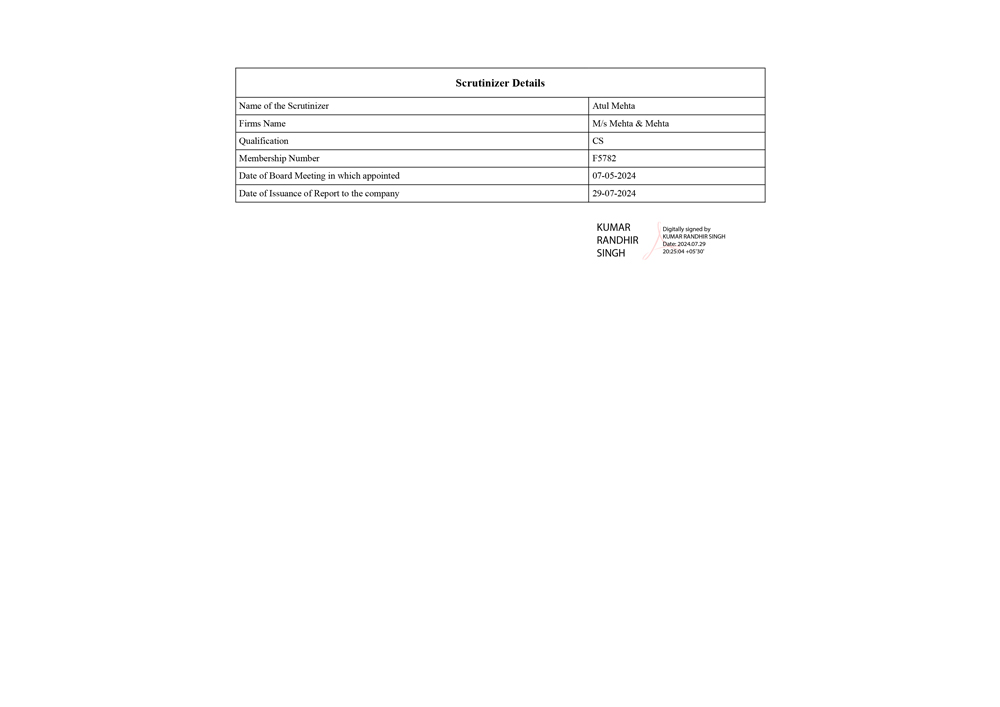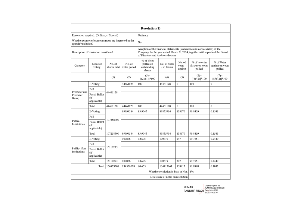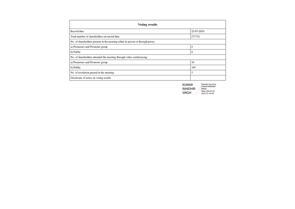 In accordance with Regulation 44 of the SEBI (Listing Obligations and Disclosure Requirements) Regulations, 2015 (SEBI Listing Regulations), this is to inform you that the Members of the Company transacted the business as stated in the Notice of 40th AGM, dated May 07, 2024, through video conferencing facility.