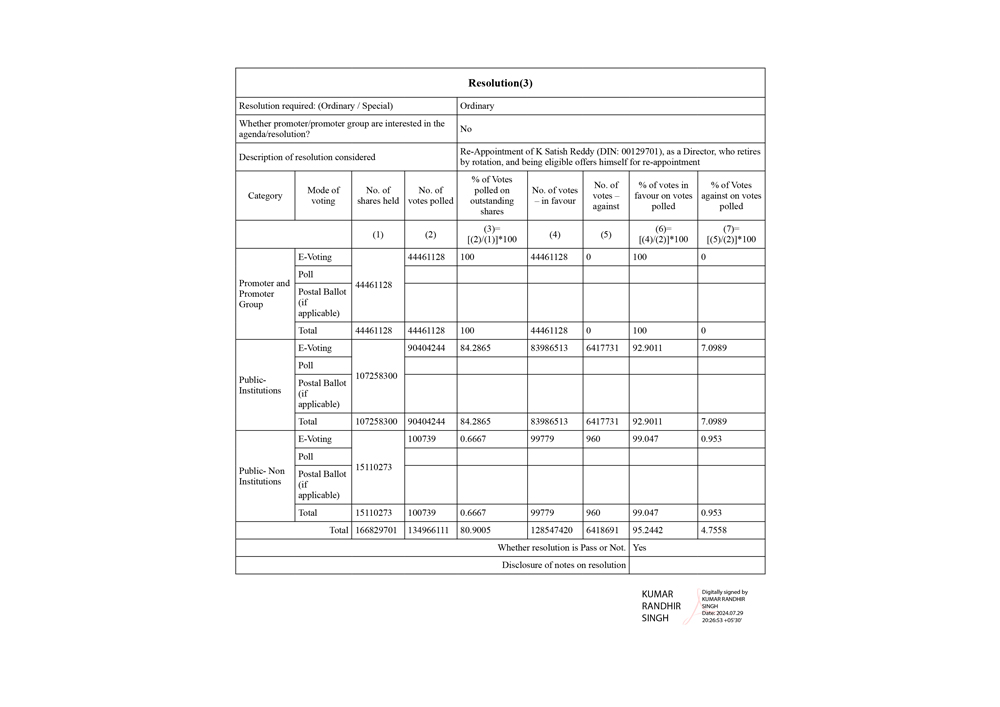 3.Re-appointment of Mr. K Satish Reddy (DIN: 00129701), as a Director, who retires by rotation, and being eligible offers himself for re-appointment (Ordinary Resolution).