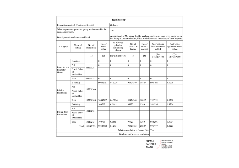 4.Approval of the appointment of Mr. Vishal Reddy, a related party, as an entry level employee in Dr. Reddy’s Laboratories Inc, USA, a wholly owned subsidiary of the Company (Ordinary Resolution).