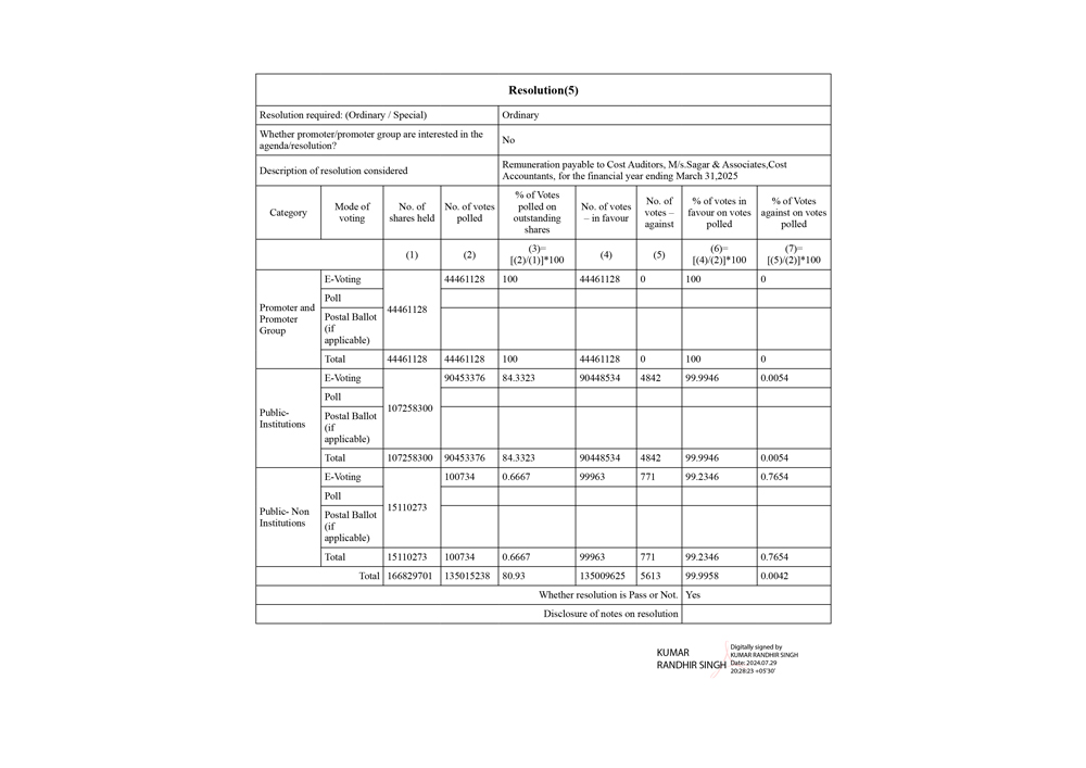 5.Approval of the remuneration payable to Cost Auditors, M/s. Sagar & Associates, Cost Accountants, for the financial year ending March 31, 2025 (Ordinary Resolution).
