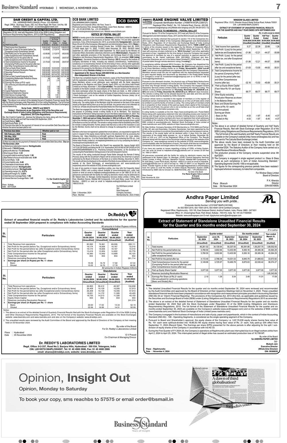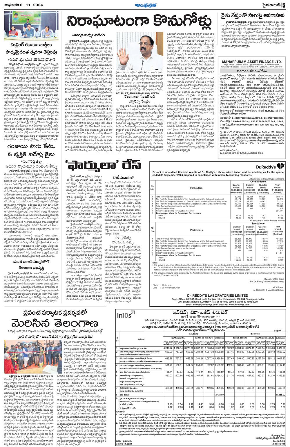 Pursuant to Regulation 47 of the Securities and Exchange Board of India (Listing Obligations and Disclosure Requirements) Regulation, 2015, as amended, please find enclosed copies of newspaper advertisement regarding the unaudited financial results of the Company for the quarter and half-year ended September 30, 2024, as published in Business Standard and Andhra Prabha on November 6, 2024.