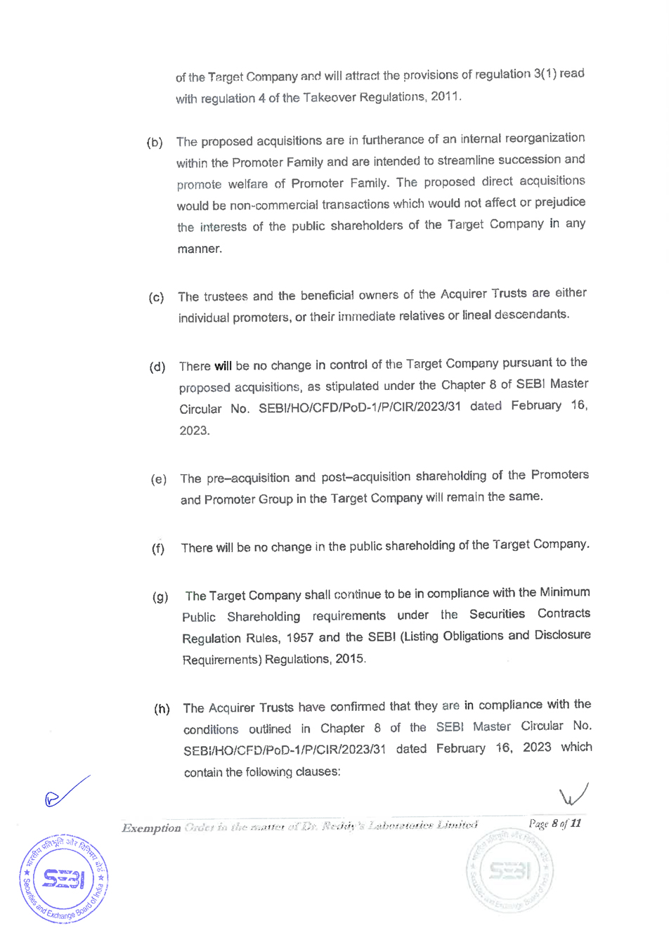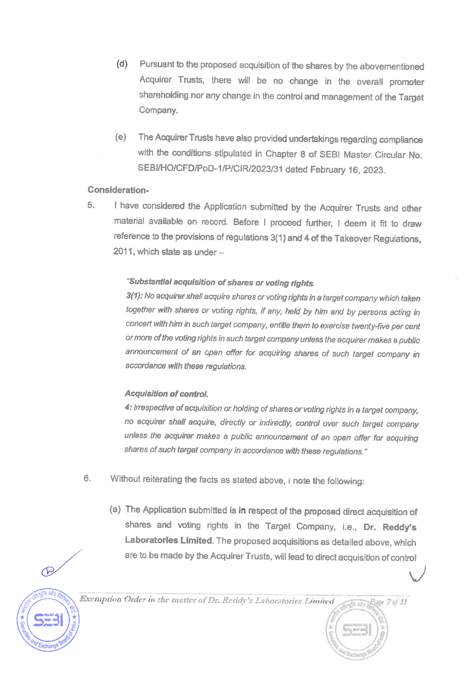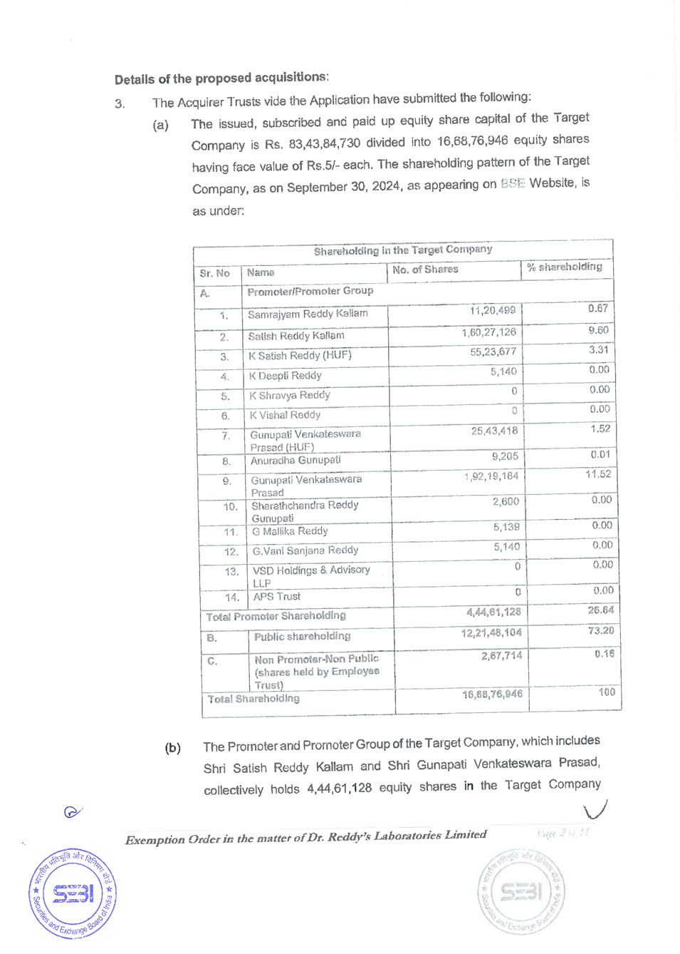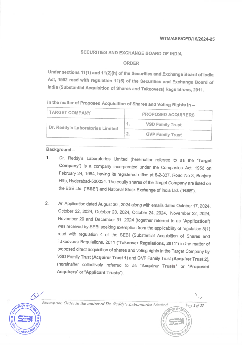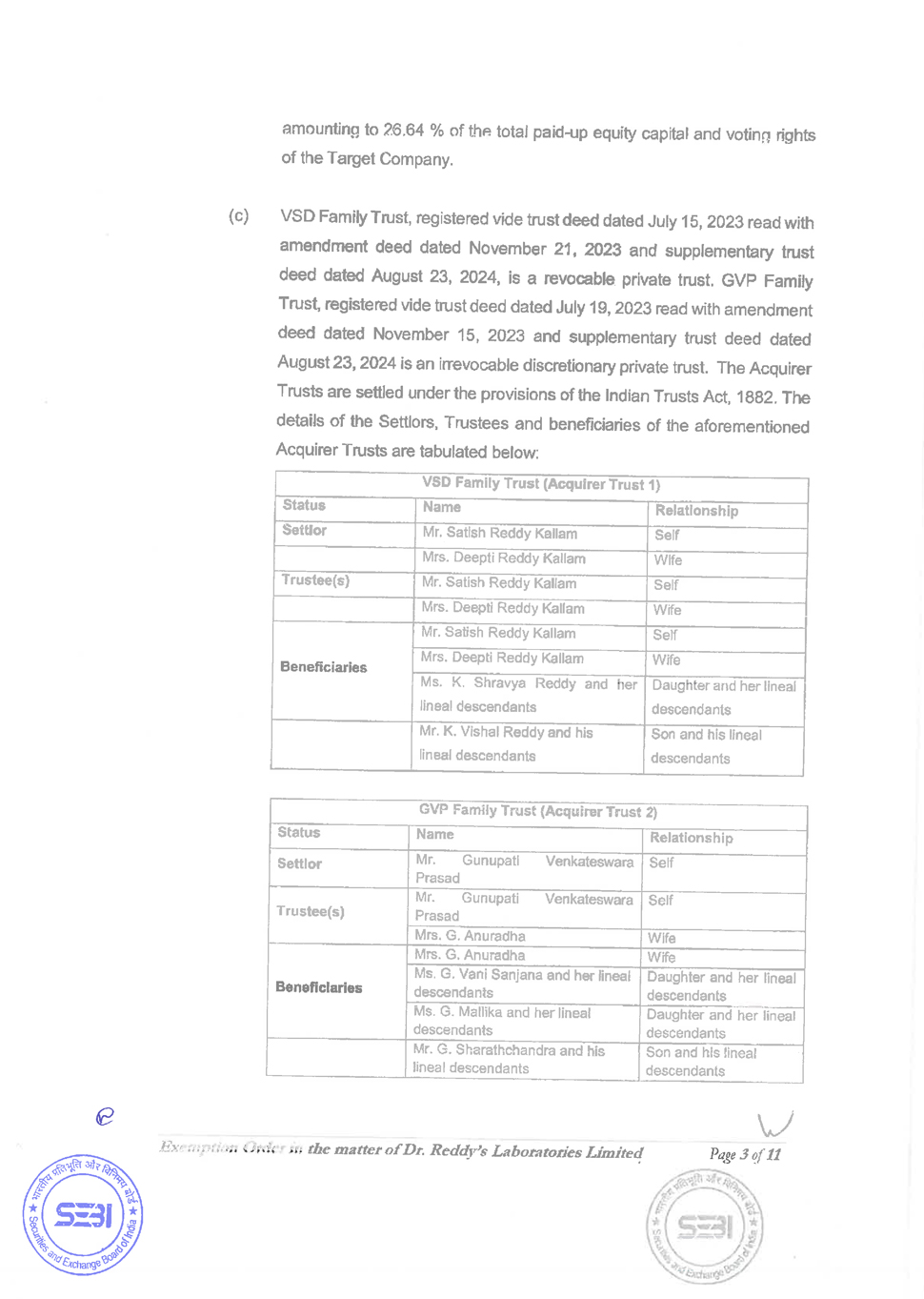 This transfer is only a private family arrangement, for smooth succession planning of the family and to streamline the family's assets and businesses. The shares have been acquired by the said Trusts from the Promoters pursuant to exemption provided in SEBI Order dated December 31, 2024 bearing reference number WTM/ASB/CFD/16/2024-25 in the matter of "Dr. Reddy’s Laboratories Limited".