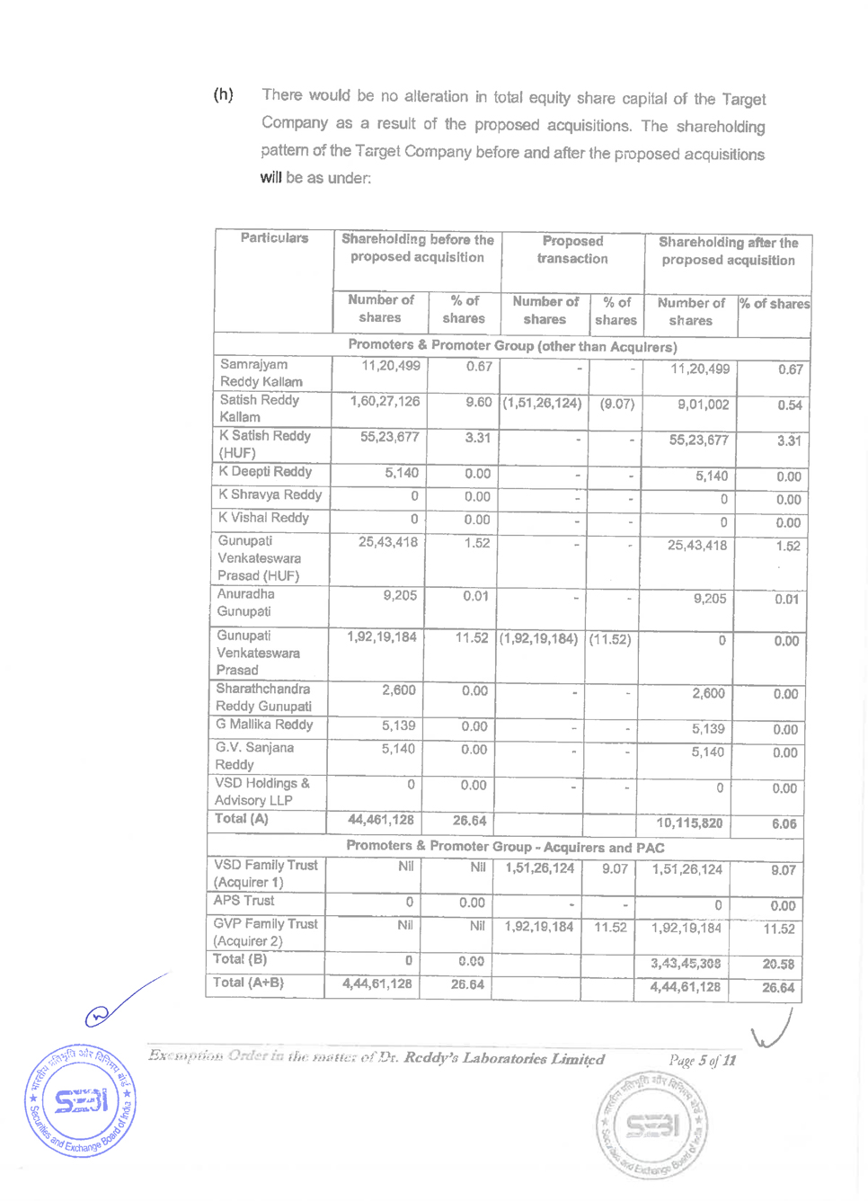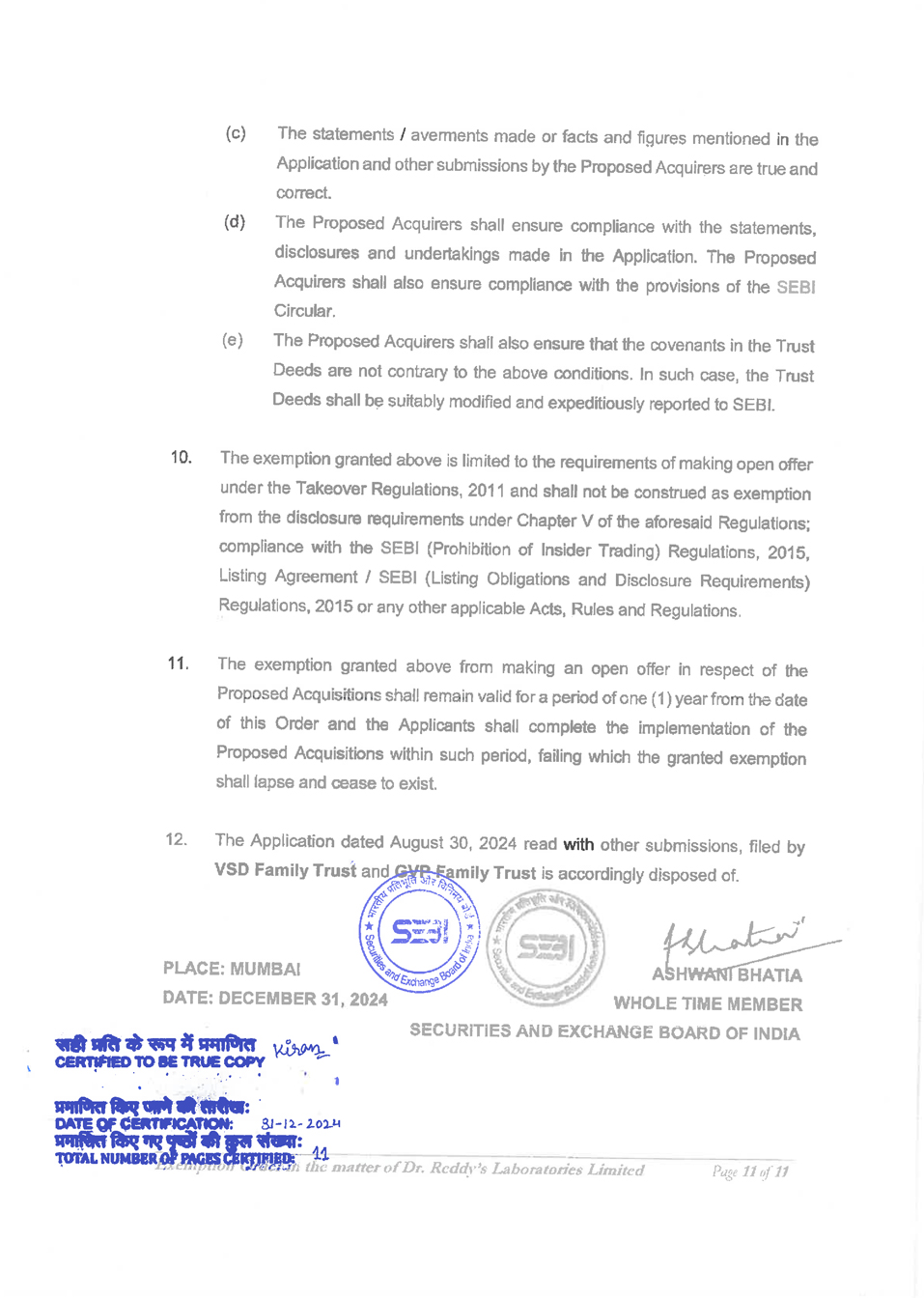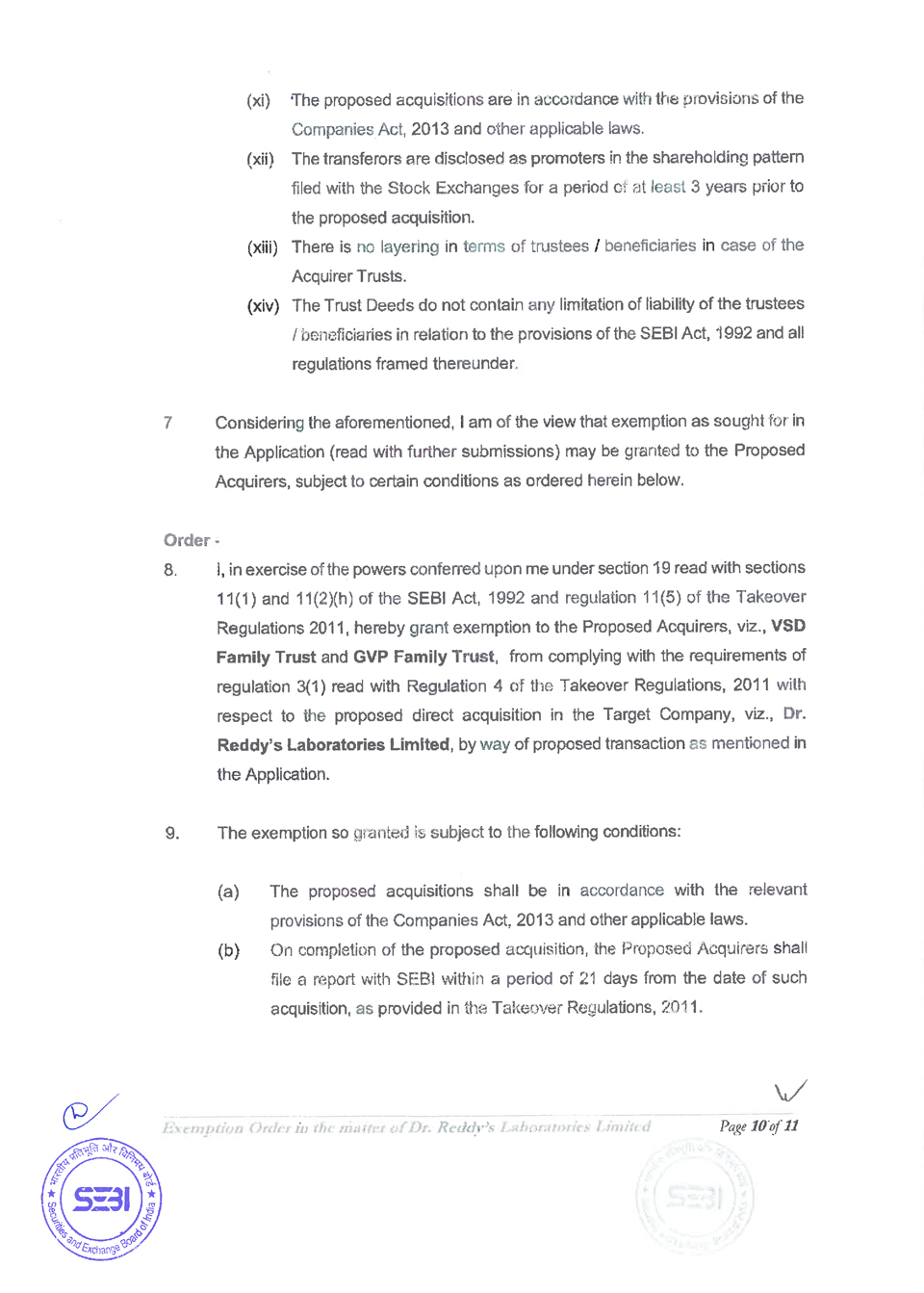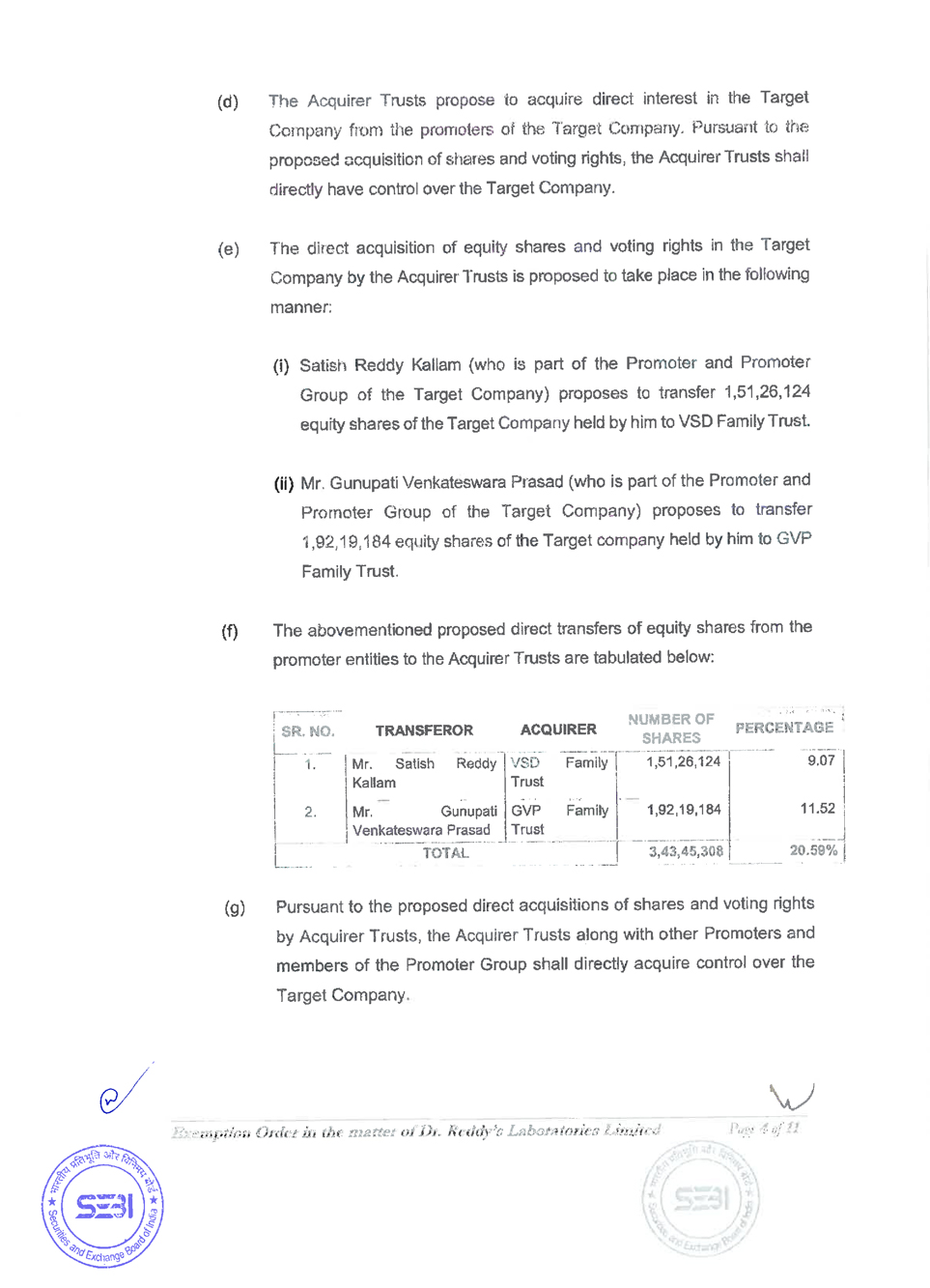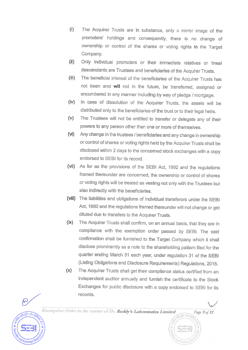 This transfer is only a private family arrangement, for smooth succession planning of the family and to streamline the family's assets and businesses. The shares have been acquired by the said Trusts from the Promoters pursuant to exemption provided in SEBI Order dated December 31, 2024 bearing reference number WTM/ASB/CFD/16/2024-25 in the matter of "Dr. Reddy’s Laboratories Limited".