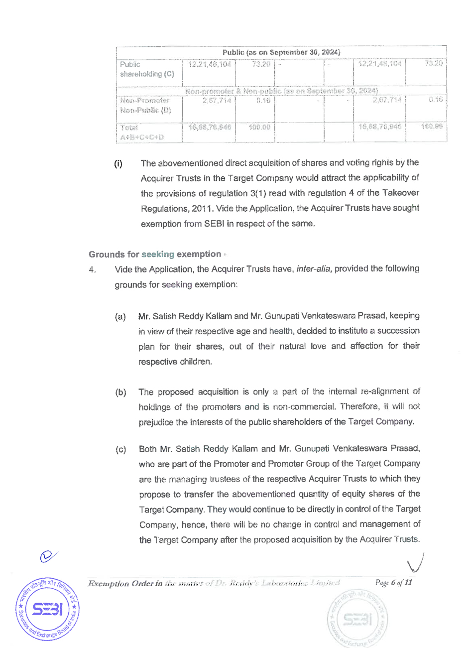 This transfer is only a private family arrangement, for smooth succession planning of the family and to streamline the family's assets and businesses. The shares have been acquired by the said Trusts from the Promoters, pursuant to exemption provided in SEBI Order dated December 31, 2024 bearing reference number WTM/ASB/CFD/16/2024-25 in the matter of "Dr. Reddy’s Laboratories Limited".