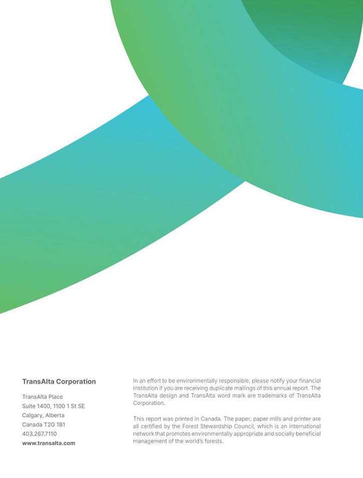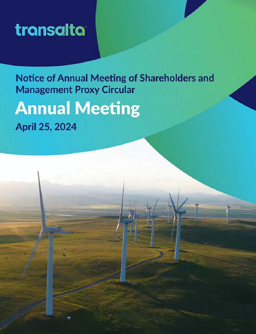 Forward-looking statements contained herein, which may prove to be incorrect, are subject to the assumptions, risks and uncertainties set forth herein and in our Management’s Discussion and Analysis for the year ended Dec. 31, 2023 ("MD&A"), and the Company’s annual information form dated as of Feb. 22, 2024 ("AIF"). Factors that may adversely impact what is expressed or implied by forward-looking statements contained in this Proxy Circular include, but are not limited to, risks relating to: fluctuations in power prices, including merchant pricing in Alberta, Ontario and Mid-Columbia; reductions in production; restricted access to capital and increased borrowing costs, including any difficulty raising debt, equity or tax equity, as applicable, on reasonable terms or at all; labour relations matters, reduced labour availability and the ability to continue to staff our operations and facilities; reliance on key personnel; our ability to obtain regulatory and any other third-party approvals on the expected timelines or at all in respect of our growth projects; risks associated with development and construction projects, including as it pertains to increased capital costs, permitting, labour and engineering risks, disputes with contractors and potential delays in the construction or commissioning of such projects; significant fluctuations in the Canadian dollar against the US dollar and Australian dollar; changes in short-term and long-term electricity supply and demand; inability to achieve our environmental, social and governance targets; the impact of the energy transition on our business; impairments and/or write downs of assets; adverse impacts on our information technology systems and our internal control systems, including cybersecurity threats; commodity risk management and energy trading risks, including the effectiveness of the Company’s risk management tools associated with hedging and trading procedures to protect against significant losses; our ability to contract our generation for prices that will provide expected returns and to replace contracts as they expire; changes to the legislative, regulatory and political environments in the jurisdictions in which we operate; environmental requirements and changes in, or liabilities under, these requirements; disruptions in the transmission and distribution of electricity; the effects of weather, including man-made or natural disasters; climate-change related risks; increases in costs; reductions to our generating units' relative efficiency or capacity factors; disruptions in the source of fuels, including natural gas, coal, water, solar or wind resources required to operate our facilities; operational risks, unplanned outages and equipment failure and our ability to carry out or have completed any repairs in a cost-effective or timely manner or at all; failure to meet financial expectations; the threat of terrorism, adverse diplomatic developments or other similar events; industry risk and competition in the business in which we operate; structural subordination of securities; public health crisis risks; inadequacy or unavailability of insurance coverage; our provision for income taxes and any risk of reassessment; and legal, regulatory and contractual disputes and proceedings involving the Company.