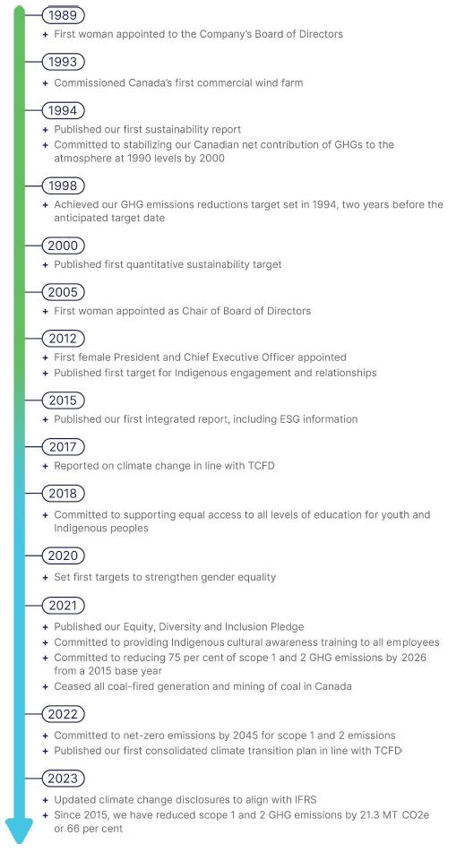 Our reporting is guided by leading ESG reporting frameworks to help inform discussion and provide context on how ESG affects our business. These include the International Sustainability Standards Board by the International Financial Reporting Standards Foundation, the International Integrated Reporting Framework, the Global Reporting Initiative and the Sustainability Accounting Standards Board requirements for electric utilities and power generators. We continue to monitor the development of sustainability and climate-related disclosure requirements to assess our future reporting, such as updates from the Canadian Securities Administrators and the US Securities and Exchange Commission.