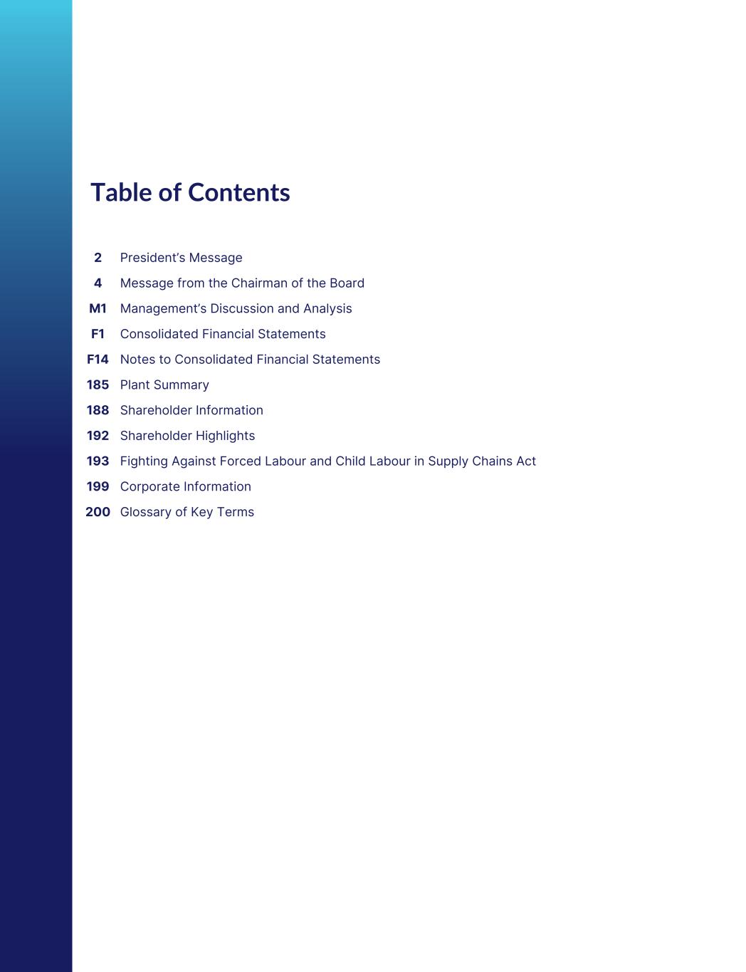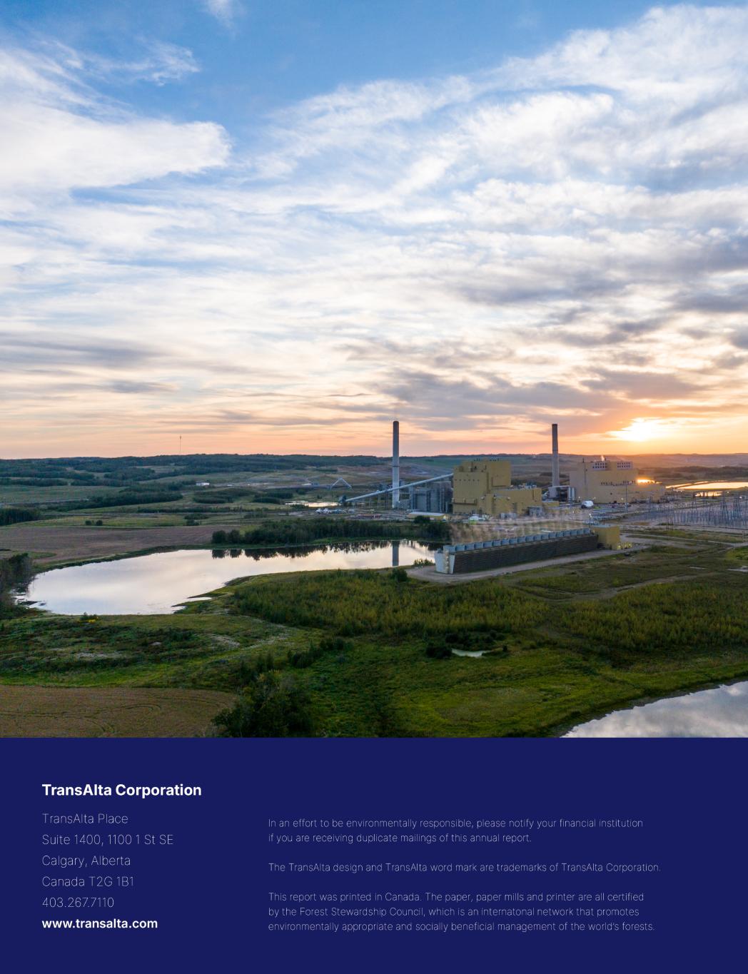 Table of Contents 2 President’s Message 4 Message from the Chairman of the Board M1 Management’s Discussion and Analysis F1 Consolidated Financial Statements F14 Notes to Consolidated Financial Statements 185 Plant Summary 188 Shareholder Information 192 Shareholder Highlights 193 Fighting Against Forced Labour and Child Labour in Supply Chains Act 199 Corporate Information 200 Glossary of Key Terms TransAlta Corporation 2025 Integrated Report 1