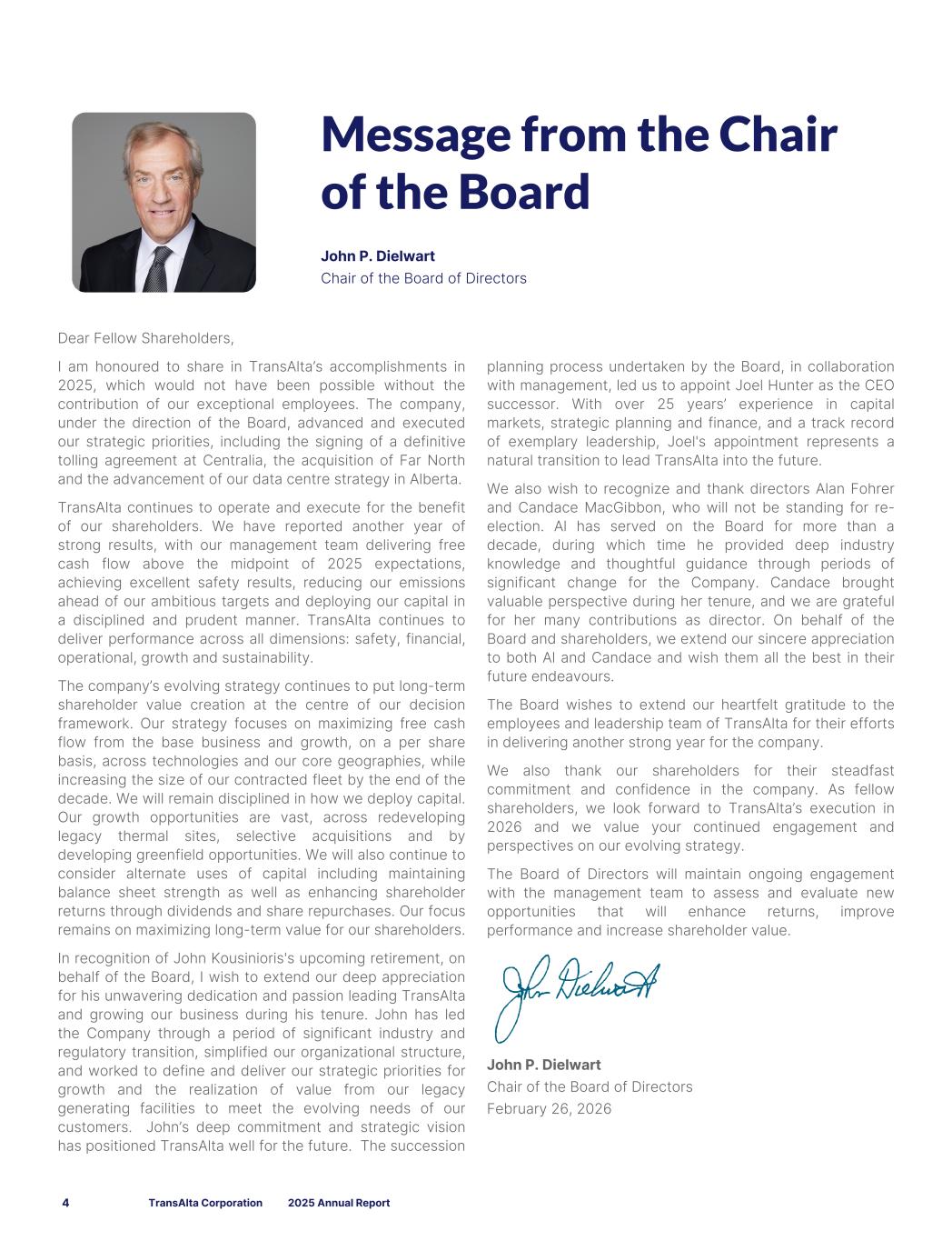 Message from the Chair of the Board John P. Dielwart Chair of the Board of Directors Dear Fellow Shareholders, I am honoured to share in TransAlta’s accomplishments in 2025, which would not have been possible without the contribution of our exceptional employees. The company, under the direction of the Board, advanced and executed our strategic priorities, including the signing of a definitive tolling agreement at Centralia, the acquisition of Far North and the advancement of our data centre strategy in Alberta. TransAlta continues to operate and execute for the benefit of our shareholders. We have reported another year of strong results, with our management team delivering free cash flow above the midpoint of 2025 expectations, achieving excellent safety results, reducing our emissions ahead of our ambitious targets and deploying our capital in a disciplined and prudent manner. TransAlta continues to deliver performance across all dimensions: safety, financial, operational, growth and sustainability. The company’s evolving strategy continues to put long-term shareholder value creation at the centre of our decision framework. Our strategy focuses on maximizing free cash flow from the base business and growth, on a per share basis, across technologies and our core geographies, while increasing the size of our contracted fleet by the end of the decade. We will remain disciplined in how we deploy capital. Our growth opportunities are vast, across redeveloping legacy thermal sites, selective acquisitions and by developing greenfield opportunities. We will also continue to consider alternate uses of capital including maintaining balance sheet strength as well as enhancing shareholder returns through dividends and share repurchases. Our focus remains on maximizing long-term value for our shareholders. In recognition of John Kousinioris's upcoming retirement, on behalf of the Board, I wish to extend our deep appreciation for his unwavering dedication and passion leading TransAlta and growing our business during his tenure. John has led the Company through a period of significant industry and regulatory transition, simplified our organizational structure, and worked to define and deliver our strategic priorities for growth and the realization of value from our legacy generating facilities to meet the evolving needs of our customers. John’s deep commitment and strategic vision has positioned TransAlta well for the future. The succession planning process undertaken by the Board, in collaboration with management, led us to appoint Joel Hunter as the CEO successor. With over 25 years’ experience in capital markets, strategic planning and finance, and a track record of exemplary leadership, Joel's appointment represents a natural transition to lead TransAlta into the future. We also wish to recognize and thank directors Alan Fohrer and Candace MacGibbon, who will not be standing for re- election. Al has served on the Board for more than a decade, during which time he provided deep industry knowledge and thoughtful guidance through periods of significant change for the Company. Candace brought valuable perspective during her tenure, and we are grateful for her many contributions as director. On behalf of the Board and shareholders, we extend our sincere appreciation to both Al and Candace and wish them all the best in their future endeavours. The Board wishes to extend our heartfelt gratitude to the employees and leadership team of TransAlta for their efforts in delivering another strong year for the company. We also thank our shareholders for their steadfast commitment and confidence in the company. As fellow shareholders, we look forward to TransAlta’s execution in 2026 and we value your continued engagement and perspectives on our evolving strategy. The Board of Directors will maintain ongoing engagement with the management team to assess and evaluate new opportunities that will enhance returns, improve performance and increase shareholder value. John P. Dielwart Chair of the Board of Directors February 26, 2026 4 TransAlta Corporation 2025 Annual Report