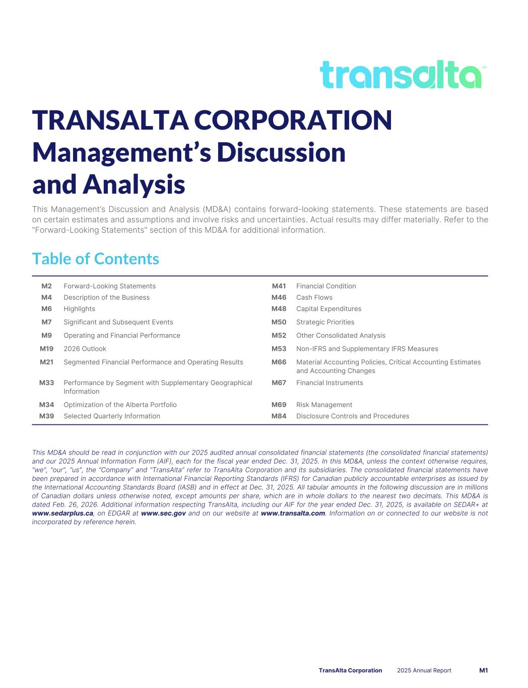 TRANSALTA CORPORATION Management’s Discussion and Analysis This Management’s Discussion and Analysis (MD&A) contains forward-looking statements. These statements are based on certain estimates and assumptions and involve risks and uncertainties. Actual results may differ materially. Refer to the "Forward-Looking Statements" section of this MD&A for additional information. Table of Contents M2 Forward-Looking Statements M41 Financial Condition M4 Description of the Business M46 Cash Flows M6 Highlights M48 Capital Expenditures M7 Significant and Subsequent Events M50 Strategic Priorities M9 Operating and Financial Performance M52 Other Consolidated Analysis M19 2026 Outlook M53 Non-IFRS and Supplementary IFRS Measures M21 Segmented Financial Performance and Operating Results M66 Material Accounting Policies, Critical Accounting Estimates and Accounting Changes M33 Performance by Segment with Supplementary Geographical Information M67 Financial Instruments M34 Optimization of the Alberta Portfolio M69 Risk Management M39 Selected Quarterly Information M84 Disclosure Controls and Procedures This MD&A should be read in conjunction with our 2025 audited annual consolidated financial statements (the consolidated financial statements) and our 2025 Annual Information Form (AIF), each for the fiscal year ended Dec. 31, 2025. In this MD&A, unless the context otherwise requires, “we”, “our”, “us”, the “Company” and “TransAlta” refer to TransAlta Corporation and its subsidiaries. The consolidated financial statements have been prepared in accordance with International Financial Reporting Standards (IFRS) for Canadian publicly accountable enterprises as issued by the International Accounting Standards Board (IASB) and in effect at Dec. 31, 2025. All tabular amounts in the following discussion are in millions of Canadian dollars unless otherwise noted, except amounts per share, which are in whole dollars to the nearest two decimals. This MD&A is dated Feb. 26, 2026. Additional information respecting TransAlta, including our AIF for the year ended Dec. 31, 2025, is available on SEDAR+ at www.sedarplus.ca, on EDGAR at www.sec.gov and on our website at www.transalta.com. Information on or connected to our website is not incorporated by reference herein. TransAlta Corporation 2025 Annual Report M1