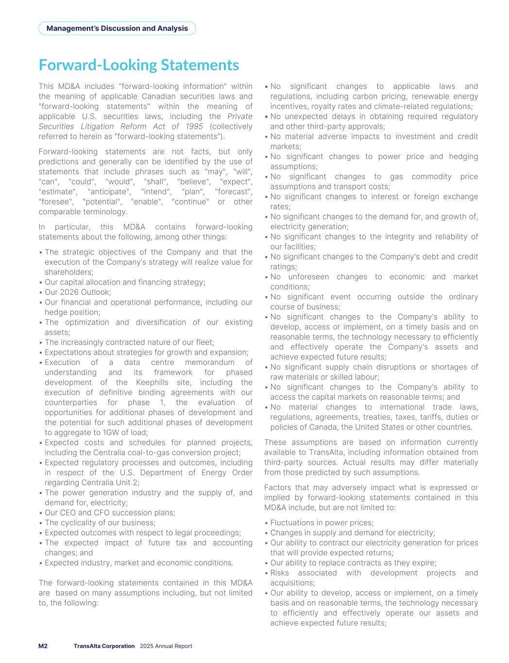 Forward-Looking Statements This MD&A includes "forward-looking information" within the meaning of applicable Canadian securities laws and "forward-looking statements" within the meaning of applicable U.S. securities laws, including the Private Securities Litigation Reform Act of 1995 (collectively referred to herein as "forward-looking statements").  Forward-looking statements are not facts, but only predictions and generally can be identified by the use of statements that include phrases such as "may", "will", "can", "could", "would", "shall", "believe", "expect", "estimate", "anticipate", "intend", "plan", "forecast", "foresee", "potential", "enable", "continue" or other comparable terminology.  In particular, this MD&A contains forward-looking statements about the following, among other things: • The strategic objectives of the Company and that the execution of the Company’s strategy will realize value for shareholders; • Our capital allocation and financing strategy; • Our 2026 Outlook; • Our financial and operational performance, including our hedge position; • The optimization and diversification of our existing assets; • The increasingly contracted nature of our fleet; • Expectations about strategies for growth and expansion; • Execution of a data centre memorandum of understanding and its framework for phased development of the Keephills site, including the execution of definitive binding agreements with our counterparties for phase 1, the evaluation of opportunities for additional phases of development and the potential for such additional phases of development to aggregate to 1GW of load; • Expected costs and schedules for planned projects, including the Centralia coal-to-gas conversion project; • Expected regulatory processes and outcomes, including in respect of the U.S. Department of Energy Order regarding Centralia Unit 2; • The power generation industry and the supply of, and demand for, electricity; • Our CEO and CFO succession plans; • The cyclicality of our business; • Expected outcomes with respect to legal proceedings; • The expected impact of future tax and accounting changes; and • Expected industry, market and economic conditions. The forward-looking statements contained in this MD&A are based on many assumptions including, but not limited to, the following: • No significant changes to applicable laws and regulations, including carbon pricing, renewable energy incentives, royalty rates and climate-related regulations; • No unexpected delays in obtaining required regulatory and other third-party approvals; • No material adverse impacts to investment and credit markets; • No significant changes to power price and hedging assumptions; • No significant changes to gas commodity price assumptions and transport costs; • No significant changes to interest or foreign exchange rates; • No significant changes to the demand for, and growth of, electricity generation; • No significant changes to the integrity and reliability of our facilities; • No significant changes to the Company's debt and credit ratings; • No unforeseen changes to economic and market conditions; • No significant event occurring outside the ordinary course of business; • No significant changes to the Company's ability to develop, access or implement, on a timely basis and on reasonable terms, the technology necessary to efficiently and effectively operate the Company's assets and achieve expected future results; • No significant supply chain disruptions or shortages of raw materials or skilled labour; • No significant changes to the Company's ability to access the capital markets on reasonable terms; and • No material changes to international trade laws, regulations, agreements, treaties, taxes, tariffs, duties or policies of Canada, the United States or other countries. These assumptions are based on information currently available to TransAlta, including information obtained from third-party sources. Actual results may differ materially from those predicted by such assumptions. Factors that may adversely impact what is expressed or implied by forward-looking statements contained in this MD&A include, but are not limited to: • Fluctuations in power prices; • Changes in supply and demand for electricity; • Our ability to contract our electricity generation for prices that will provide expected returns; • Our ability to replace contracts as they expire; • Risks associated with development projects and acquisitions; • Our ability to develop, access or implement, on a timely basis and on reasonable terms, the technology necessary to efficiently and effectively operate our assets and achieve expected future results; M2 TransAlta Corporation 2025 Annual Report