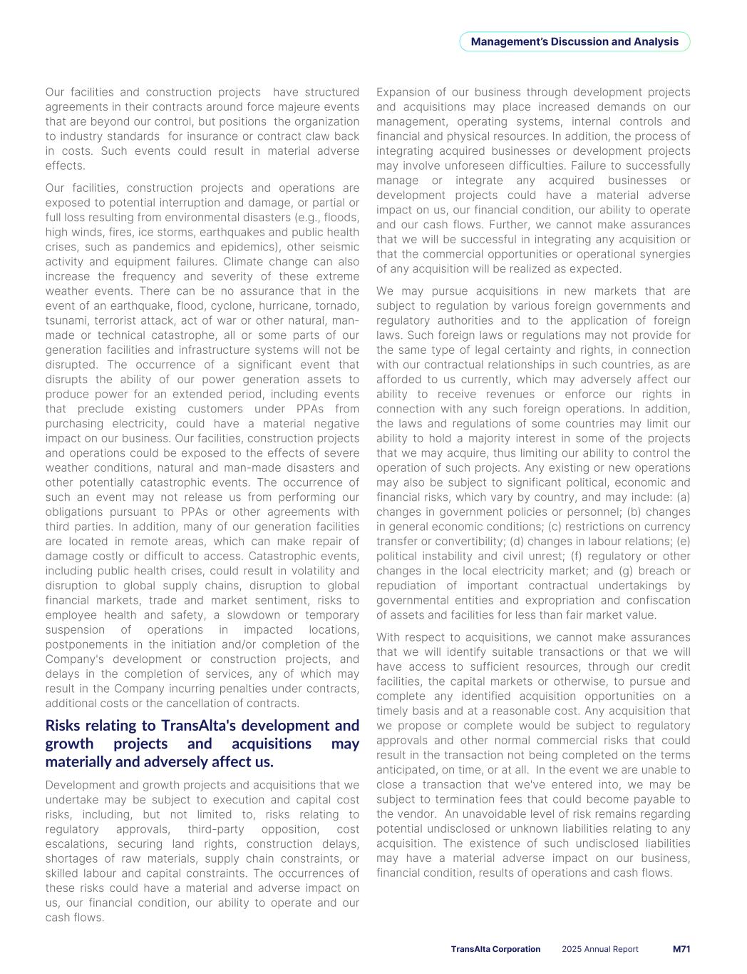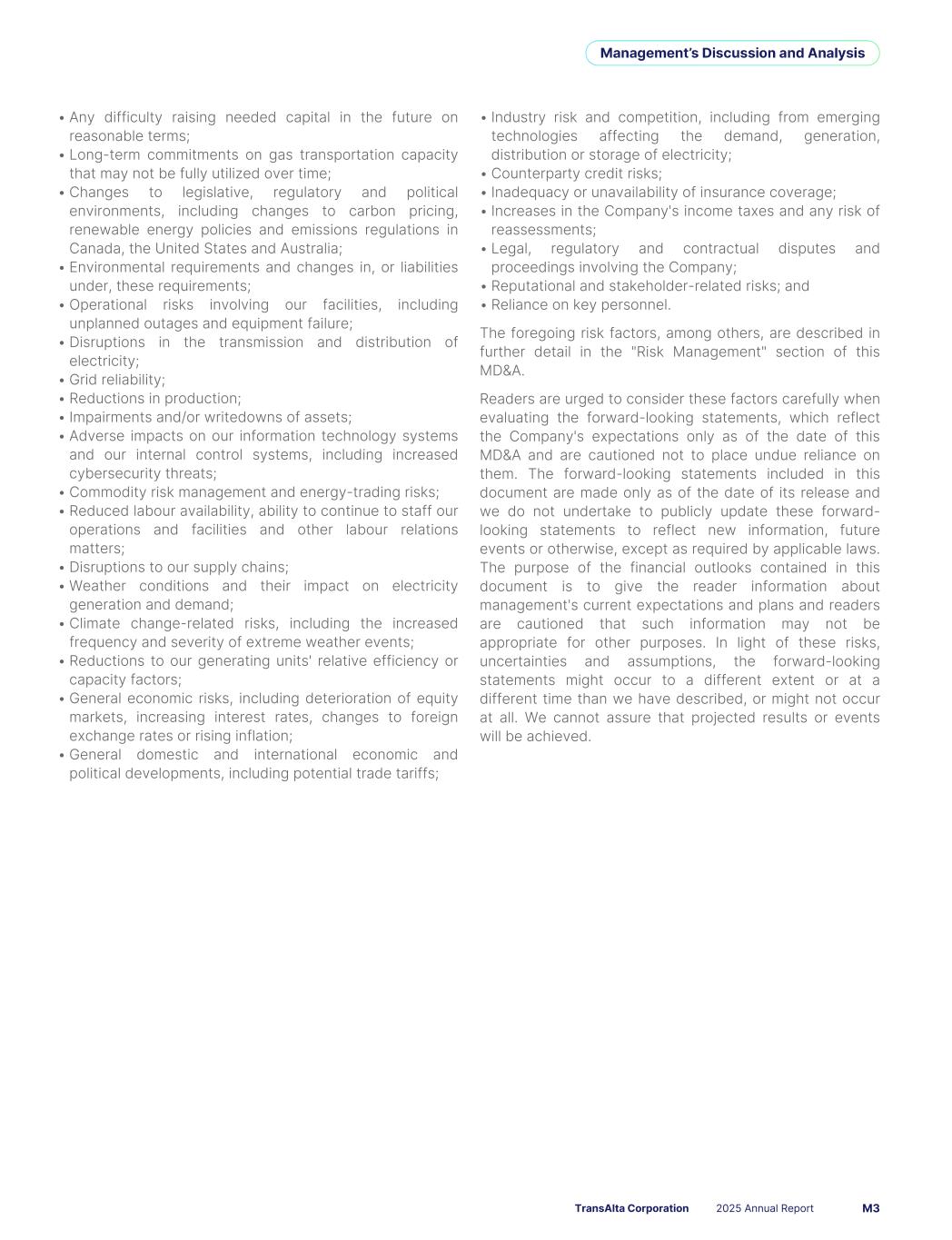 • Any difficulty raising needed capital in the future on reasonable terms; • Long-term commitments on gas transportation capacity that may not be fully utilized over time; • Changes to legislative, regulatory and political environments, including changes to carbon pricing, renewable energy policies and emissions regulations in Canada, the United States and Australia; • Environmental requirements and changes in, or liabilities under, these requirements; • Operational risks involving our facilities, including unplanned outages and equipment failure; • Disruptions in the transmission and distribution of electricity; • Grid reliability; • Reductions in production; • Impairments and/or writedowns of assets; • Adverse impacts on our information technology systems and our internal control systems, including increased cybersecurity threats; • Commodity risk management and energy-trading risks; • Reduced labour availability, ability to continue to staff our operations and facilities and other labour relations matters; • Disruptions to our supply chains; • Weather conditions and their impact on electricity generation and demand; • Climate change-related risks, including the increased frequency and severity of extreme weather events; • Reductions to our generating units' relative efficiency or capacity factors; • General economic risks, including deterioration of equity markets, increasing interest rates, changes to foreign exchange rates or rising inflation; • General domestic and international economic and political developments, including potential trade tariffs; • Industry risk and competition, including from emerging technologies affecting the demand, generation, distribution or storage of electricity; • Counterparty credit risks; • Inadequacy or unavailability of insurance coverage; • Increases in the Company's income taxes and any risk of reassessments; • Legal, regulatory and contractual disputes and proceedings involving the Company; • Reputational and stakeholder-related risks; and • Reliance on key personnel. The foregoing risk factors, among others, are described in further detail in the "Risk  Management" section of this MD&A. Readers are urged to consider these factors carefully when evaluating the forward-looking statements, which reflect the Company's expectations only as of the date of this MD&A and are cautioned not to place undue reliance on them. The forward-looking statements included in this document are made only as of the date of its release and we do not undertake to publicly update these forward- looking statements to reflect new information, future events or otherwise, except as required by applicable laws. The purpose of the financial outlooks contained in this document is to give the reader information about management's current expectations and plans and readers are cautioned that such information may not be appropriate for other purposes. In light of these risks, uncertainties and assumptions, the forward-looking statements might occur to a different extent or at a different time than we have described, or might not occur at all. We cannot assure that projected results or events will be achieved. TransAlta Corporation 2025 Annual Report M3