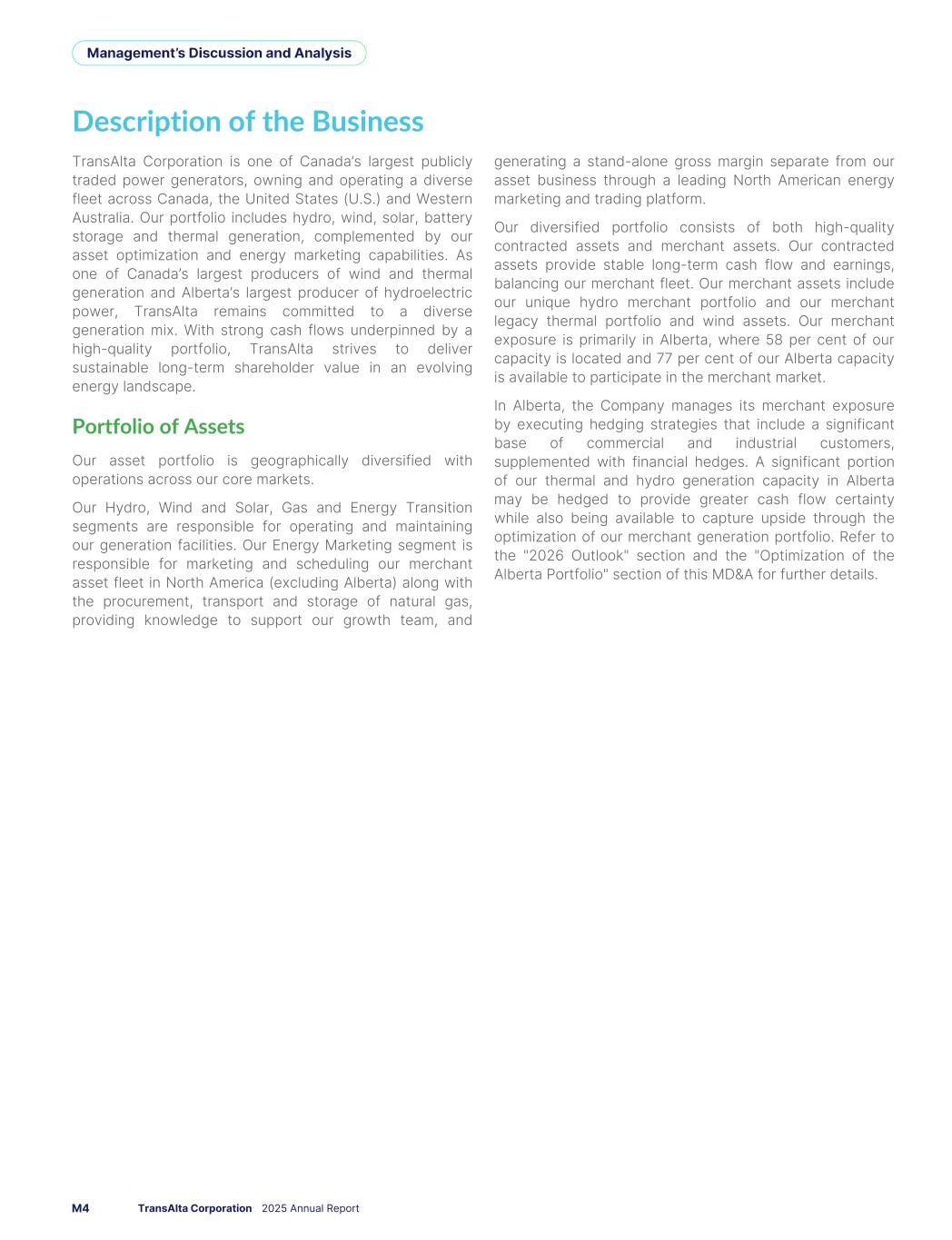 Description of the Business TransAlta Corporation is one of Canada’s largest publicly traded power generators, owning and operating a diverse fleet across Canada, the United States (U.S.) and Western Australia. Our portfolio includes hydro, wind, solar, battery storage and thermal generation, complemented by our asset optimization and energy marketing capabilities. As one of Canada’s largest producers of wind and thermal generation and Alberta’s largest producer of hydroelectric power, TransAlta remains committed to a diverse generation mix. With strong cash flows underpinned by a high-quality portfolio, TransAlta strives to deliver sustainable long-term shareholder value in an evolving energy landscape. Portfolio of Assets Our asset portfolio is geographically diversified with operations across our core markets. Our Hydro, Wind and Solar, Gas and Energy Transition segments are responsible for operating and maintaining our generation facilities. Our Energy Marketing segment is responsible for marketing and scheduling our merchant asset fleet in North America (excluding Alberta) along with the procurement, transport and storage of natural gas, providing knowledge to support our growth team, and generating a stand-alone gross margin separate from our asset business through a leading North American energy marketing and trading platform. Our diversified portfolio consists of both high-quality contracted assets and merchant assets. Our contracted assets provide stable long-term cash flow and earnings, balancing our merchant fleet. Our merchant assets include our unique hydro merchant portfolio and our merchant legacy thermal portfolio and wind assets. Our merchant exposure is primarily in Alberta, where 58 per cent of our capacity is located and 77 per cent of our Alberta capacity is available to participate in the merchant market. In Alberta, the Company manages its merchant exposure by executing hedging strategies that include a significant base of commercial and industrial customers, supplemented with financial hedges. A significant portion of our thermal and hydro generation capacity in Alberta may be hedged to provide greater cash flow  certainty while also being available to capture upside through the optimization of our merchant generation portfolio. Refer to the "2026 Outlook" section and the "Optimization of the Alberta Portfolio" section of this MD&A for further details. M4 TransAlta Corporation 2025 Annual Report