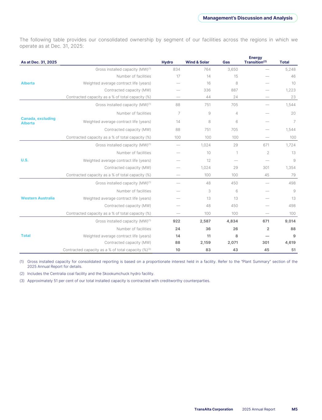 The following table provides our consolidated ownership by segment of our facilities across the regions in which we operate as at Dec. 31, 2025: Alberta Gross installed capacity (MW)(1) 834 764 3,650 — 5,248 Number of facilities 17 14 15 — 46 Weighted average contract life (years) — 16 8 — 10 Contracted capacity (MW) — 336 887 — 1,223 Contracted capacity as a % of total capacity (%) — 44 24 — 23 Canada, excluding Alberta Gross installed capacity (MW)(1) 88 751 705 — 1,544 Number of facilities 7 9 4 — 20 Weighted average contract life (years) 14 8 6 — 7 Contracted capacity (MW) 88 751 705 — 1,544 Contracted capacity as a % of total capacity (%) 100 100 100 — 100 U.S. Gross installed capacity (MW)(1) — 1,024 29 671 1,724 Number of facilities — 10 1 2 13 Weighted average contract life (years) — 12 — — 9 Contracted capacity (MW) — 1,024 29 301 1,354 Contracted capacity as a % of total capacity (%) — 100 100 45 79 Western Australia Gross installed capacity (MW)(1) — 48 450 — 498 Number of facilities — 3 6 — 9 Weighted average contract life (years) — 13 13 — 13 Contracted capacity (MW) — 48 450 — 498 Contracted capacity as a % of total capacity (%) — 100 100 — 100 Total Gross installed capacity (MW)(1) 922 2,587 4,834 671 9,014 Number of facilities 24 36 26 2 88 Weighted average contract life (years) 14 11 8 — 9 Contracted capacity (MW) 88 2,159 2,071 301 4,619 Contracted capacity as a % of total capacity (%)(3) 10 83 43 45 51 As at Dec. 31, 2025 Hydro Wind & Solar Gas Energy Transition(2) Total (1) Gross installed capacity for consolidated reporting is based on a proportionate interest held in a facility. Refer to the "Plant Summary" section of the 2025 Annual Report for details. (2) Includes the Centralia coal facility and the Skookumchuck hydro facility. (3) Approximately 51 per cent of our total installed capacity is contracted with creditworthy counterparties. TransAlta Corporation 2025 Annual Report M5