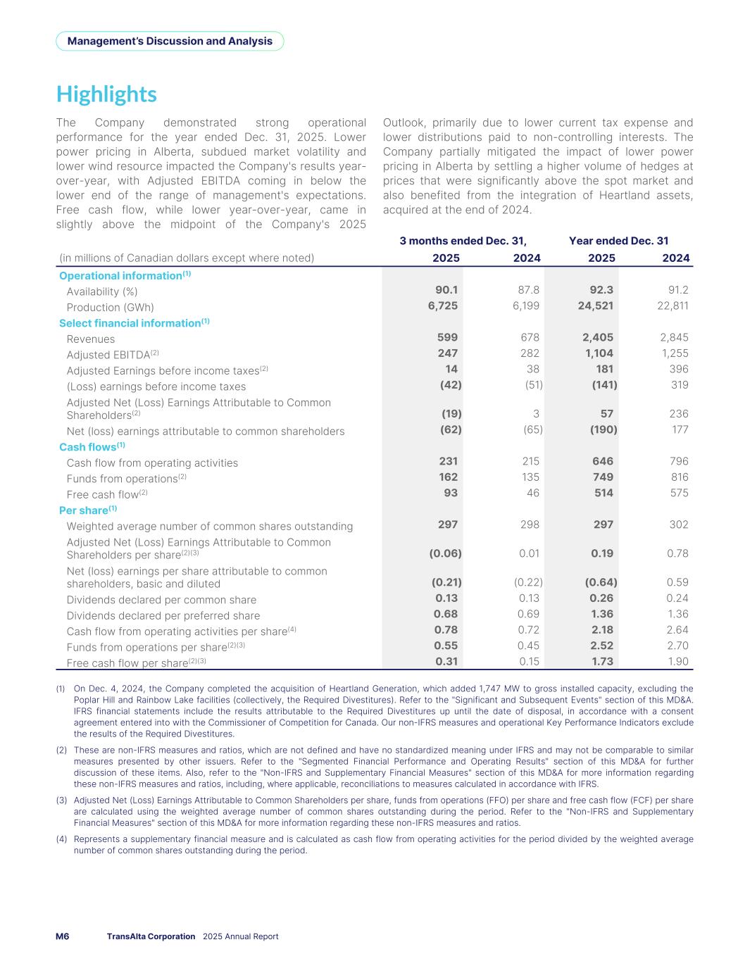Highlights The Company demonstrated strong operational performance for the year ended Dec. 31, 2025. Lower power pricing in Alberta, subdued market volatility and lower wind resource impacted the Company's results year- over-year, with Adjusted EBITDA coming in below the lower end of the range of management's expectations. Free cash flow, while lower year-over-year, came in slightly above the midpoint of the Company's 2025 Outlook, primarily due to lower current tax expense and lower distributions paid to non-controlling interests. The Company partially mitigated the impact of lower power pricing in Alberta by settling a higher volume of hedges at prices that were significantly above the spot market and also benefited from the integration of Heartland assets, acquired at the end of 2024. 3 months ended Dec. 31, Year ended Dec. 31 (in millions of Canadian dollars except where noted) 2025 2024 2025 2024 Operational information(1) Availability (%) 90.1 87.8 92.3 91.2 Production (GWh) 6,725 6,199 24,521 22,811 Select financial information(1) Revenues 599 678 2,405 2,845 Adjusted EBITDA(2) 247 282 1,104 1,255 Adjusted Earnings before income taxes(2) 14 38 181 396 (Loss) earnings before income taxes (42) (51) (141) 319 Adjusted Net (Loss) Earnings Attributable to Common Shareholders(2) (19) 3 57 236 Net (loss) earnings attributable to common shareholders (62) (65) (190) 177 Cash flows(1) Cash flow from operating activities 231 215 646 796 Funds from operations(2) 162 135 749 816 Free cash flow(2) 93 46 514 575 Per share(1) Weighted average number of common shares outstanding 297 298 297 302 Adjusted Net (Loss) Earnings Attributable to Common Shareholders per share(2)(3) (0.06) 0.01 0.19 0.78 Net (loss) earnings per share attributable to common shareholders, basic and diluted (0.21) (0.22) (0.64) 0.59 Dividends declared per common share 0.13 0.13 0.26 0.24 Dividends declared per preferred share 0.68 0.69 1.36 1.36 Cash flow from operating activities per share(4) 0.78 0.72 2.18 2.64 Funds from operations per share(2)(3) 0.55 0.45 2.52 2.70 Free cash flow per share(2)(3) 0.31 0.15 1.73 1.90 (1) On Dec. 4, 2024, the Company completed the acquisition of Heartland Generation, which added 1,747 MW to gross installed capacity, excluding the Poplar Hill and Rainbow Lake facilities (collectively, the Required Divestitures). Refer to the "Significant and Subsequent Events" section of this MD&A. IFRS financial statements include the results attributable to the Required Divestitures up until the date of disposal, in accordance with a consent agreement entered into with the Commissioner of Competition for Canada. Our non-IFRS measures and operational Key Performance Indicators exclude the results of the Required Divestitures. (2) These are non-IFRS measures and ratios, which are not defined and have no standardized meaning under IFRS and may not be comparable to similar measures presented by other issuers. Refer to the "Segmented Financial Performance and Operating Results" section of this MD&A for further discussion of these items. Also, refer to the "Non-IFRS and Supplementary Financial Measures" section of this MD&A for more information regarding these non-IFRS measures and ratios, including, where applicable, reconciliations to measures calculated in accordance with IFRS. (3) Adjusted Net (Loss) Earnings Attributable to Common Shareholders per share, funds from operations (FFO) per share and free cash flow (FCF) per share are calculated using the weighted average number of common shares  outstanding during the period. Refer to the "Non-IFRS and Supplementary Financial Measures" section of this MD&A for more information regarding these non-IFRS measures and ratios. (4) Represents a supplementary financial measure and is calculated as cash flow from operating activities for the period divided by the weighted average number of common shares outstanding during the period. M6 TransAlta Corporation 2025 Annual Report