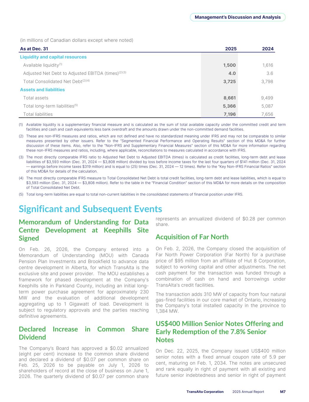 (in millions of Canadian dollars except where noted) As at Dec. 31 2025 2024 Liquidity and capital resources Available liquidity(1) 1,500 1,616 Adjusted Net Debt to Adjusted EBITDA (times)(2)(3) 4.0 3.6 Total Consolidated Net Debt(2)(4) 3,725 3,798 Assets and liabilities Total assets 8,661 9,499 Total long-term liabilities(5) 5,366 5,087 Total liabilities 7,196 7,656 (1) Available liquidity is a supplementary financial measure and is calculated as the sum of total available capacity under the committed credit and term facilities and cash and cash equivalents less bank overdraft and the amounts drawn under the non-committed demand facilities. (2) These are non-IFRS measures and ratios, which are not defined and have no standardized meaning under IFRS and may not be comparable to similar measures presented by other issuers. Refer to the "Segmented Financial Performance and Operating Results" section of this MD&A for further discussion of these items. Also, refer to the "Non-IFRS and Supplementary Financial Measures" section of this MD&A for more information regarding these non-IFRS measures and ratios, including, where applicable, reconciliations to measures calculated in accordance with IFRS. (3) The most directly comparable IFRS ratio to Adjusted Net Debt to Adjusted EBITDA (times) is calculated as credit facilities, long-term debt and lease liabilities of $3,593 million (Dec. 31, 2024 — $3,808 million) divided by loss before income taxes for the last four quarters of $141 million (Dec. 31, 2024 — earnings before income taxes $319 million) and is equal to (25) times (Dec. 31, 2024 — 12 times). Refer to the "Key Non-IFRS Financial Ratios" section of this MD&A for details of the calculation. (4) The most directly comparable IFRS measure to Total Consolidated Net Debt is total credit facilities, long-term debt and lease liabilities, which is equal to $3,593 million (Dec. 31, 2024 — $3,808 million). Refer to the table in the "Financial Condition" section of this MD&A for more details on the composition of Total Consolidated Net Debt. (5) Total long-term liabilities are equal to total non-current liabilities in the consolidated statements of financial position under IFRS. Significant and Subsequent Events Memorandum of Understanding for Data Centre Development at Keephills Site Signed On Feb. 26, 2026, the Company entered into a Memorandum of Understanding (MOU) with Canada Pension Plan Investments and Brookfield to advance data centre development in Alberta, for which TransAlta is the exclusive site and power provider. The MOU establishes a framework for phased development at the Company's Keephills site in Parkland County, including an initial long- term power purchase agreement for approximately 230 MW and the evaluation of additional development aggregating up to 1 Gigawatt of load. Development is subject to regulatory approvals and the parties reaching definitive agreements. Declared Increase in Common Share Dividend The Company’s Board has approved a $0.02 annualized (eight per cent) increase to the common share dividend and declared a dividend of $0.07 per common share on Feb. 25, 2026 to be payable on July 1, 2026 to shareholders of record at the close of business on June 1, 2026. The quarterly dividend of $0.07 per common share represents an annualized dividend of $0.28 per common share. Acquisition of Far North On Feb. 2, 2026, the Company closed the acquisition of Far North Power Corporation (Far North) for a purchase price of $95 million from an affiliate of Hut 8 Corporation, subject to working capital and other adjustments. The net cash payment for the transaction was funded through a combination of cash on hand and borrowings under TransAlta's credit facilities. The transaction adds 310 MW of capacity from four natural gas-fired facilities in our core market of Ontario, increasing the Company's total installed capacity in the province to 1,384 MW. US$400 Million Senior Notes Offering and Early Redemption of the 7.8% Senior Notes On Dec. 22, 2025, the Company issued US$400 million senior notes with a fixed annual coupon rate of 5.9 per cent, maturing on Feb. 1, 2034. The notes are unsecured and rank equally in right of payment with all existing and future senior indebtedness and senior in right of payment TransAlta Corporation 2025 Annual Report M7