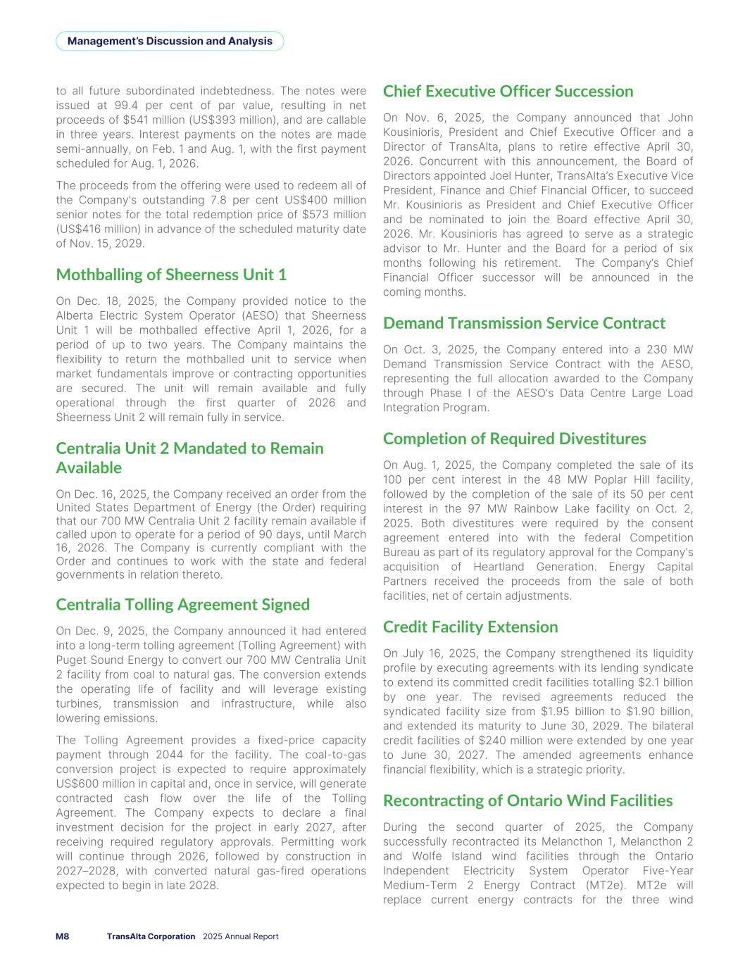 to all future subordinated indebtedness. The notes were issued at 99.4 per cent of par value, resulting in net proceeds of $541 million (US$393 million), and are callable in three years. Interest payments on the notes are made semi-annually, on Feb. 1 and Aug. 1, with the first payment scheduled for Aug. 1, 2026. The proceeds from the offering were used to redeem all of the Company's outstanding 7.8 per cent US$400 million senior notes for the total redemption price of $573 million (US$416 million) in advance of the scheduled maturity date of Nov. 15, 2029. Mothballing of Sheerness Unit 1 On Dec. 18, 2025, the Company provided notice to the Alberta Electric System Operator (AESO) that Sheerness Unit 1 will be mothballed effective April 1, 2026, for a period of up to two years. The Company maintains the flexibility to return the mothballed unit to service when market fundamentals improve or contracting opportunities are secured. The unit will remain available and fully operational through the first quarter of 2026 and Sheerness Unit 2 will remain fully in service. Centralia Unit 2 Mandated to Remain Available On Dec. 16, 2025, the Company received an order from the United States Department of Energy (the Order) requiring that our 700 MW Centralia Unit 2 facility remain available if called upon to operate for a period of 90 days, until March 16, 2026. The Company is currently compliant with the Order and continues to work with the state and federal governments in relation thereto. Centralia Tolling Agreement Signed On Dec. 9, 2025, the Company announced it had entered into a long-term tolling agreement (Tolling Agreement) with Puget Sound Energy to convert our 700 MW Centralia Unit 2 facility from coal to natural gas. The conversion extends the operating life of facility and will leverage existing turbines, transmission and infrastructure, while also lowering emissions. The Tolling Agreement provides a fixed-price capacity payment through 2044 for the facility. The coal-to-gas conversion project is expected to require approximately US$600 million in capital and, once in service, will generate contracted cash flow over the life of the Tolling Agreement. The Company expects to declare a final investment decision for the project in early 2027, after receiving required regulatory approvals. Permitting work will continue through 2026, followed by construction in 2027–2028, with converted natural gas-fired operations expected to begin in late 2028. Chief Executive Officer Succession On Nov. 6, 2025, the Company announced that John Kousinioris, President and Chief Executive Officer and a Director of TransAlta, plans to retire effective April 30, 2026. Concurrent with this announcement, the Board of Directors appointed Joel Hunter, TransAlta’s Executive Vice President, Finance and Chief Financial Officer, to succeed Mr. Kousinioris as President and Chief Executive Officer and be nominated to join the Board effective April 30, 2026. Mr. Kousinioris has agreed to serve as a strategic advisor to Mr. Hunter and the Board for a period of six months following his retirement. The Company’s Chief Financial Officer successor will be announced in the coming months. Demand Transmission Service Contract On Oct. 3, 2025, the Company entered into a 230 MW Demand Transmission Service Contract with the AESO, representing the full allocation awarded to the Company through Phase I of the AESO's Data Centre Large Load Integration Program. Completion of Required Divestitures On Aug. 1, 2025, the Company completed the sale of its 100 per cent interest in the 48 MW Poplar Hill facility, followed by the completion of the sale of its 50 per cent interest in the 97 MW Rainbow Lake facility on Oct. 2, 2025. Both divestitures were required by the consent agreement entered into with the federal Competition Bureau as part of its regulatory approval for the Company's acquisition of Heartland Generation. Energy Capital Partners received the proceeds from the sale of both facilities, net of certain adjustments. Credit Facility Extension On July 16, 2025, the Company strengthened its liquidity profile by executing agreements with its lending syndicate to extend its committed credit facilities totalling $2.1 billion by one year. The revised agreements reduced the syndicated facility size from $1.95 billion to $1.90 billion, and extended its maturity to June 30, 2029. The bilateral credit facilities of $240 million were extended by one year to June 30, 2027. The amended agreements enhance financial flexibility, which is a strategic priority. Recontracting of Ontario Wind Facilities During the second quarter of 2025, the Company successfully recontracted its Melancthon 1, Melancthon 2 and Wolfe Island wind facilities through the Ontario Independent Electricity System Operator Five-Year Medium-Term 2 Energy Contract (MT2e). MT2e will replace current energy contracts for the three wind M8 TransAlta Corporation 2025 Annual Report