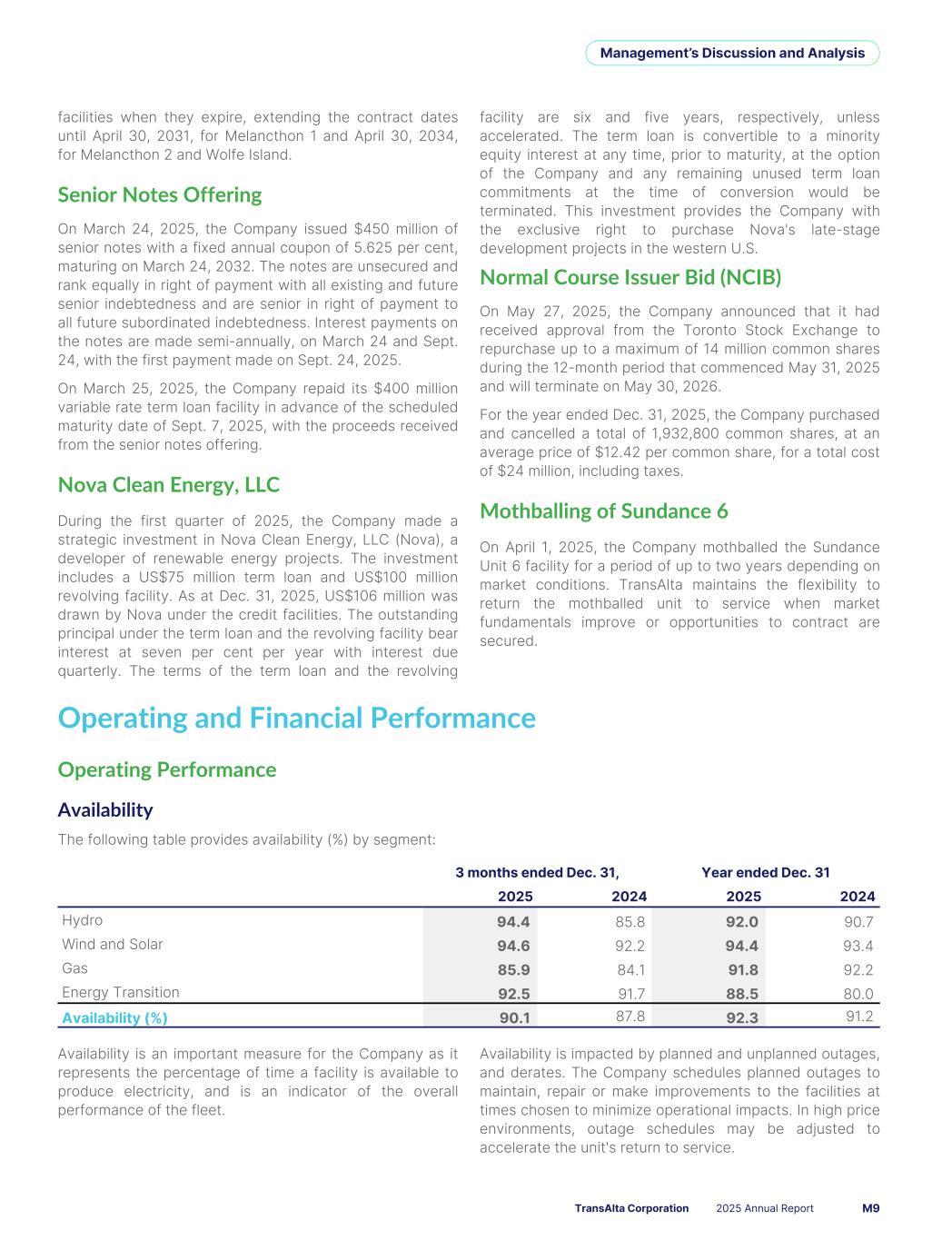 facilities when they expire, extending the contract dates until April 30, 2031, for Melancthon 1 and April 30, 2034, for Melancthon 2 and Wolfe Island. Senior Notes Offering On March 24, 2025, the Company issued $450 million of senior notes with a fixed annual coupon of 5.625 per cent, maturing on March 24, 2032. The notes are unsecured and rank equally in right of payment with all existing and future senior indebtedness and are senior in right of payment to all future subordinated indebtedness. Interest payments on the notes are made semi-annually, on March 24 and Sept. 24, with the first payment made on Sept. 24, 2025. On March 25, 2025, the Company repaid its $400 million variable rate term loan facility in advance of the scheduled maturity date of Sept. 7, 2025, with the proceeds received from the senior notes offering. Nova Clean Energy, LLC During the first quarter of 2025, the Company made a strategic investment in Nova Clean Energy, LLC (Nova), a developer of renewable energy projects. The investment includes a US$75 million term loan and US$100 million revolving facility. As at Dec. 31, 2025, US$106 million was drawn by Nova under the credit facilities. The outstanding principal under the term loan and the revolving facility bear interest at seven per cent per year with interest due quarterly. The terms of the term loan and the revolving facility are six and five years, respectively, unless accelerated. The term loan is convertible to a minority equity interest at any time, prior to maturity, at the option of the Company and any remaining unused term loan commitments at the time of conversion would be terminated. This investment provides the Company with the exclusive right to purchase Nova's late-stage development projects in the western U.S. Normal Course Issuer Bid (NCIB) On May 27, 2025, the Company announced that it had received approval from the Toronto Stock Exchange to repurchase up to a maximum of 14 million common shares during the 12-month period that commenced May 31, 2025 and will terminate on May 30, 2026. For the year ended Dec. 31, 2025, the Company purchased and cancelled a total of 1,932,800 common shares, at an average price of $12.42 per common share, for a total cost of $24 million, including taxes. Mothballing of Sundance 6 On April 1, 2025, the Company mothballed the Sundance Unit 6 facility for a period of up to two years depending on market conditions. TransAlta maintains the flexibility to return the mothballed unit to service when market fundamentals improve or opportunities to contract are secured. Operating and Financial Performance Operating Performance Availability The following table provides availability (%) by segment: 3 months ended Dec. 31, Year ended Dec. 31 2025 2024 2025 2024 Hydro 94.4 85.8 92.0 90.7 Wind and Solar 94.6 92.2 94.4 93.4 Gas 85.9 84.1 91.8 92.2 Energy Transition 92.5 91.7 88.5 80.0 Availability (%) 90.1 87.8 92.3 91.2 Availability is an important measure for the Company as it represents the percentage of time a facility is available to produce electricity, and is an indicator of the overall performance of the fleet. Availability is impacted by planned and unplanned outages, and derates. The Company schedules planned outages to maintain, repair or make improvements to the facilities at times chosen to minimize operational impacts. In high price environments, outage schedules may be adjusted to accelerate the unit's return to service. TransAlta Corporation 2025 Annual Report M9