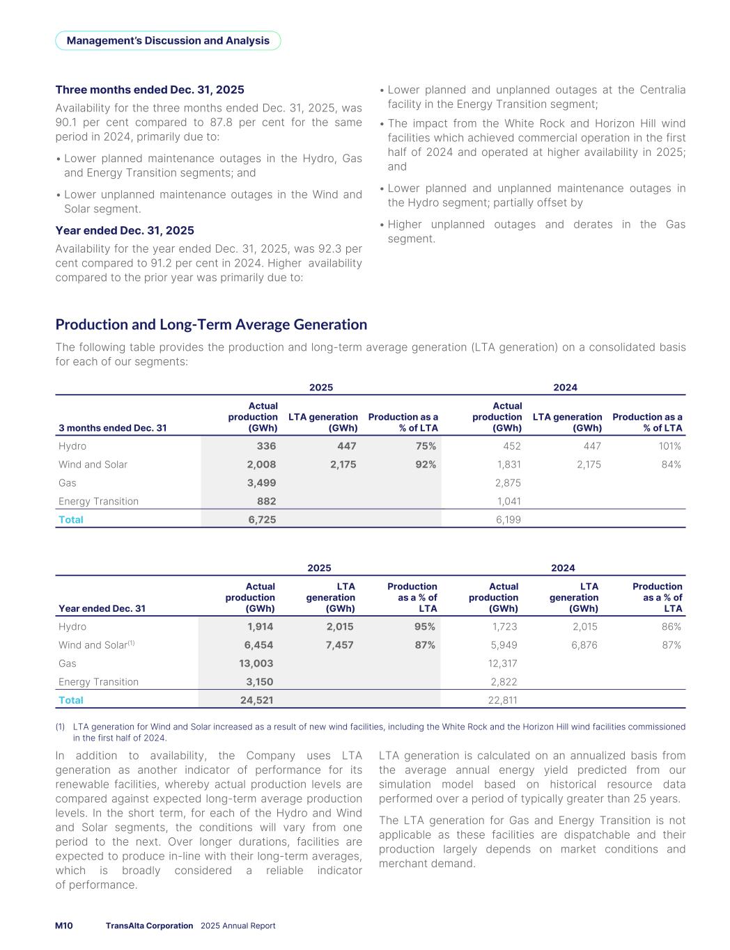 Three months ended Dec. 31, 2025 Availability for the three months ended Dec. 31, 2025, was 90.1 per cent compared to 87.8 per cent for the same period in 2024, primarily due to: • Lower planned maintenance outages in the Hydro, Gas and Energy Transition segments; and • Lower unplanned maintenance outages in the Wind and Solar segment. Year ended Dec. 31, 2025 Availability for the year ended Dec. 31, 2025, was 92.3 per cent compared to 91.2 per cent in 2024. Higher availability compared to the prior year was primarily due to: • Lower planned and unplanned outages at the Centralia facility in the Energy Transition segment; • The impact from the White Rock and Horizon Hill wind facilities which achieved commercial operation in the first half of 2024 and operated at higher availability in 2025; and • Lower planned and unplanned maintenance outages in the Hydro segment; partially offset by • Higher unplanned outages and derates in the Gas segment. Production and Long-Term Average Generation The following table provides the production and long-term average generation (LTA generation) on a consolidated basis for each of our segments: 2025 2024 3 months ended Dec. 31 Actual production (GWh) LTA generation (GWh) Production as a % of LTA Actual production (GWh) LTA generation (GWh) Production as a % of LTA Hydro 336 447 75% 452 447 101% Wind and Solar 2,008 2,175 92% 1,831 2,175 84% Gas 3,499 2,875 Energy Transition 882 1,041 Total 6,725 6,199 2025 2024 Year ended Dec. 31 Actual production (GWh) LTA generation (GWh) Production as a % of LTA Actual production (GWh) LTA generation (GWh) Production as a % of LTA Hydro 1,914 2,015 95% 1,723 2,015 86% Wind and Solar(1) 6,454 7,457 87% 5,949 6,876 87% Gas 13,003 12,317 Energy Transition 3,150 2,822 Total 24,521 22,811 (1) LTA generation for Wind and Solar increased as a result of new wind facilities, including the White Rock and the Horizon Hill wind facilities commissioned in the first half of 2024. In addition to availability, the Company uses LTA generation as another indicator of performance for its renewable facilities, whereby actual production levels are compared against expected long-term average production levels. In the short term, for each of the Hydro and Wind and Solar segments, the conditions will vary from one period to the next. Over longer durations, facilities are expected to produce in-line with their long-term averages, which is broadly considered a reliable indicator of performance. LTA generation is calculated on an annualized basis from the average annual energy yield predicted from our simulation model based on historical resource data performed over a period of typically greater than 25 years. The LTA generation for Gas and Energy Transition is not applicable as these facilities are dispatchable and their production largely depends on market conditions and merchant demand. M10 TransAlta Corporation 2025 Annual Report