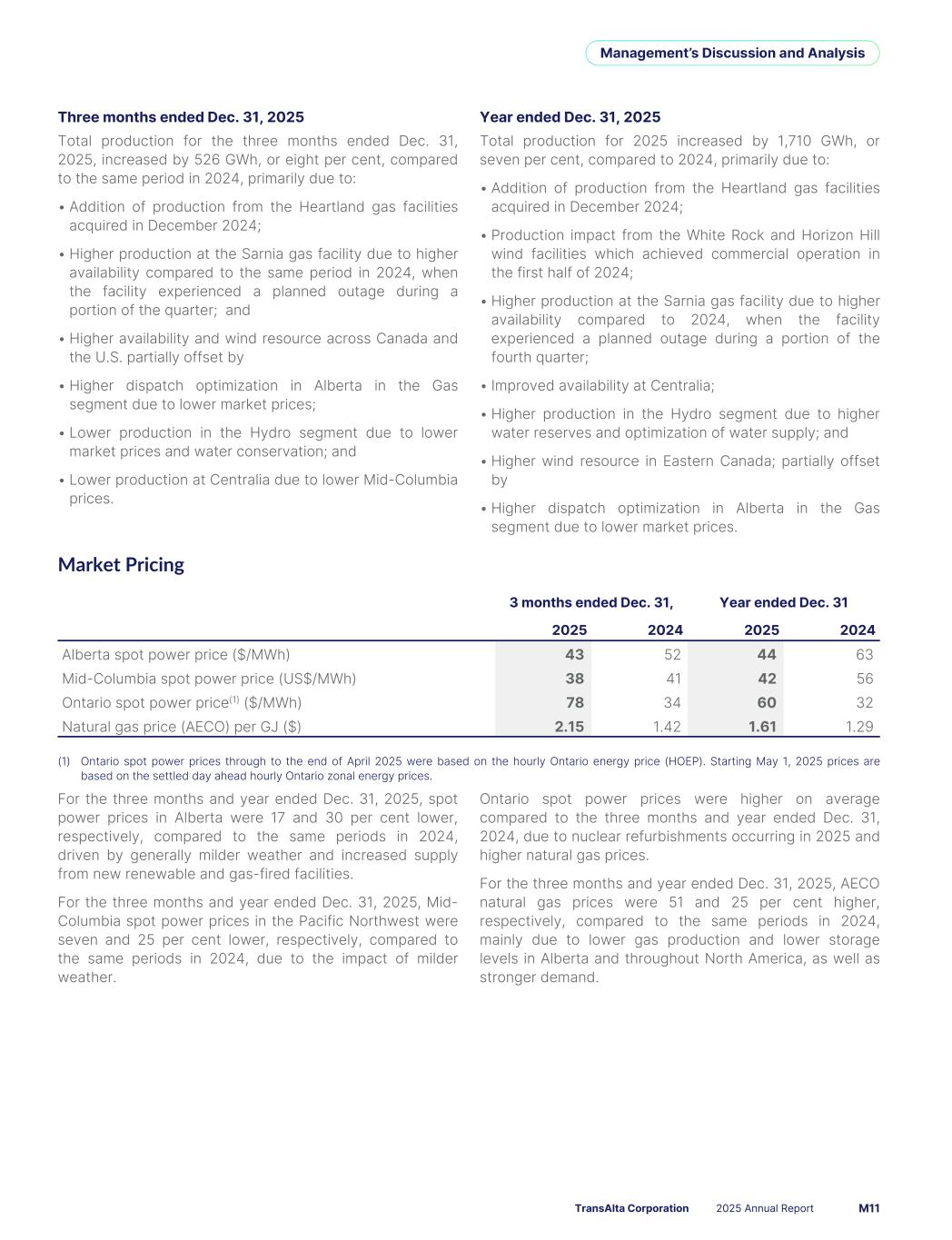 Three months ended Dec. 31, 2025 Total production for the three months ended Dec. 31, 2025, increased by 526 GWh, or eight per cent, compared to the same period in 2024, primarily due to: • Addition of production from the Heartland gas facilities acquired in December 2024; • Higher production at the Sarnia gas facility due to higher availability compared to the same period in 2024, when the facility experienced a planned outage during a portion of the quarter; and • Higher availability and wind resource across Canada and the U.S. partially offset by • Higher dispatch optimization in Alberta in the Gas segment due to lower market prices; • Lower production in the Hydro segment due to lower market prices and water conservation; and • Lower production at Centralia due to lower Mid-Columbia prices. Year ended Dec. 31, 2025 Total production for 2025 increased by 1,710 GWh, or seven per cent, compared to 2024, primarily due to: • Addition of production from the Heartland gas facilities acquired in December 2024; • Production impact from the White Rock and Horizon Hill wind facilities which achieved commercial operation in the first half of 2024; • Higher production at the Sarnia gas facility due to higher availability compared to 2024, when the facility experienced a planned outage during a portion of the fourth quarter; • Improved availability at Centralia; • Higher production in the Hydro segment due to higher water reserves and optimization of water supply; and • Higher wind resource in Eastern Canada; partially offset by • Higher dispatch optimization in Alberta in the Gas segment due to lower market prices. Market Pricing 3 months ended Dec. 31, Year ended Dec. 31 2025 2024 2025 2024 Alberta spot power price ($/MWh) 43 52 44 63 Mid-Columbia spot power price (US$/MWh) 38 41 42 56 Ontario spot power price(1) ($/MWh) 78 34 60 32 Natural gas price (AECO) per GJ ($) 2.15 1.42 1.61 1.29 (1) Ontario spot power prices through to the end of April 2025 were based on the hourly Ontario energy price (HOEP). Starting May 1, 2025 prices are based on the settled day ahead hourly Ontario zonal energy prices. For the three months and year ended Dec. 31, 2025, spot power prices in Alberta were 17 and 30 per cent lower, respectively, compared to the same periods in 2024, driven by generally milder weather and increased supply from new renewable and gas-fired facilities. For the three months and year ended Dec. 31, 2025, Mid- Columbia spot power prices in the Pacific Northwest were seven and 25 per cent lower, respectively, compared to the same periods in 2024, due to the impact of milder weather. Ontario spot power prices were higher on average compared to the three months and year ended Dec. 31, 2024, due to nuclear refurbishments occurring in 2025 and higher natural gas prices. For the three months and year ended Dec. 31, 2025, AECO natural gas prices were 51 and 25 per cent higher, respectively, compared to the same periods in 2024, mainly due to lower gas production and lower storage levels in Alberta and throughout North America, as well as stronger demand. TransAlta Corporation 2025 Annual Report M11