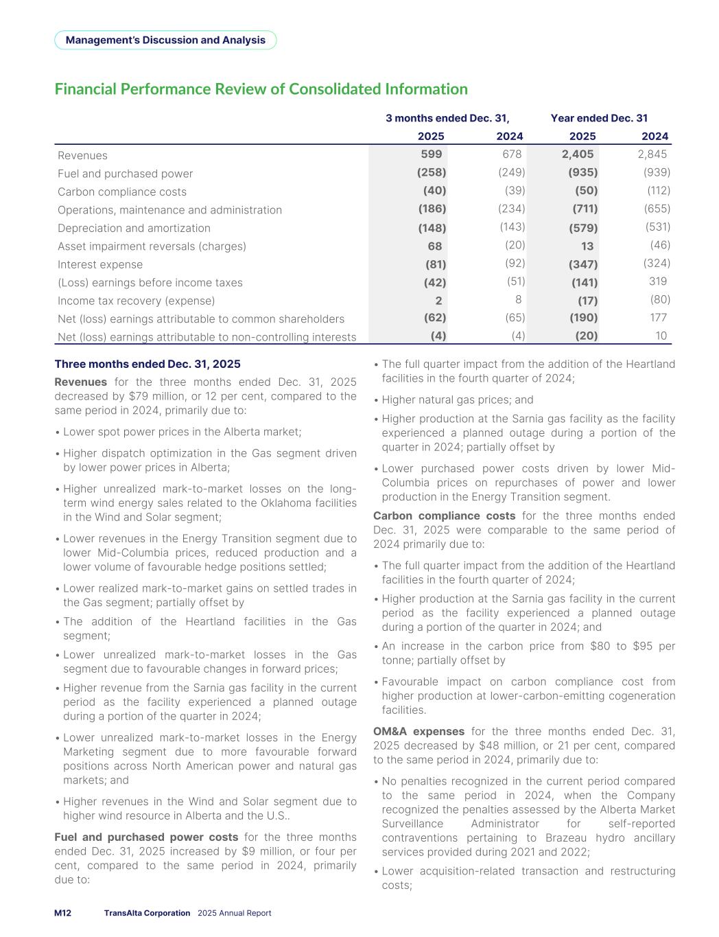 Financial Performance Review of Consolidated Information 3 months ended Dec. 31, Year ended Dec. 31 2025 2024 2025 2024 Revenues 599 678 2,405 2,845 Fuel and purchased power (258) (249) (935) (939) Carbon compliance costs (40) (39) (50) (112) Operations, maintenance and administration (186) (234) (711) (655) Depreciation and amortization (148) (143) (579) (531) Asset impairment reversals (charges) 68 (20) 13 (46) Interest expense (81) (92) (347) (324) (Loss) earnings before income taxes (42) (51) (141) 319 Income tax recovery (expense) 2 8 (17) (80) Net (loss) earnings attributable to common shareholders (62) (65) (190) 177 Net (loss) earnings attributable to non-controlling interests (4) (4) (20) 10 Three months ended Dec. 31, 2025 Revenues for the three months ended Dec. 31, 2025 decreased by $79 million, or 12 per cent, compared to the same period in 2024, primarily due to: • Lower spot power prices in the Alberta market; • Higher dispatch optimization in the Gas segment driven by lower power prices in Alberta; • Higher unrealized mark-to-market losses on the long- term wind energy sales related to the Oklahoma facilities in the Wind and Solar segment; • Lower revenues in the Energy Transition segment due to lower Mid-Columbia prices, reduced production and a lower volume of favourable hedge positions settled; • Lower realized mark-to-market gains on settled trades in the Gas segment; partially offset by • The addition of the Heartland facilities in the Gas segment; • Lower unrealized mark-to-market losses in the Gas segment due to favourable changes in forward prices; • Higher revenue from the Sarnia gas facility in the current period as the facility experienced a planned outage during a portion of the quarter in 2024; • Lower unrealized mark-to-market losses in the Energy Marketing segment due to more favourable forward positions across North American power and natural gas markets; and • Higher revenues in the Wind and Solar segment due to higher wind resource in Alberta and the U.S.. Fuel and purchased power costs for the three months ended Dec. 31, 2025 increased by $9 million, or four per cent, compared to the same period in 2024, primarily due to: • The full quarter impact from the addition of the Heartland facilities in the fourth quarter of 2024; • Higher natural gas prices; and • Higher production at the Sarnia gas facility as the facility experienced a planned outage during a portion of the quarter in 2024; partially offset by • Lower purchased power costs driven by lower Mid- Columbia prices on repurchases of power and lower production in the Energy Transition segment. Carbon compliance costs for the three months ended Dec. 31, 2025 were comparable to the same period of 2024 primarily due to: • The full quarter impact from the addition of the Heartland facilities in the fourth quarter of 2024; • Higher production at the Sarnia gas facility in the current period as the facility experienced a planned outage during a portion of the quarter in 2024; and • An increase in the carbon price from $80 to $95 per tonne; partially offset by • Favourable impact on carbon compliance cost from higher production at lower-carbon-emitting cogeneration facilities. OM&A expenses for the three months ended Dec. 31, 2025 decreased by $48 million, or 21 per cent, compared to the same period in 2024, primarily due to: • No penalties recognized in the current period compared to the same period in 2024, when the Company recognized the penalties assessed by the Alberta Market Surveillance Administrator for self-reported contraventions pertaining to Brazeau hydro ancillary services provided during 2021 and 2022; • Lower acquisition-related transaction and restructuring costs; M12 TransAlta Corporation 2025 Annual Report
