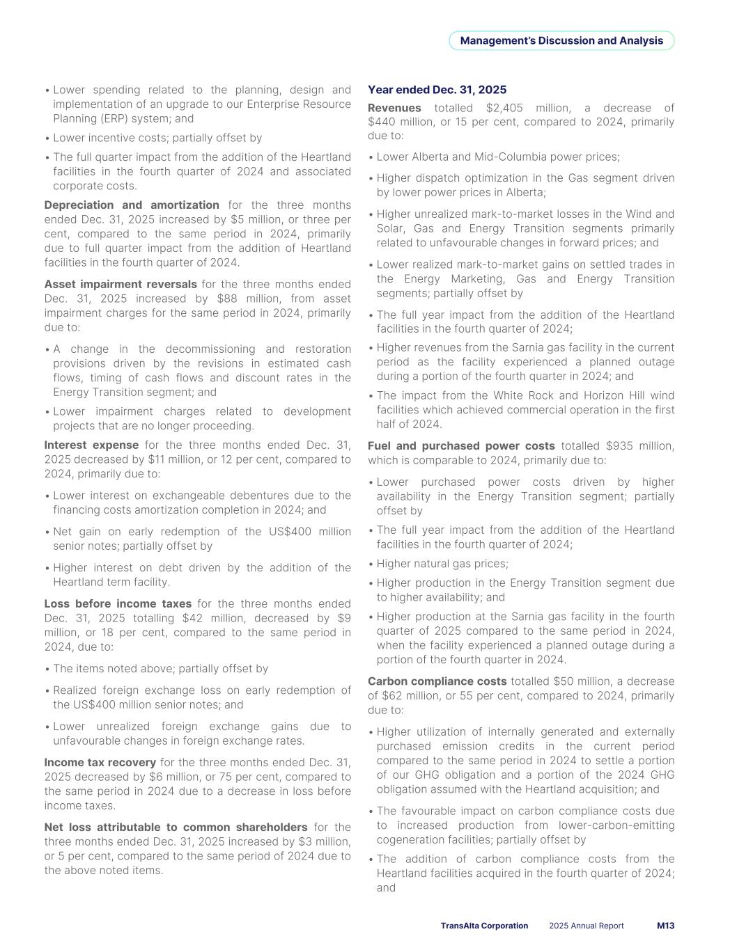 • Lower spending related to the planning, design and implementation of an upgrade to our Enterprise Resource Planning (ERP) system; and • Lower incentive costs; partially offset by • The full quarter impact from the addition of the Heartland facilities in the fourth quarter of 2024 and associated corporate costs. Depreciation and amortization for the three months ended Dec. 31, 2025 increased by $5 million, or three per cent, compared to the same period in 2024, primarily due  to full quarter impact from the addition of Heartland facilities in the fourth quarter of 2024. Asset impairment reversals for the three months ended Dec. 31, 2025 increased by $88  million, from asset impairment charges for the same period in 2024, primarily due to: • A change in the decommissioning and restoration provisions driven by the revisions in estimated cash flows, timing of cash flows and discount rates in the Energy Transition segment; and • Lower impairment charges related to development projects that are no longer proceeding. Interest expense for the three months ended Dec. 31, 2025 decreased by $11 million, or 12 per cent, compared to 2024, primarily due to: • Lower interest on exchangeable debentures due to the financing costs amortization completion in 2024; and • Net gain on early redemption of the US$400 million senior notes; partially offset by • Higher interest on debt driven by the addition of the Heartland term facility. Loss before income taxes for the three months ended Dec. 31, 2025 totalling $42 million, decreased by $9 million, or 18 per cent, compared to the same period in 2024, due to: • The items noted above; partially offset by • Realized foreign exchange loss on early redemption of the US$400 million senior notes; and • Lower unrealized foreign exchange gains due to unfavourable changes in foreign exchange rates. Income tax recovery for the three months ended Dec. 31, 2025 decreased by $6 million, or 75 per cent, compared to the same period in 2024 due to a decrease in loss before income taxes. Net loss attributable to common shareholders for the three months ended Dec. 31, 2025 increased by $3 million, or 5 per cent, compared to the same period of 2024 due to the above noted items. Year ended Dec. 31, 2025 Revenues totalled $2,405 million, a decrease of $440  million, or 15 per cent, compared to 2024, primarily due to: • Lower Alberta and Mid-Columbia power prices; • Higher dispatch optimization in the Gas segment driven by lower power prices in Alberta; • Higher unrealized mark-to-market losses in the Wind and Solar, Gas and Energy Transition segments primarily related to unfavourable changes in forward prices; and • Lower realized mark-to-market gains on settled trades in the Energy Marketing, Gas and Energy Transition segments; partially offset by • The full year impact from the addition of the Heartland facilities in the fourth quarter of 2024; • Higher revenues from the Sarnia gas facility in the current period as the facility experienced a planned outage during a portion of the fourth quarter in 2024; and • The impact from the White Rock and Horizon Hill wind facilities which achieved commercial operation in the first half of 2024. Fuel and purchased power costs totalled $935 million, which is comparable to 2024, primarily due to: • Lower purchased power costs driven by higher availability in the Energy Transition segment; partially offset by • The full year impact from the addition of the Heartland facilities in the fourth quarter of 2024; • Higher natural gas prices; • Higher production in the Energy Transition segment due to higher availability; and • Higher production at the Sarnia gas facility in the fourth quarter of 2025 compared to the same period in 2024, when the facility experienced a planned outage during a portion of the fourth quarter in 2024. Carbon compliance costs totalled $50 million, a decrease of $62 million, or 55 per cent, compared to 2024, primarily due to: • Higher utilization of internally generated and externally purchased emission credits in the current period compared to the same period in 2024 to settle a portion of our GHG obligation and a portion of the 2024 GHG obligation assumed with the Heartland acquisition; and • The favourable impact on carbon compliance costs due to increased production from lower-carbon-emitting cogeneration facilities; partially offset by • The addition of carbon compliance costs from the Heartland facilities acquired in the fourth quarter of 2024; and TransAlta Corporation 2025 Annual Report M13