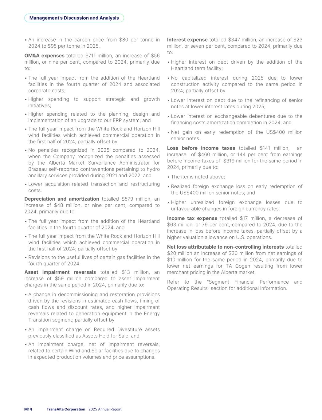 • An increase in the carbon price from $80 per tonne in 2024 to $95 per tonne in 2025. OM&A expenses totalled $711 million, an increase of $56 million, or nine per cent, compared to 2024, primarily due to: • The full year impact from the addition of the Heartland facilities in the fourth quarter of 2024 and associated corporate costs; • Higher spending to support strategic and growth initiatives; • Higher spending related to the planning, design and implementation of an upgrade to our ERP system; and • The full year impact from the White Rock and Horizon Hill wind facilities which achieved commercial operation in the first half of 2024; partially offset by • No penalties recognized in 2025 compared to 2024, when the Company recognized the penalties assessed by the Alberta Market Surveillance Administrator for Brazeau self-reported contraventions pertaining to hydro ancillary services provided during 2021 and 2022; and • Lower acquisition-related transaction and restructuring costs. Depreciation and amortization totalled $579 million, an increase of $48 million, or nine per cent, compared to 2024, primarily due to: • The full year impact from the addition of the Heartland facilities in the fourth quarter of 2024; and • The full year impact from the White Rock and Horizon Hill wind facilities which achieved commercial operation in the first half of 2024; partially offset by • Revisions to the useful lives of certain gas facilities in the fourth quarter of 2024. Asset impairment reversals totalled $13 million, an increase of $59 million compared to asset impairment charges in the same period in 2024, primarily due to: • A change in decommissioning and restoration provisions driven by the revisions in estimated cash flows, timing of cash flows and discount rates, and higher impairment reversals related to generation equipment in the Energy Transition segment; partially offset by • An impairment charge on Required Divestiture assets previously classified as Assets Held for Sale; and • An impairment charge, net of impairment reversals, related to certain Wind and Solar facilities due to changes in expected production volumes and price assumptions. Interest expense totalled $347 million, an increase of $23 million, or seven per cent, compared to 2024, primarily due to: • Higher interest on debt driven by the addition of the Heartland term facility; • No capitalized interest during 2025 due to lower construction activity compared to the same period in 2024; partially offset by • Lower interest on debt due to the refinancing of senior notes at lower interest rates during 2025; • Lower interest on exchangeable debentures due to the financing costs amortization completion in 2024; and • Net gain on early redemption of the US$400 million senior notes. Loss before income taxes totalled $141 million, an increase of $460 million, or 144 per cent from earnings before income taxes of $319 million for the same period in 2024, primarily due to: • The items noted above; • Realized foreign exchange loss on early redemption of the US$400 million senior notes; and • Higher unrealized foreign exchange losses due to unfavourable changes in foreign currency rates. Income tax expense totalled $17 million, a decrease of $63 million, or 79 per cent, compared to 2024, due to the increase in loss before income taxes, partially offset by a higher valuation allowance on U.S. operations. Net loss attributable to non-controlling interests totalled $20 million an increase of $30 million from net earnings of $10 million for the same period in 2024, primarily due to lower net earnings for TA Cogen resulting from lower merchant pricing in the Alberta market. Refer to the "Segment Financial Performance and Operating Results" section for additional information. M14 TransAlta Corporation 2025 Annual Report