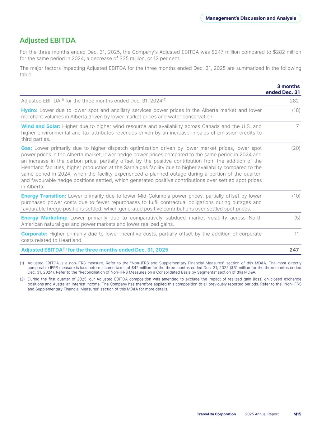 Adjusted EBITDA For the three months ended Dec. 31, 2025, the Company's Adjusted EBITDA was $247 million compared to $282 million for the same period in 2024, a decrease of $35 million, or 12 per cent. The major factors impacting Adjusted EBITDA for the three months ended Dec. 31, 2025 are summarized in the following table: 3 months ended Dec. 31 Adjusted EBITDA(1) for the three months ended Dec. 31, 2024(2) 282 Hydro: Lower due to lower spot and ancillary services power prices in the Alberta market and lower merchant volumes in Alberta driven by lower market prices and water conservation. (18) Wind and Solar: Higher due to higher wind resource and availability across Canada and the U.S. and higher environmental and tax attributes revenues driven by an increase in sales of emission credits to third parties. 7 Gas: Lower primarily due to higher dispatch optimization driven by lower market prices, lower spot power prices in the Alberta market, lower hedge power prices compared to the same period in 2024 and an increase in the carbon price, partially offset by the positive contribution from the addition of the Heartland facilities, higher production at the Sarnia gas facility due to higher availability compared to the same period in 2024, when the facility experienced a planned outage during a portion of the quarter, and favourable hedge positions settled, which generated positive contributions over settled spot prices in Alberta. (20) Energy Transition: Lower primarily due to lower Mid-Columbia power prices, partially offset by lower purchased power costs due to fewer repurchases to fulfil contractual obligations during outages and favourable hedge positions settled, which generated positive contributions over settled spot prices. (10) Energy Marketing: Lower primarily due to comparatively subdued market volatility across North American natural gas and power markets and lower realized gains. (5) Corporate: Higher primarily due to lower incentive costs, partially offset by the addition of corporate costs related to Heartland. 11 Adjusted EBITDA(1) for the three months ended Dec. 31, 2025 247 (1) Adjusted EBITDA is a non-IFRS measure. Refer to the "Non-IFRS and Supplementary Financial Measures" section of this MD&A. The most directly comparable IFRS measure is loss before income taxes of $42 million for the three months ended Dec. 31, 2025 ($51 million for the three months ended Dec. 31, 2024). Refer to the "Reconciliation of Non-IFRS Measures on a Consolidated Basis by Segments" section of this MD&A. (2) During the first quarter of 2025, our Adjusted EBITDA composition was amended to exclude the impact of realized gain (loss) on closed exchange positions and Australian interest income. The Company has therefore applied this composition to all previously reported periods. Refer to the "Non-IFRS and Supplementary Financial Measures" section of this MD&A for more details. TransAlta Corporation 2025 Annual Report M15
