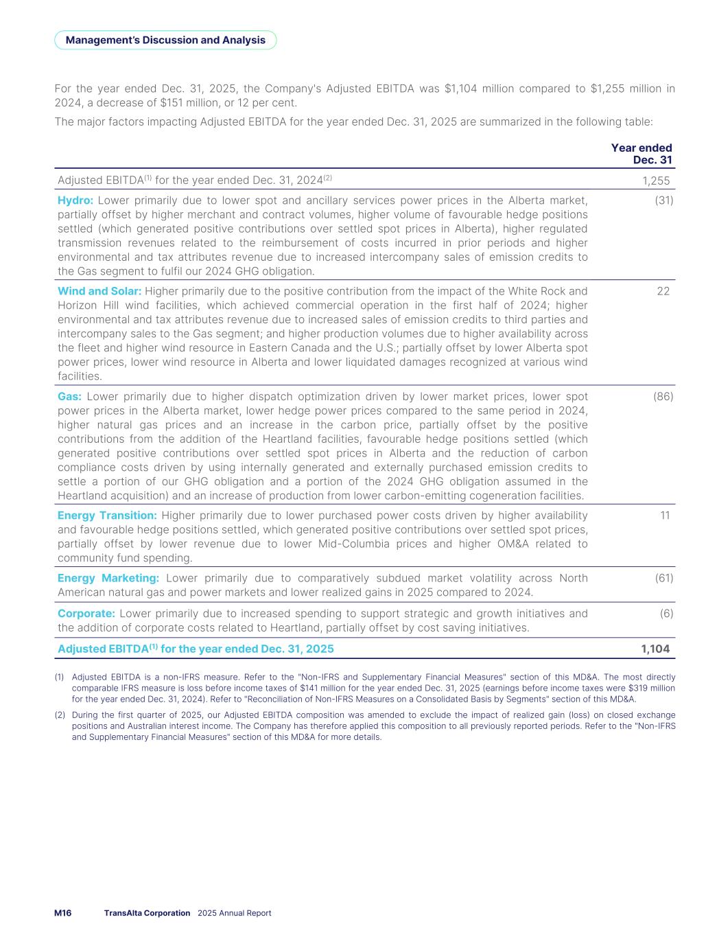 For the year ended Dec. 31, 2025, the Company's Adjusted EBITDA was $1,104 million compared to $1,255 million in 2024, a decrease of $151 million, or 12 per cent. The major factors impacting Adjusted EBITDA for the year ended Dec. 31, 2025 are summarized in the following table: Year ended Dec. 31 Adjusted EBITDA(1) for the year ended Dec. 31, 2024(2) 1,255 Hydro: Lower primarily due to lower spot and ancillary services power prices in the Alberta market, partially offset by higher merchant and contract volumes, higher volume of favourable hedge positions settled (which generated positive contributions over settled spot prices in Alberta), higher regulated transmission revenues related to the reimbursement of costs incurred in prior periods and higher environmental and tax attributes revenue due to increased intercompany sales of emission credits to the Gas segment to fulfil our 2024 GHG obligation. (31) Wind and Solar: Higher primarily due to the positive contribution from the impact of the White Rock and Horizon Hill wind facilities, which achieved commercial operation in the first half of 2024; higher environmental and tax attributes revenue due to increased sales of emission credits to third parties and intercompany sales to the Gas segment; and higher production volumes due to higher availability across the fleet and higher wind resource in Eastern Canada and the U.S.; partially offset by lower Alberta spot power prices, lower wind resource in Alberta and lower liquidated damages recognized at various wind facilities. 22 Gas: Lower primarily due to higher dispatch optimization driven by lower market prices, lower spot power prices in the Alberta market, lower hedge power prices compared to the same period in 2024, higher natural gas prices and an increase in the carbon price, partially offset by the positive contributions from the addition of the Heartland facilities, favourable hedge positions settled (which generated positive contributions over settled spot prices in Alberta and the reduction of carbon compliance costs driven by using internally generated and externally purchased emission credits to settle a portion of our GHG obligation and a portion of the 2024 GHG obligation assumed in the Heartland acquisition) and an increase of production from lower carbon-emitting cogeneration facilities. (86) Energy Transition: Higher primarily due to lower purchased power costs driven by higher availability and favourable hedge positions settled, which generated positive contributions over settled spot prices, partially offset by lower revenue due to lower Mid-Columbia prices and higher OM&A related to community fund spending. 11 Energy Marketing: Lower primarily due to comparatively subdued market volatility across North American natural gas and power markets and lower realized gains in 2025 compared to 2024. (61) Corporate: Lower primarily due to increased spending to support strategic and growth initiatives and the addition of corporate costs related to Heartland, partially offset by cost saving initiatives. (6) Adjusted EBITDA(1) for the year ended Dec. 31, 2025 1,104 (1) Adjusted EBITDA is a non-IFRS measure. Refer to the "Non-IFRS and Supplementary Financial Measures" section of this MD&A. The most directly comparable IFRS measure is loss before income taxes of $141 million for the year ended Dec. 31, 2025 (earnings before income taxes were $319 million for the year ended Dec. 31, 2024). Refer to "Reconciliation of Non-IFRS Measures on a Consolidated Basis by Segments" section of this MD&A. (2) During the first quarter of 2025, our Adjusted EBITDA composition was amended to exclude the impact of realized gain (loss) on closed exchange positions and Australian interest income. The Company has therefore applied this composition to all previously reported periods. Refer to the "Non-IFRS and Supplementary Financial Measures" section of this MD&A for more details. M16 TransAlta Corporation 2025 Annual Report
