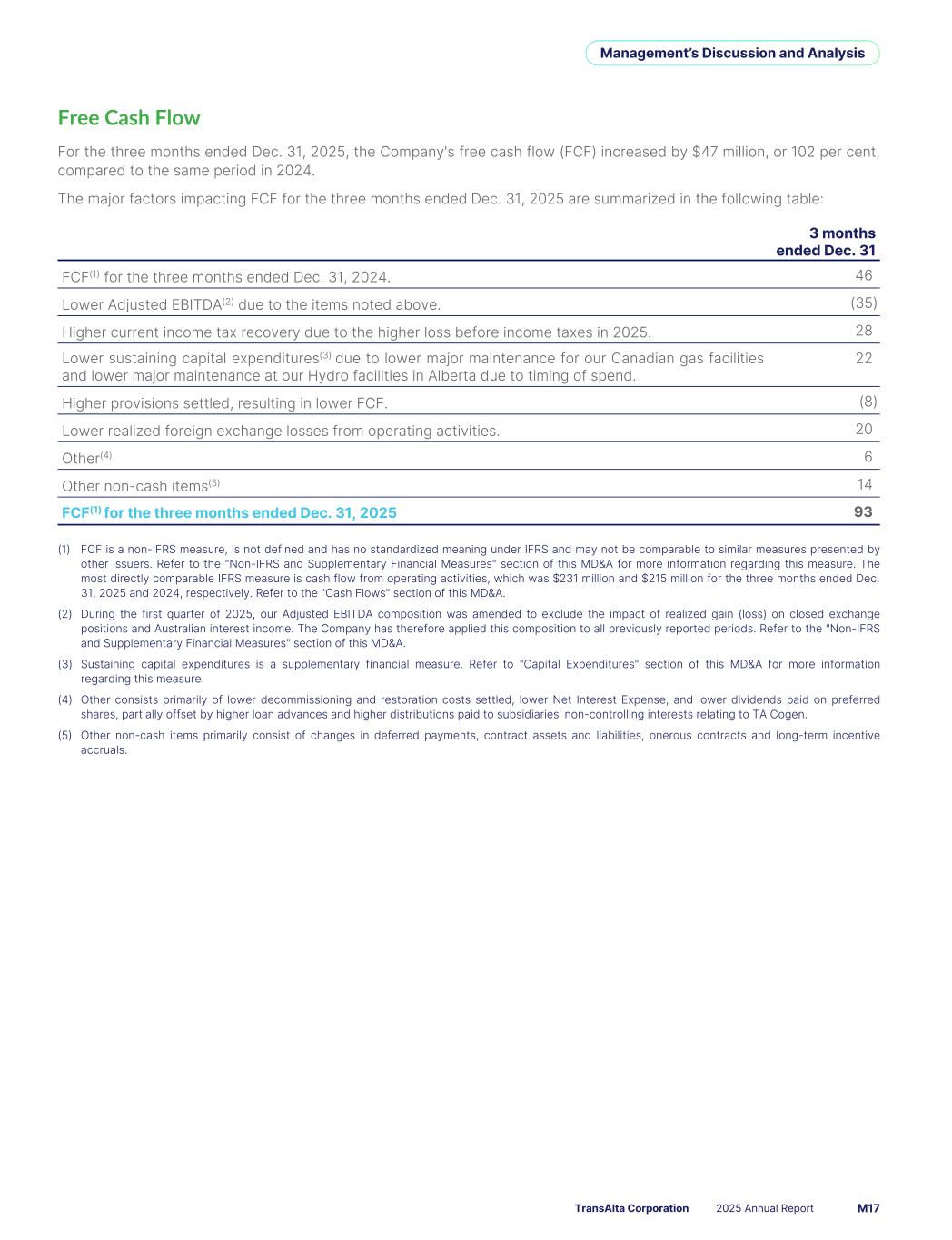 Free Cash Flow For the three months ended Dec. 31, 2025, the Company's free cash flow (FCF) increased by $47 million, or 102 per cent, compared to the same period in 2024. The major factors impacting FCF for the three months ended Dec. 31, 2025 are summarized in the following table: 3 months ended Dec. 31 FCF(1) for the three months ended Dec. 31, 2024. 46 Lower Adjusted EBITDA(2) due to the items noted above. (35) Higher current income tax recovery due to the higher loss before income taxes in 2025. 28 Lower sustaining capital expenditures(3) due to lower major maintenance for our Canadian gas facilities and lower major maintenance at our Hydro facilities in Alberta due to timing of spend. 22 Higher provisions settled, resulting in lower FCF. (8) Lower realized foreign exchange losses from operating activities. 20 Other(4) 6 Other non-cash items(5) 14 FCF(1) for the three months ended Dec. 31, 2025 93 (1) FCF is a non-IFRS measure, is not defined and has no standardized meaning under IFRS and may not be comparable to similar measures presented by other issuers. Refer to the "Non-IFRS and Supplementary Financial Measures" section of this MD&A for more information regarding this measure. The most directly comparable IFRS measure is cash flow from operating activities, which was $231 million and $215 million for the three months ended Dec. 31, 2025 and 2024, respectively. Refer to the "Cash Flows" section of this MD&A. (2) During the first quarter of 2025, our Adjusted EBITDA composition was amended to exclude the impact of realized gain (loss) on closed exchange positions and Australian interest income. The Company has therefore applied this composition to all previously reported periods. Refer to the "Non-IFRS and Supplementary Financial Measures" section of this MD&A. (3) Sustaining capital expenditures is a supplementary financial measure. Refer to "Capital Expenditures" section of this MD&A for more information regarding this measure. (4) Other consists primarily of lower decommissioning and restoration costs settled, lower Net Interest Expense, and lower dividends paid on preferred shares, partially offset by higher loan advances and higher distributions paid to subsidiaries' non-controlling interests relating to TA Cogen. (5) Other non-cash items primarily consist of changes in deferred payments, contract assets and liabilities, onerous contracts and long-term incentive accruals. TransAlta Corporation 2025 Annual Report M17