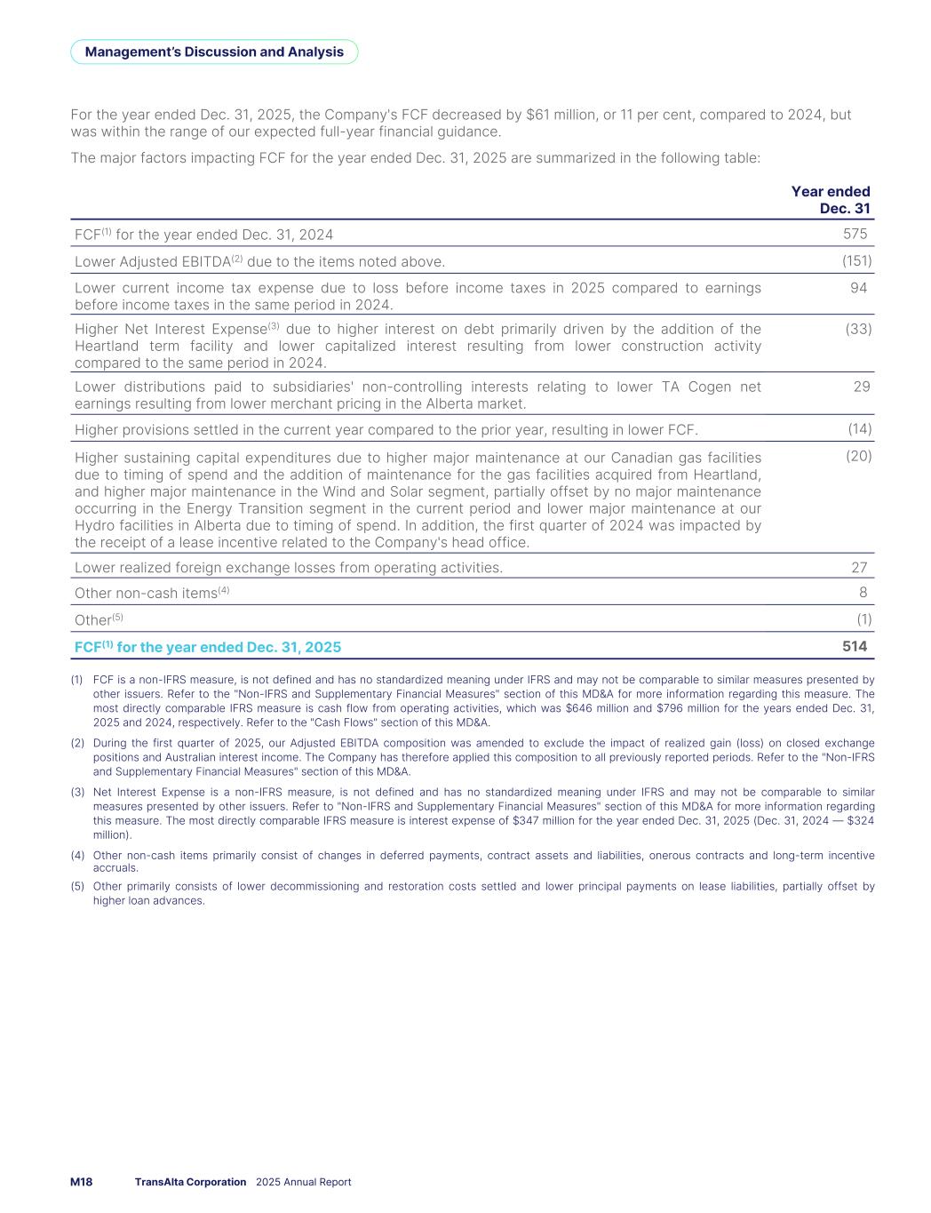 For the year ended Dec. 31, 2025, the Company's FCF decreased by $61 million, or 11 per cent, compared to 2024, but was within the range of our expected full-year financial guidance. The major factors impacting FCF for the year ended Dec. 31, 2025 are summarized in the following table: Year ended Dec. 31 FCF(1) for the year ended Dec. 31, 2024 575 Lower Adjusted EBITDA(2) due to the items noted above. (151) Lower current income tax expense due to loss before income taxes in 2025 compared to earnings before income taxes in the same period in 2024. 94 Higher Net Interest Expense(3) due to higher interest on debt primarily driven by the addition of the Heartland term facility and lower capitalized interest resulting from lower construction activity compared to the same period in 2024. (33) Lower distributions paid to subsidiaries' non-controlling interests relating to lower TA Cogen net earnings resulting from lower merchant pricing in the Alberta market. 29 Higher provisions settled in the current year compared to the prior year, resulting in lower FCF. (14) Higher sustaining capital expenditures due to higher major maintenance at our Canadian gas facilities due to timing of spend and the addition of maintenance for the gas facilities acquired from Heartland, and higher major maintenance in the Wind and Solar segment, partially offset by no major maintenance occurring in the Energy Transition segment in the current period and lower major maintenance at our Hydro facilities in Alberta due to timing of spend. In addition, the first quarter of 2024 was impacted by the receipt of a lease incentive related to the Company's head office. (20) Lower realized foreign exchange losses from operating activities. 27 Other non-cash items(4) 8 Other(5) (1) FCF(1) for the year ended Dec. 31, 2025 514 (1) FCF is a non-IFRS measure, is not defined and has no standardized meaning under IFRS and may not be comparable to similar measures presented by other issuers. Refer to the "Non-IFRS and Supplementary Financial Measures" section of this MD&A for more information regarding this measure. The most directly comparable IFRS measure is cash flow from operating activities, which was $646 million and $796 million for the years ended Dec. 31, 2025 and 2024, respectively. Refer to the "Cash Flows" section of this MD&A. (2) During the first quarter of 2025, our Adjusted EBITDA composition was amended to exclude the impact of realized gain (loss) on closed exchange positions and Australian interest income. The Company has therefore applied this composition to all previously reported periods. Refer to the "Non-IFRS and Supplementary Financial Measures" section of this MD&A. (3) Net Interest Expense is a non-IFRS measure, is not defined and has no standardized meaning under IFRS and may not be comparable to similar measures presented by other issuers. Refer to "Non-IFRS and Supplementary Financial Measures" section of this MD&A for more information regarding this measure. The most directly comparable IFRS measure is interest expense of $347 million for the year ended Dec. 31, 2025 (Dec. 31, 2024 — $324 million). (4) Other non-cash items primarily consist of changes in deferred payments, contract assets and liabilities, onerous contracts and long-term incentive accruals. (5) Other primarily consists of lower decommissioning and restoration costs settled and lower principal payments on lease liabilities, partially offset by higher loan advances. M18 TransAlta Corporation 2025 Annual Report