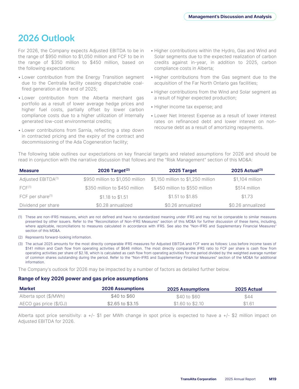 2026 Outlook For 2026, the Company expects Adjusted EBITDA to be in the range of $950 million to $1,050 million and FCF to be in the range of $350 million to $450 million, based on the following expectations: • Lower contribution from the Energy Transition segment due to the Centralia facility ceasing dispatchable coal- fired generation at the end of 2025; • Lower contribution from the Alberta merchant gas portfolio as a result of lower average hedge prices and higher fuel costs, partially offset by lower carbon compliance costs due to a higher utilization of internally generated low-cost environmental credits; • Lower contributions from Sarnia, reflecting a step down in contracted pricing and the expiry of the contract and decommissioning of the Ada Cogeneration facility; • Higher contributions within the Hydro, Gas and Wind and Solar segments due to the expected realization of carbon credits against in-year, in addition to 2025, carbon compliance costs in Alberta; • Higher contributions from the Gas segment due to the acquisition of the Far North Ontario gas facilities; • Higher contributions from the Wind and Solar segment as a result of higher expected production; • Higher income tax expense; and • Lower Net Interest Expense as a result of lower interest rates on refinanced debt and lower interest on non- recourse debt as a result of amortizing repayments. The following table outlines our expectations on key financial targets and related assumptions for 2026 and should be read in conjunction with the narrative discussion that follows and the "Risk Management" section of this MD&A: Measure 2026 Target(2) 2025 Target 2025 Actual(3) Adjusted EBITDA(1) $950 million to $1,050 million $1,150 million to $1,250 million $1,104 million FCF(1) $350 million to $450 million $450 million to $550 million $514 million FCF per share(1) $1.18 to $1.51 $1.51 to $1.85 $1.73 Dividend per share $0.28 annualized $0.26 annualized $0.26 annualized (1) These are non-IFRS measures, which are not defined and have no standardized meaning under IFRS and may not be comparable to similar measures presented by other issuers. Refer to the "Reconciliation of Non-IFRS Measures" section of this MD&A for further discussion of these items, including, where applicable, reconciliations to measures calculated in accordance with IFRS. See also the "Non-IFRS and Supplementary Financial Measures" section of this MD&A. (2) Represents forward-looking information. (3) The actual 2025 amounts for the most directly comparable IFRS measures for Adjusted EBITDA and FCF were as follows: Loss before income taxes of $141 million and Cash flow from operating activities of $646 million. The most directly comparable IFRS ratio to FCF per share is cash flow from operating activities per share of $2.18, which is calculated as cash flow from operating activities for the period divided by the weighted average number of common shares outstanding during the period. Refer to the "Non-IFRS and Supplementary Financial Measures" section of the MD&A for additional information. The Company's outlook for 2026 may be impacted by a number of factors as detailed further below. Range of key 2026 power and gas price assumptions Market 2026 Assumptions 2025 Assumptions 2025 Actual Alberta spot ($/MWh) $40 to $60 $40 to $60 $44 AECO gas price ($/GJ) $2.65 to $3.15 $1.60 to $2.10 $1.61 Alberta spot price sensitivity: a +/- $1 per MWh change in spot price is expected to have a +/- $2 million impact on Adjusted EBITDA for 2026. TransAlta Corporation 2025 Annual Report M19