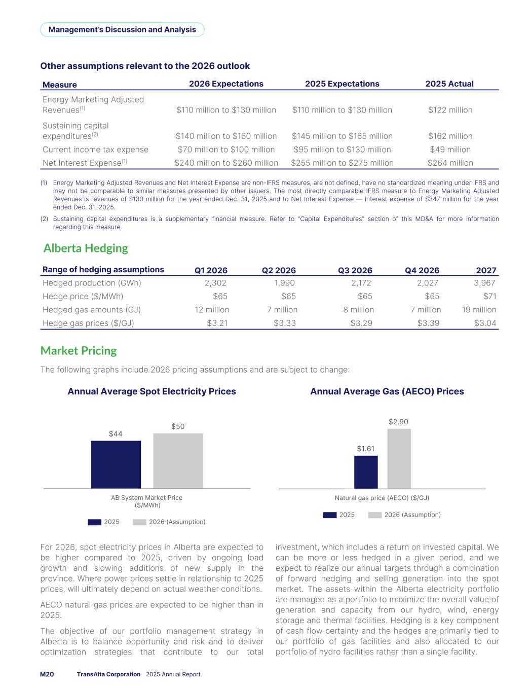 Other assumptions relevant to the 2026 outlook Measure 2026 Expectations 2025 Expectations 2025 Actual Energy Marketing Adjusted Revenues(1) $110 million to $130 million $110 million to $130 million $122 million Sustaining capital expenditures(2) $140 million to $160 million $145 million to $165 million $162 million Current income tax expense $70 million to $100 million $95 million to $130 million $49 million Net Interest Expense(1) $240 million to $260 million $255 million to $275 million $264 million (1) Energy Marketing Adjusted Revenues and Net Interest Expense are non-IFRS measures, are not defined, have no standardized meaning under IFRS and may not be comparable to similar measures presented by other issuers. The most directly comparable IFRS measure to Energy Marketing Adjusted Revenues is revenues of $130 million for the year ended Dec. 31, 2025 and to Net Interest Expense — interest expense of $347 million for the year ended Dec. 31, 2025. (2) Sustaining capital expenditures is a supplementary financial measure. Refer to "Capital Expenditures" section of this MD&A for more information regarding this measure. Alberta Hedging Range of hedging assumptions Q1 2026 Q2 2026 Q3 2026 Q4 2026 2027 Hedged production (GWh) 2,302 1,990 2,172 2,027 3,967 Hedge price ($/MWh) $65 $65 $65 $65 $71 Hedged gas amounts (GJ) 12 million 7 million 8 million 7 million 19 million Hedge gas prices ($/GJ) $3.21 $3.33 $3.29 $3.39 $3.04 Market Pricing The following graphs include 2026 pricing assumptions and are subject to change: Annual Average Spot Electricity Prices $44 $50 2025 2026 (Assumption) AB System Market Price ($/MWh) Annual Average Gas (AECO) Prices $1.61 $2.90 2025 2026 (Assumption) Natural gas price (AECO) ($/GJ) For 2026, spot electricity prices in Alberta are expected to be higher compared to 2025, driven by ongoing load growth and slowing additions of new supply in the province. Where power prices settle in relationship to 2025 prices, will ultimately depend on actual weather conditions. AECO natural gas prices are expected to be higher than in 2025. The objective of our portfolio management strategy in Alberta is to balance opportunity and risk and to deliver optimization strategies that contribute to our total investment, which includes a return on invested capital. We can be more or less hedged in a given period, and we expect to realize our annual targets through a combination of forward hedging and selling generation into the spot market. The assets within the Alberta electricity portfolio are managed as a portfolio to maximize the overall value of generation and capacity from our hydro, wind, energy storage and thermal facilities. Hedging is a key component of cash flow certainty and the hedges are primarily tied to our portfolio of gas facilities and also allocated to our portfolio of hydro facilities rather than a single facility. M20 TransAlta Corporation 2025 Annual Report