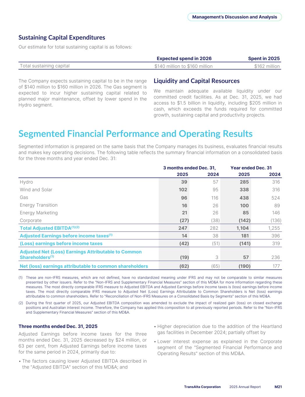 Sustaining Capital Expenditures Our estimate for total sustaining capital is as follows: Expected spend in 2026 Spent in 2025 Total sustaining capital $140 million to $160 million $162 million The Company expects sustaining capital to be in the range of $140 million to $160 million in 2026. The Gas segment is expected to incur higher sustaining capital related to planned major maintenance, offset by lower spend in the Hydro segment. Liquidity and Capital Resources We maintain adequate available liquidity under our committed credit facilities. As at Dec. 31, 2025, we had access to $1.5 billion in liquidity, including $205 million in cash, which exceeds the funds required for committed growth, sustaining capital and productivity projects. Segmented Financial Performance and Operating Results Segmented information is prepared on the same basis that the Company manages its business, evaluates financial results and makes key operating decisions. The following table reflects the summary financial information on a consolidated basis for the three months and year ended Dec. 31: 3 months ended Dec. 31, Year ended Dec. 31 2025 2024 2025 2024 Hydro 39 57 285 316 Wind and Solar 102 95 338 316 Gas 96 116 438 524 Energy Transition 16 26 100 89 Energy Marketing 21 26 85 146 Corporate (27) (38) (142) (136) Total Adjusted EBITDA(1)(2) 247 282 1,104 1,255 Adjusted Earnings before income taxes(1) 14 38 181 396 (Loss) earnings before income taxes (42) (51) (141) 319 Adjusted Net (Loss) Earnings Attributable to Common Shareholders(1) (19) 3 57 236 Net (loss) earnings attributable to common shareholders (62) (65) (190) 177 (1) These are non-IFRS measures, which are not defined, have no standardized meaning under IFRS and may not be comparable to similar measures presented by other issuers. Refer to the "Non-IFRS and Supplementary Financial Measures" section of this MD&A for more information regarding these measures. The most directly comparable IFRS measure to Adjusted EBITDA and Adjusted Earnings before income taxes is (loss) earnings before income taxes. The most directly comparable IFRS measure to Adjusted Net (Loss) Earnings Attributable to Common Shareholders is Net (loss) earnings attributable to common shareholders. Refer to "Reconciliation of Non-IFRS Measures on a Consolidated Basis by Segments" section of this MD&A. (2) During the first quarter of 2025, our Adjusted EBITDA composition was amended to exclude the impact of realized gain (loss) on closed exchange positions and Australian interest income. Therefore, the Company has applied this composition to all previously reported periods. Refer to the "Non-IFRS and Supplementary Financial Measures" section of this MD&A. Three months ended Dec. 31, 2025 Adjusted Earnings before income taxes for the three months ended Dec. 31, 2025 decreased by $24 million, or 63 per cent, from Adjusted Earnings before income taxes for the same period in 2024, primarily due to: • The factors causing lower Adjusted EBITDA described in the "Adjusted EBITDA" section of this MD&A; and • Higher depreciation due to the addition of the Heartland gas facilities in December 2024; partially offset by • Lower interest expense as explained in the Corporate segment of the "Segmented Financial Performance and Operating Results" section of this MD&A. TransAlta Corporation 2025 Annual Report M21