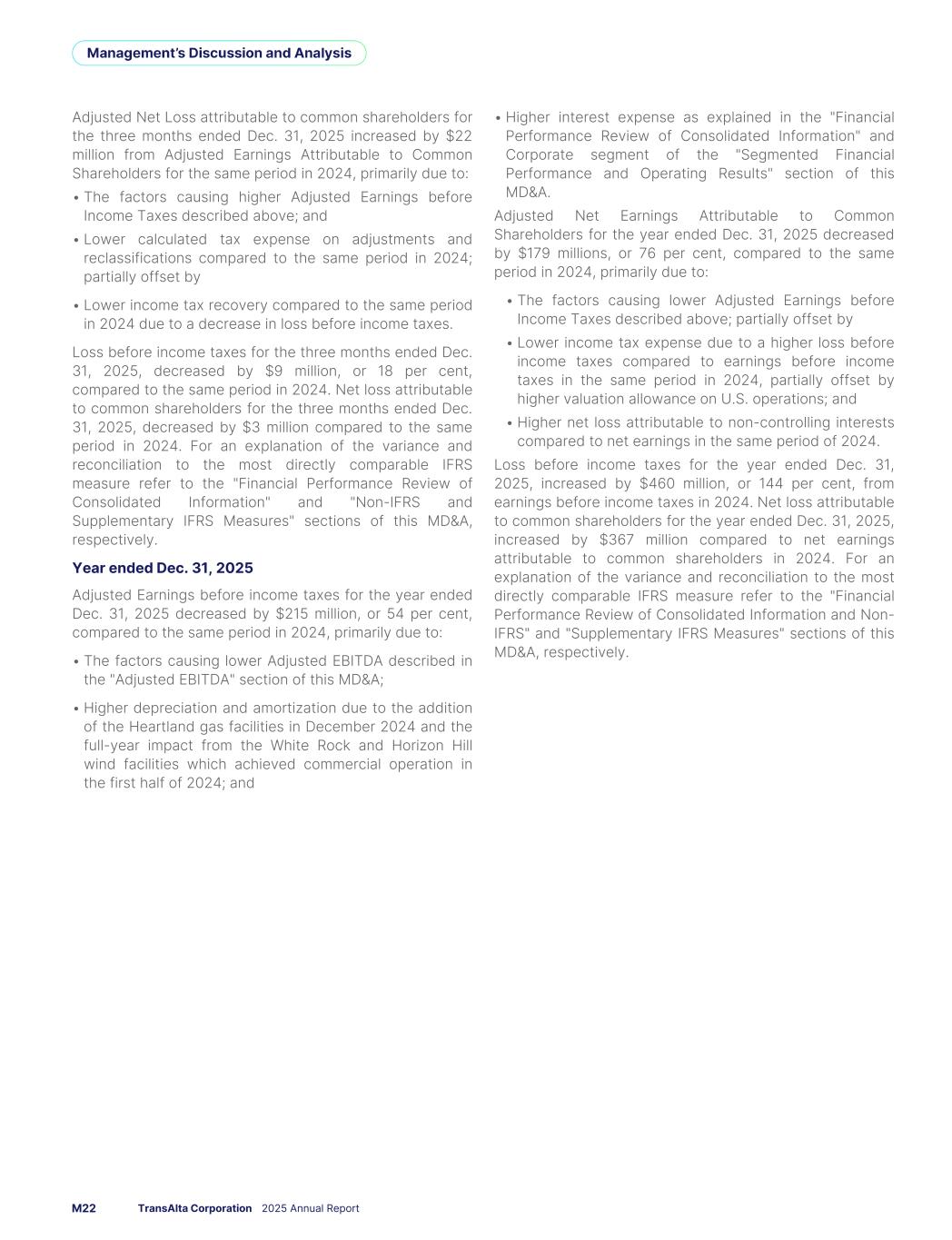 Adjusted Net Loss attributable to common shareholders for the three months ended Dec. 31, 2025 increased by $22 million from Adjusted Earnings Attributable to Common Shareholders for the same period in 2024, primarily due to: • The factors causing higher Adjusted Earnings before Income Taxes described above; and • Lower calculated tax expense on adjustments and reclassifications compared to the same period in 2024; partially offset by • Lower income tax recovery compared to the same period in 2024 due to a decrease in loss before income taxes. Loss before income taxes for the three months ended Dec. 31, 2025, decreased by $9 million, or 18 per cent, compared to the same period in 2024. Net loss attributable to common shareholders for the three months ended Dec. 31, 2025, decreased by $3 million compared to the same period in 2024. For an explanation of the variance and reconciliation to the most directly comparable IFRS measure refer to the "Financial Performance Review of Consolidated Information" and "Non-IFRS and Supplementary IFRS Measures" sections of this MD&A, respectively. Year ended Dec. 31, 2025 Adjusted Earnings before income taxes for the year ended Dec. 31, 2025 decreased by $215 million, or 54 per cent, compared to the same period in 2024, primarily due to: • The factors causing lower Adjusted EBITDA described in the "Adjusted EBITDA" section of this MD&A; • Higher depreciation and amortization due to the addition of the Heartland gas facilities in December 2024 and the full-year impact from the White Rock and Horizon Hill wind facilities which achieved commercial operation in the first half of 2024; and • Higher interest expense as explained in the "Financial Performance Review of Consolidated Information" and Corporate segment of the "Segmented Financial Performance and Operating Results" section of this MD&A. Adjusted Net Earnings Attributable to Common Shareholders for the year ended Dec. 31, 2025 decreased by $179 millions, or 76 per cent, compared to the same period in 2024, primarily due to: • The factors causing lower Adjusted Earnings before Income Taxes described above; partially offset by • Lower income tax expense due to a higher loss before income taxes compared to earnings before income taxes in the same period in 2024, partially offset by higher valuation allowance on U.S. operations; and • Higher net loss attributable to non-controlling interests compared to net earnings in the same period of 2024. Loss before income taxes for the year ended Dec. 31, 2025, increased by $460 million, or 144 per cent, from earnings before income taxes in 2024. Net loss attributable to common shareholders for the year ended Dec. 31, 2025, increased by $367 million compared to net earnings attributable to common shareholders in 2024. For an explanation of the variance and reconciliation to the most directly comparable IFRS measure refer to the "Financial Performance Review of Consolidated Information and Non- IFRS" and "Supplementary IFRS Measures" sections of this MD&A, respectively. M22 TransAlta Corporation 2025 Annual Report