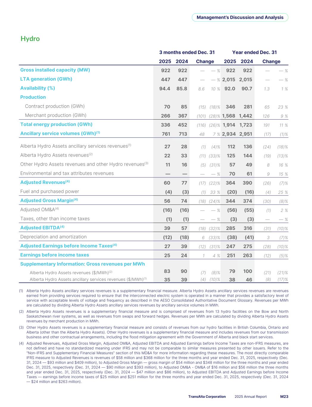 Hydro 3 months ended Dec. 31 Year ended Dec. 31 2025 2024 Change 2025 2024 Change Gross installed capacity (MW) 922 922 — — % 922 922 — — % LTA generation (GWh) 447 447 — — % 2,015 2,015 — — % Availability (%) 94.4 85.8 8.6 10 % 92.0 90.7 1.3 1 % Production Contract production (GWh) 70 85 (15) (18) % 346 281 65 23 % Merchant production (GWh) 266 367 (101) (28) % 1,568 1,442 126 9 % Total energy production (GWh) 336 452 (116) (26) % 1,914 1,723 191 11 % Ancillary service volumes (GWh)(1) 761 713 48 7 % 2,934 2,951 (17) (1) % Alberta Hydro Assets ancillary services revenues(1) 27 28 (1) (4) % 112 136 (24) (18) % Alberta Hydro Assets revenues(2) 22 33 (11) (33) % 125 144 (19) (13) % Other Hydro Assets revenues and other Hydro revenues(3) 11 16 (5) (31) % 57 49 8 16 % Environmental and tax attributes revenues — — — — % 70 61 9 15 % Adjusted Revenues(4) 60 77 (17) (22) % 364 390 (26) (7) % Fuel and purchased power (4) (3) (1) 33 % (20) (16) (4) 25 % Adjusted Gross Margin(4) 56 74 (18) (24) % 344 374 (30) (8) % Adjusted OM&A(4) (16) (16) — — % (56) (55) (1) 2 % Taxes, other than income taxes (1) (1) — — % (3) (3) — — % Adjusted EBITDA(4) 39 57 (18) (32) % 285 316 (31) (10) % Depreciation and amortization (12) (18) 6 (33) % (38) (41) 3 (7) % Adjusted Earnings before Income Taxes(4) 27 39 (12) (31) % 247 275 (28) (10) % Earnings before income taxes 25 24 1 4 % 251 263 (12) (5) % Supplementary Information: Gross revenues per MWh Alberta Hydro Assets revenues ($/MWh)(2) 83 90 (7) (8) % 79 100 (21) (21) % Alberta Hydro Assets ancillary services revenues ($/MWh)(1) 35 39 (4) (10) % 38 46 (8) (17) % (1) Alberta Hydro Assets ancillary services revenues is a supplementary financial measure. Alberta Hydro Assets ancillary services revenues are revenues earned from providing services required to ensure that the interconnected electric system is operated in a manner that provides a satisfactory level of service with acceptable levels of voltage and frequency as described in the AESO Consolidated Authoritative Document Glossary. Revenues per MWh are calculated by dividing Alberta Hydro Assets ancillary services revenues by ancillary service volumes in MWh. (2) Alberta Hydro Assets revenues is a supplementary financial measure and is comprised of revenues from 13 hydro facilities on the Bow and North Saskatchewan river systems, as well as revenues from swaps and forward hedges. Revenues per MWh are calculated by dividing Alberta Hydro Assets revenues by merchant production in MWh. (3) Other Hydro Assets revenues is a supplementary financial measure and consists of revenues from our hydro facilities in British Columbia, Ontario and Alberta (other than the Alberta Hydro Assets). Other Hydro revenues is a supplementary financial measure and includes revenues from our transmission business and other contractual arrangements, including the flood mitigation agreement with the Government of Alberta and black start services. (4) Adjusted Revenues, Adjusted Gross Margin, Adjusted OM&A, Adjusted EBITDA and Adjusted Earnings before Income Taxes are non-IFRS measures, are not defined and have no standardized meaning under IFRS and may not be comparable to similar measures presented by other issuers. Refer to the "Non-IFRS and Supplementary Financial Measures" section of this MD&A for more information regarding these measures. The most directly comparable IFRS measure to Adjusted Revenues is revenues of $58 million and $368 million for the three months and year ended Dec. 31, 2025, respectively (Dec. 31, 2024 — $93 million and $409 million), to Adjusted Gross Margin — gross margin of $54 million and $348 million for the three months and year ended Dec. 31, 2025, respectively (Dec. 31, 2024 — $90 million and $393 million), to Adjusted OM&A - OM&A of $16 million and $56 million the three months and year ended Dec. 31, 2025, respectively (Dec. 31, 2024 — $47 million and $86 million), to Adjusted EBITDA and Adjusted Earnings before Income Taxes — earnings before income taxes of $25 million and $251 million for the three months and year ended Dec. 31, 2025, respectively (Dec. 31, 2024 — $24 million and $263 million). TransAlta Corporation 2025 Annual Report M23