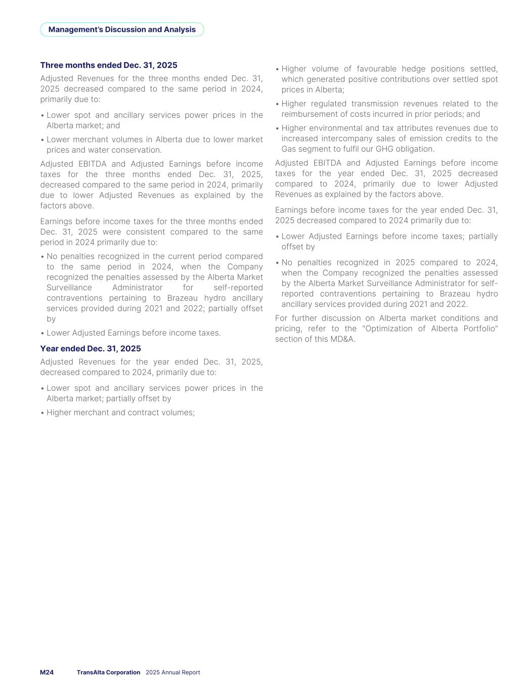Three months ended Dec. 31, 2025 Adjusted Revenues for the three months ended Dec. 31, 2025 decreased compared to the same period in 2024, primarily due to: • Lower spot and ancillary services power prices in the Alberta market; and • Lower merchant volumes in Alberta due to lower market prices and water conservation. Adjusted EBITDA and Adjusted Earnings before income taxes for the three months ended Dec. 31, 2025, decreased compared to the same period in 2024, primarily due to lower Adjusted Revenues as explained by the factors above. Earnings before income taxes for the three months ended Dec. 31, 2025 were consistent compared to the same period in 2024 primarily due to: • No penalties recognized in the current period compared to the same period in 2024, when the Company recognized the penalties assessed by the Alberta Market Surveillance Administrator for self-reported contraventions pertaining to Brazeau hydro ancillary services provided during 2021 and 2022; partially offset by • Lower Adjusted Earnings before income taxes. Year ended Dec. 31, 2025 Adjusted Revenues for the year ended Dec. 31, 2025, decreased compared to 2024, primarily due to: • Lower spot and ancillary services power prices in the Alberta market; partially offset by • Higher merchant and contract volumes; • Higher volume of favourable hedge positions settled, which generated positive contributions over settled spot prices in Alberta; • Higher regulated transmission revenues related to the reimbursement of costs incurred in prior periods; and • Higher environmental and tax attributes revenues due to increased intercompany sales of emission credits to the Gas segment to fulfil our GHG obligation. Adjusted EBITDA and Adjusted Earnings before income taxes for the year ended Dec. 31, 2025 decreased compared to 2024, primarily due to lower Adjusted Revenues as explained by the factors above. Earnings before income taxes for the year ended Dec. 31, 2025 decreased compared to 2024 primarily due to: • Lower Adjusted Earnings before income taxes; partially offset by • No penalties recognized in 2025 compared to 2024, when the Company recognized the penalties assessed by the Alberta Market Surveillance Administrator for self- reported contraventions pertaining to Brazeau hydro ancillary services provided during 2021 and 2022. For further discussion on Alberta market conditions and pricing, refer to the "Optimization of Alberta Portfolio" section of this MD&A. M24 TransAlta Corporation 2025 Annual Report