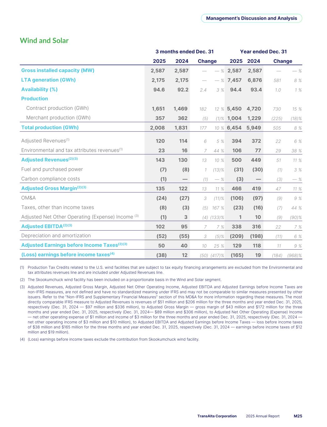 Wind and Solar 3 months ended Dec. 31 Year ended Dec. 31 2025 2024 Change 2025 2024 Change Gross installed capacity (MW) 2,587 2,587 — — % 2,587 2,587 — — % LTA generation (GWh) 2,175 2,175 — — % 7,457 6,876 581 8 % Availability (%) 94.6 92.2 2.4 3 % 94.4 93.4 1.0 1 % Production Contract production (GWh) 1,651 1,469 182 12 % 5,450 4,720 730 15 % Merchant production (GWh) 357 362 (5) (1) % 1,004 1,229 (225) (18) % Total production (GWh) 2,008 1,831 177 10 % 6,454 5,949 505 8 % Adjusted Revenues(1) 120 114 6 5 % 394 372 22 6 % Environmental and tax attributes revenues(1) 23 16 7 44 % 106 77 29 38 % Adjusted Revenues(2)(3) 143 130 13 10 % 500 449 51 11 % Fuel and purchased power (7) (8) 1 (13) % (31) (30) (1) 3 % Carbon compliance costs (1) — (1) — % (3) — (3) — % Adjusted Gross Margin(2)(3) 135 122 13 11 % 466 419 47 11 % OM&A (24) (27) 3 (11) % (106) (97) (9) 9 % Taxes, other than income taxes (8) (3) (5) 167 % (23) (16) (7) 44 % Adjusted Net Other Operating (Expense) Income (3) (1) 3 (4) (133) % 1 10 (9) (90) % Adjusted EBITDA(2)(3) 102 95 7 7 % 338 316 22 7 % Depreciation and amortization (52) (55) 3 (5) % (209) (198) (11) 6 % Adjusted Earnings before Income Taxes(2)(3) 50 40 10 25 % 129 118 11 9 % (Loss) earnings before income taxes(4) (38) 12 (50) (417) % (165) 19 (184) (968) % (1) Production Tax Credits related to the U.S. wind facilities that are subject to tax equity financing arrangements are excluded from the Environmental and tax attributes revenues line and are included under Adjusted Revenues line. (2) The Skookumchuck wind facility has been included on a proportionate basis in the Wind and Solar segment. (3) Adjusted Revenues, Adjusted Gross Margin, Adjusted Net Other Operating Income, Adjusted EBITDA and Adjusted Earnings before Income Taxes are non-IFRS measures, are not defined and have no standardized meaning under IFRS and may not be comparable to similar measures presented by other issuers. Refer to the "Non-IFRS and Supplementary Financial Measures" section of this MD&A for more information regarding these measures. The most directly comparable IFRS measure to Adjusted Revenues is revenues of $51 million and $206 million for the three months and year ended Dec. 31, 2025, respectively (Dec. 31, 2024 — $97 million and $336 million), to Adjusted Gross Margin — gross margin of $43 million and $172 million for the three months and year ended Dec. 31, 2025, respectively (Dec. 31, 2024— $89 million and $306 million), to Adjusted Net Other Operating (Expense) Income — net other operating expense of $1 million and income of $3 million for the three months and year ended Dec. 31, 2025, respectively (Dec. 31, 2024 — net other operating income of $3 million and $10 million), to Adjusted EBITDA and Adjusted Earnings before Income Taxes — loss before income taxes of $38 million and $165 million for the three months and year ended Dec. 31, 2025, respectively (Dec. 31, 2024 — earnings before income taxes of $12 million and $19 million). (4) (Loss) earnings before income taxes exclude the contribution from Skookumchuck wind facility. TransAlta Corporation 2025 Annual Report M25