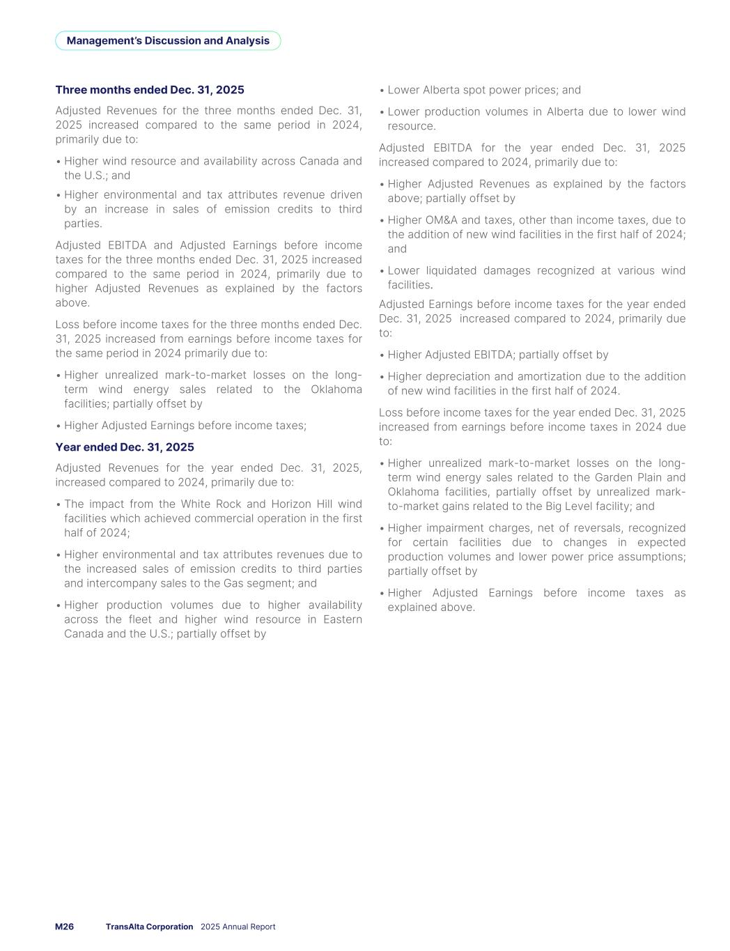 Three months ended Dec. 31, 2025 Adjusted Revenues for the three months ended Dec. 31, 2025 increased compared to the same period in 2024, primarily due to: • Higher wind resource and availability across Canada and the U.S.; and • Higher environmental and tax attributes revenue driven by an increase in sales of emission credits to third parties. Adjusted EBITDA and Adjusted Earnings before income taxes for the three months ended Dec. 31, 2025 increased compared to the same period in 2024, primarily due to higher Adjusted Revenues as explained by the factors above. Loss before income taxes for the three months ended Dec. 31, 2025 increased from earnings before income taxes for the same period in 2024 primarily due to: • Higher unrealized mark-to-market losses on the long- term wind energy sales related to the Oklahoma facilities; partially offset by • Higher Adjusted Earnings before income taxes; Year ended Dec. 31, 2025 Adjusted Revenues for the year ended Dec. 31, 2025, increased compared to 2024, primarily due to: • The impact from the White Rock and Horizon Hill wind facilities which achieved commercial operation in the first half of 2024; • Higher environmental and tax attributes revenues due to the increased sales of emission credits to third parties and intercompany sales to the Gas segment; and • Higher production volumes due to higher availability across the fleet and higher wind resource in Eastern Canada and the U.S.; partially offset by • Lower Alberta spot power prices; and • Lower production volumes in Alberta due to lower wind resource. Adjusted EBITDA for the year ended Dec. 31, 2025 increased compared to 2024, primarily due to: • Higher Adjusted Revenues as explained by the factors above; partially offset by • Higher OM&A and taxes, other than income taxes, due to the addition of new wind facilities in the first half of 2024; and • Lower liquidated damages recognized at various wind facilities. Adjusted Earnings before income taxes for the year ended Dec. 31, 2025 increased compared to 2024, primarily due to: • Higher Adjusted EBITDA; partially offset by • Higher depreciation and amortization due to the addition of new wind facilities in the first half of 2024. Loss before income taxes for the year ended Dec. 31, 2025 increased from earnings before income taxes in 2024 due to: • Higher unrealized mark-to-market losses on the long- term wind energy sales related to the Garden Plain and Oklahoma facilities, partially offset by unrealized mark- to-market gains related to the Big Level facility; and • Higher impairment charges, net of reversals, recognized for certain facilities due to changes in expected production volumes and lower power price assumptions; partially offset by • Higher Adjusted Earnings before income taxes as explained above. M26 TransAlta Corporation 2025 Annual Report