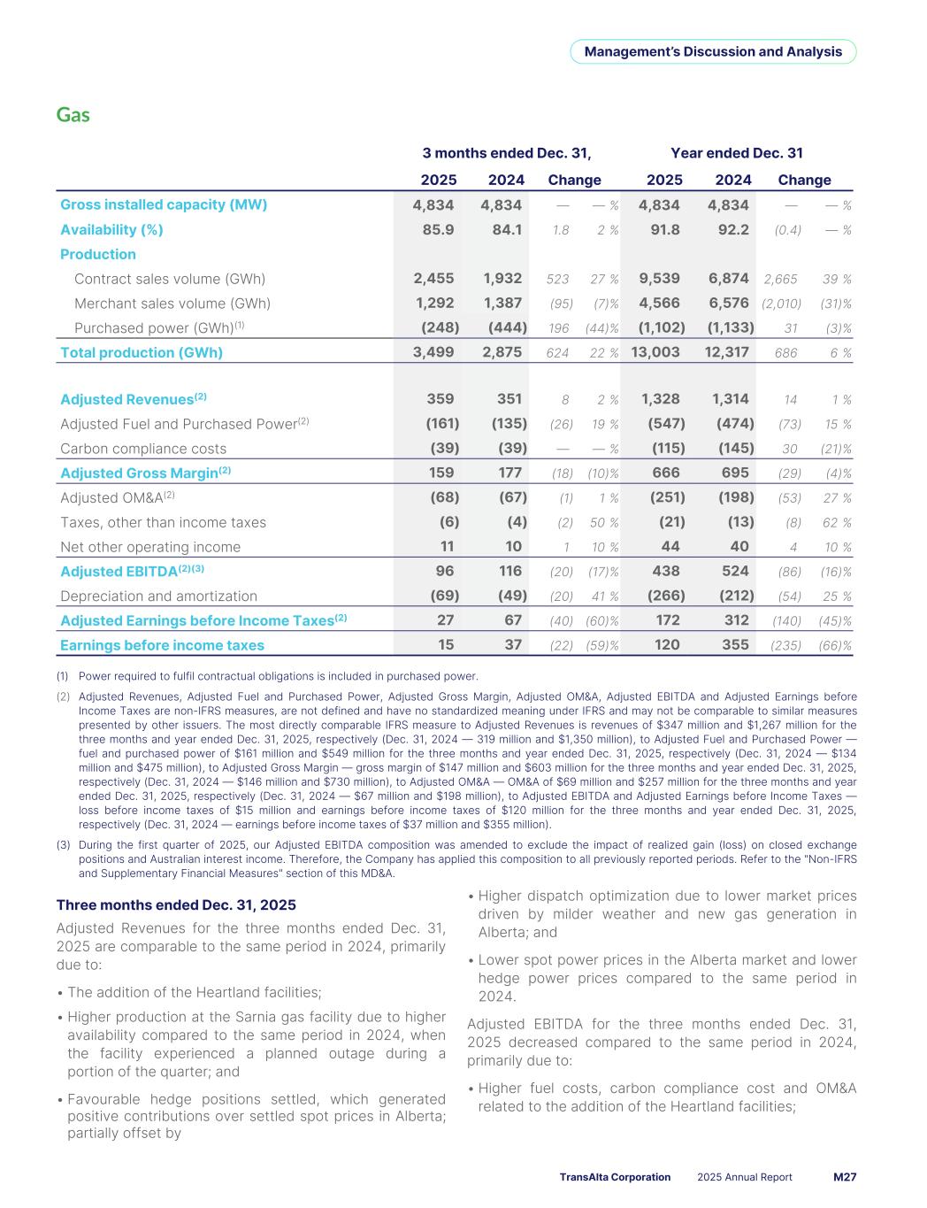 Gas 3 months ended Dec. 31, Year ended Dec. 31 2025 2024 Change 2025 2024 Change Gross installed capacity (MW) 4,834 4,834 — — % 4,834 4,834 — — % Availability (%) 85.9 84.1 1.8 2 % 91.8 92.2 (0.4) — % Production Contract sales volume (GWh) 2,455 1,932 523 27 % 9,539 6,874 2,665 39 % Merchant sales volume (GWh) 1,292 1,387 (95) (7) % 4,566 6,576 (2,010) (31) % Purchased power (GWh)(1) (248) (444) 196 (44) % (1,102) (1,133) 31 (3) % Total production (GWh) 3,499 2,875 624 22 % 13,003 12,317 686 6 % Adjusted Revenues(2) 359 351 8 2 % 1,328 1,314 14 1 % Adjusted Fuel and Purchased Power(2) (161) (135) (26) 19 % (547) (474) (73) 15 % Carbon compliance costs (39) (39) — — % (115) (145) 30 (21) % Adjusted Gross Margin(2) 159 177 (18) (10) % 666 695 (29) (4) % Adjusted OM&A(2) (68) (67) (1) 1 % (251) (198) (53) 27 % Taxes, other than income taxes (6) (4) (2) 50 % (21) (13) (8) 62 % Net other operating income 11 10 1 10 % 44 40 4 10 % Adjusted EBITDA(2)(3) 96 116 (20) (17) % 438 524 (86) (16) % Depreciation and amortization (69) (49) (20) 41 % (266) (212) (54) 25 % Adjusted Earnings before Income Taxes(2) 27 67 (40) (60) % 172 312 (140) (45) % Earnings before income taxes 15 37 (22) (59) % 120 355 (235) (66) % (1) Power required to fulfil contractual obligations is included in purchased power. (2) Adjusted Revenues, Adjusted Fuel and Purchased Power, Adjusted Gross Margin, Adjusted OM&A, Adjusted EBITDA and Adjusted Earnings before Income Taxes are non-IFRS measures, are not defined and have no standardized meaning under IFRS and may not be comparable to similar measures presented by other issuers. The most directly comparable IFRS measure to Adjusted Revenues is revenues of $347 million and $1,267 million for the three months and year ended Dec. 31, 2025, respectively (Dec. 31, 2024 — 319 million and $1,350 million), to Adjusted Fuel and Purchased Power — fuel and purchased power of $161 million and $549 million for the three months and year ended Dec. 31, 2025, respectively (Dec. 31, 2024 — $134 million and $475 million), to Adjusted Gross Margin — gross margin of $147 million and $603 million for the three months and year ended Dec. 31, 2025, respectively (Dec. 31, 2024 — $146 million and $730 million), to Adjusted OM&A — OM&A of $69 million and $257 million for the three months and year ended Dec. 31, 2025, respectively (Dec. 31, 2024 — $67 million and $198 million), to Adjusted EBITDA and Adjusted Earnings before Income Taxes — loss before income taxes of $15 million and earnings before income taxes of $120 million for the three months and year ended Dec. 31, 2025, respectively (Dec. 31, 2024 — earnings before income taxes of $37 million and $355 million). (3) During the first quarter of 2025, our Adjusted EBITDA composition was amended to exclude the impact of realized gain (loss) on closed exchange positions and Australian interest income. Therefore, the Company has applied this composition to all previously reported periods. Refer to the "Non-IFRS and Supplementary Financial Measures" section of this MD&A. Three months ended Dec. 31, 2025 Adjusted Revenues for the three months ended Dec. 31, 2025 are comparable to the same period in 2024, primarily due to: • The addition of the Heartland facilities; • Higher production at the Sarnia gas facility due to higher availability compared to the same period in 2024, when the facility experienced a planned outage during a portion of the quarter; and • Favourable hedge positions settled, which generated positive contributions over settled spot prices in Alberta; partially offset by • Higher dispatch optimization due to lower market prices driven by milder weather and new gas generation in Alberta; and • Lower spot power prices in the Alberta market and lower hedge power prices compared to the same period in 2024. Adjusted EBITDA for the three months ended Dec. 31, 2025 decreased compared to the same period in 2024, primarily due to: • Higher fuel costs, carbon compliance cost and OM&A related to the addition of the Heartland facilities; TransAlta Corporation 2025 Annual Report M27