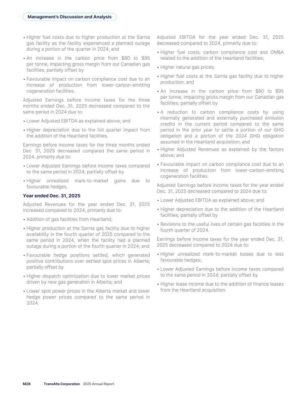 • Higher fuel costs due to higher production at the Sarnia gas facility as the facility experienced a planned outage during a portion of the quarter in 2024; and • An increase in the carbon price from $80 to $95 per tonne, impacting gross margin from our Canadian gas facilities; partially offset by • Favourable impact on carbon compliance cost due to an increase of production from lower-carbon-emitting cogeneration facilities. Adjusted Earnings before income taxes for the three months ended Dec. 31, 2025 decreased compared to the same period in 2024 due to: • Lower Adjusted EBITDA as explained above; and • Higher depreciation due to the full quarter impact from the addition of the Heartland facilities. Earnings before income taxes for the three months ended Dec. 31, 2025 decreased compared the same period in 2024, primarily due to: • Lower Adjusted Earnings before income taxes compared to the same period in 2024; partially offset by • Higher unrealized mark-to-market gains due to favourable hedges. Year ended Dec. 31, 2025 Adjusted Revenues for the year ended Dec. 31, 2025 increased compared to 2024, primarily due to: • Addition of gas facilities from Heartland; • Higher production at the Sarnia gas facility due to higher availability in the fourth quarter of 2025 compared to the same period in 2024, when the facility had a planned outage during a portion of the fourth quarter in 2024; and • Favourable hedge positions settled, which generated positive contributions over settled spot prices in Alberta; partially offset by • Higher dispatch optimization due to lower market prices driven by new gas generation in Alberta; and • Lower spot power prices in the Alberta market and lower hedge power prices compared to the same period in 2024. Adjusted EBITDA for the year ended Dec. 31, 2025 decreased compared to 2024, primarily due to: • Higher fuel costs, carbon compliance cost and OM&A related to the addition of the Heartland facilities; • Higher natural gas prices; • Higher fuel costs at the Sarnia gas facility due to higher production; and • An increase in the carbon price from $80 to $95 per tonne, impacting gross margin from our Canadian gas facilities; partially offset by • A reduction to carbon compliance costs by using internally generated and externally purchased emission credits in the current period compared to the same period in the prior year to settle a portion of our GHG obligation and a portion of the 2024 GHG obligation assumed in the Heartland acquisition; and • Higher Adjusted Revenues as explained by the factors above; and • Favourable impact on carbon compliance cost due to an increase of production from lower-carbon-emitting cogeneration facilities. Adjusted Earnings before income taxes for the year ended Dec. 31, 2025 decreased compared to 2024 due to: • Lower Adjusted EBITDA as explained above; and • Higher depreciation due to the addition of the Heartland facilities; partially offset by • Revisions to the useful lives of certain gas facilities in the fourth quarter of 2024. Earnings before income taxes for the year ended Dec. 31, 2025 decreased compared to 2024 due to: • Higher unrealized mark-to-market losses due to less favourable hedges; • Lower Adjusted Earnings before income taxes compared to the same period in 2024; partially offset by • Higher lease income due to the addition of finance leases from the Heartland acquisition. M28 TransAlta Corporation 2025 Annual Report