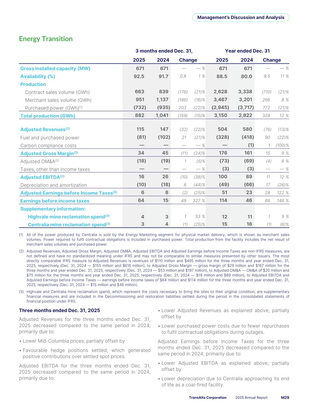 Energy Transition 3 months ended Dec. 31, Year ended Dec. 31 2025 2024 Change 2025 2024 Change Gross installed capacity (MW) 671 671 — — % 671 671 — — % Availability (%) 92.5 91.7 0.8 1 % 88.5 80.0 8.5 11 % Production Contract sales volume (GWh) 663 839 (176) (21) % 2,628 3,338 (710) (21) % Merchant sales volume (GWh) 951 1,137 (186) (16) % 3,467 3,201 266 8 % Purchased power (GWh)(1) (732) (935) 203 (22) % (2,945) (3,717) 772 (21) % Total production (GWh) 882 1,041 (159) (15) % 3,150 2,822 328 12 % Adjusted Revenues(2) 115 147 (32) (22) % 504 580 (76) (13) % Fuel and purchased power (81) (102) 21 (21) % (328) (418) 90 (22) % Carbon compliance costs — — — — % — (1) 1 (100) % Adjusted Gross Margin(2) 34 45 (11) (24) % 176 161 15 9 % Adjusted OM&A(2) (18) (19) 1 (5) % (73) (69) (4) 6 % Taxes, other than income taxes — — — — % (3) (3) — — % Adjusted EBITDA(2) 16 26 (10) (38) % 100 89 11 12 % Depreciation and amortization (10) (18) 8 (44) % (49) (66) 17 (26) % Adjusted Earnings before Income Taxes(2) 6 8 (2) (25) % 51 23 28 122 % Earnings before income taxes 64 15 49 327 % 114 46 68 148 % Supplementary information: Highvale mine reclamation spend(3) 4 3 1 33 % 12 11 1 9 % Centralia mine reclamation spend(3) 3 4 (1) (25) % 15 16 (1) (6) % (1) All of the power produced by Centralia is sold by the Energy Marketing segment for physical market delivery, which is shown as merchant sales volumes. Power required to fulfil contractual obligations is included in purchased power. Total production from the facility includes the net result of merchant sales volumes and purchased power. (2) Adjusted Revenues, Adjusted Gross Margin, Adjusted OM&A, Adjusted EBITDA and Adjusted Earnings before Income Taxes are non-IFRS measures, are not defined and have no standardized meaning under IFRS and may not be comparable to similar measures presented by other issuers. The most directly comparable IFRS measure to Adjusted Revenues is revenues of $110 million and $495 million for the three months and year ended Dec. 31, 2025, respectively (Dec. 31, 2024 — $155 million and $616 million), to Adjusted Gross Margin — gross margin of $29 million and $167 million for the three months and year ended Dec. 31, 2025, respectively (Dec. 31, 2024 — $53 million and $197 million), to Adjusted OM&A — OM&A of $20 million and $75 million for the three months and year ended Dec. 31, 2025, respectively (Dec. 31, 2024 — $19 million and $69 million), to Adjusted EBITDA and Adjusted Earnings before Income Taxes — earnings before income taxes of $64 million and $114 million for the three months and year ended Dec. 31, 2025, respectively (Dec. 31, 2024 — $15 million and $46 million). (3) Highvale and Centralia mine reclamation spend, which represent the costs necessary to bring the sites to their original condition, are supplementary financial measures and are included in the Decommissioning and restoration liabilities settled during the period in the consolidated statements of financial position under IFRS. Three months ended Dec. 31, 2025 Adjusted Revenues for the three months ended Dec. 31, 2025 decreased compared to the same period in 2024, primarily due to: • Lower Mid-Columbia prices; partially offset by • Favourable hedge positions settled, which generated positive contributions over settled spot prices. Adjusted EBITDA for the three months ended Dec. 31, 2025 decreased compared to the same period in 2024, primarily due to: • Lower Adjusted Revenues as explained above; partially offset by • Lower purchased power costs due to fewer repurchases to fulfil contractual obligations during outages. Adjusted Earnings before Income Taxes for the three months ended Dec. 31, 2025 decreased compared to the same period in 2024, primarily due to: • Lower Adjusted EBITDA as explained above; partially offset by • Lower depreciation due to Centralia approaching its end of life as a coal-fired facility. TransAlta Corporation 2025 Annual Report M29