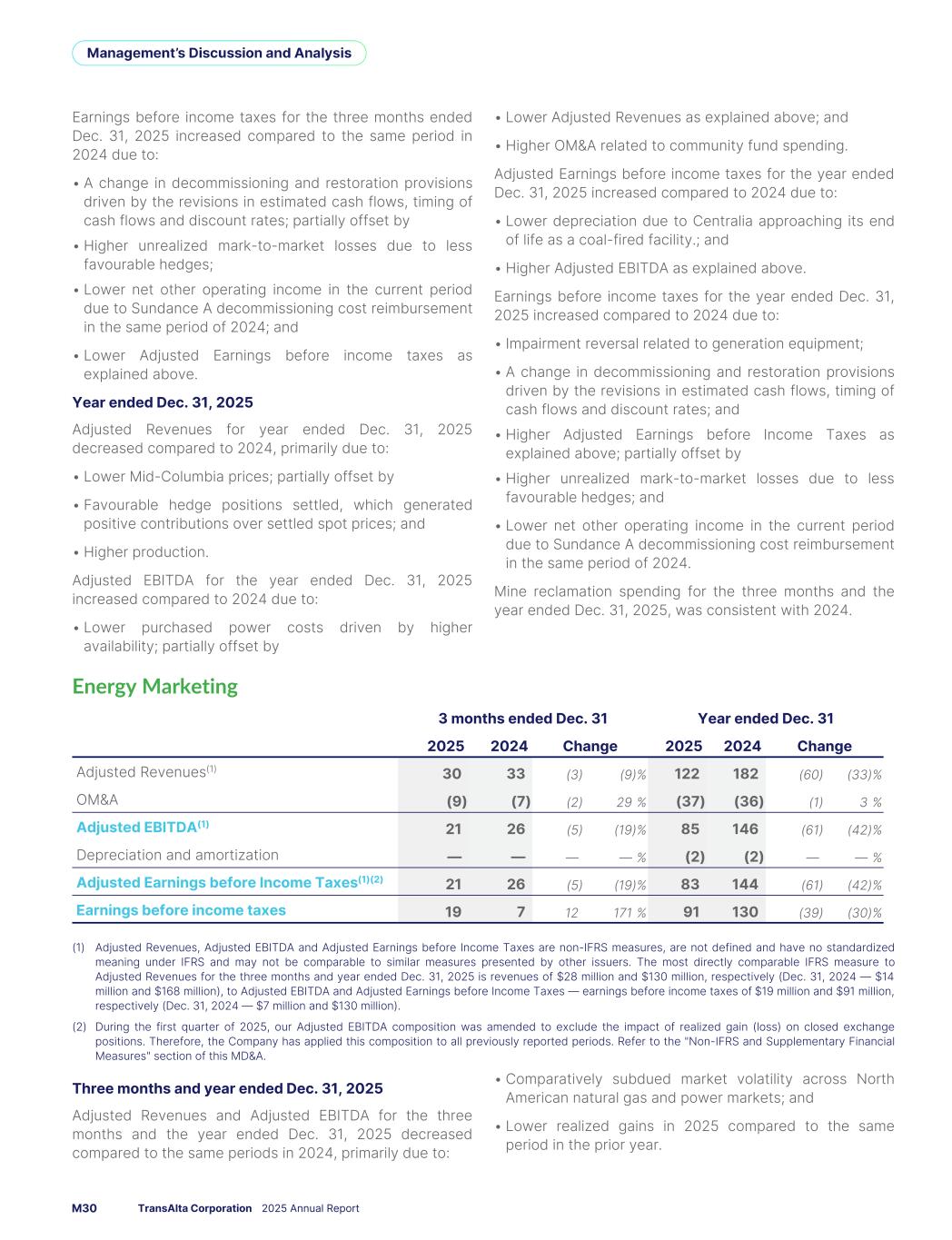 Earnings before income taxes for the three months ended Dec. 31, 2025 increased compared to the same period in 2024 due to: • A change in decommissioning and restoration provisions driven by the revisions in estimated cash flows, timing of cash flows and discount rates; partially offset by • Higher unrealized mark-to-market losses due to less favourable hedges; • Lower net other operating income in the current period due to Sundance A decommissioning cost reimbursement in the same period of 2024; and • Lower Adjusted Earnings before income taxes as explained above. Year ended Dec. 31, 2025 Adjusted Revenues for year ended Dec. 31, 2025 decreased compared to 2024, primarily due to: • Lower Mid-Columbia prices; partially offset by • Favourable hedge positions settled, which generated positive contributions over settled spot prices; and • Higher production. Adjusted EBITDA for the year ended Dec. 31, 2025 increased compared to 2024 due to: • Lower purchased power costs driven by higher availability; partially offset by • Lower Adjusted Revenues as explained above; and • Higher OM&A related to community fund spending. Adjusted Earnings before income taxes for the year ended Dec. 31, 2025 increased compared to 2024 due to: • Lower depreciation due to Centralia approaching its end of life as a coal-fired facility.; and • Higher Adjusted EBITDA as explained above. Earnings before income taxes for the year ended Dec. 31, 2025 increased compared to 2024 due to: • Impairment reversal related to generation equipment; • A change in decommissioning and restoration provisions driven by the revisions in estimated cash flows, timing of cash flows and discount rates; and • Higher Adjusted Earnings before Income Taxes as explained above; partially offset by • Higher unrealized mark-to-market losses due to less favourable hedges; and • Lower net other operating income in the current period due to Sundance A decommissioning cost reimbursement in the same period of 2024. Mine reclamation spending for the three months and the year ended Dec. 31, 2025, was consistent with 2024. Energy Marketing 3 months ended Dec. 31 Year ended Dec. 31 2025 2024 Change 2025 2024 Change Adjusted Revenues(1) 30 33 (3) (9) % 122 182 (60) (33) % OM&A (9) (7) (2) 29 % (37) (36) (1) 3 % Adjusted EBITDA(1) 21 26 (5) (19) % 85 146 (61) (42) % Depreciation and amortization — — — — % (2) (2) — — % Adjusted Earnings before Income Taxes(1)(2) 21 26 (5) (19) % 83 144 (61) (42) % Earnings before income taxes 19 7 12 171 % 91 130 (39) (30) % (1) Adjusted Revenues, Adjusted EBITDA and Adjusted Earnings before Income Taxes are non-IFRS measures, are not defined and have no standardized meaning under IFRS and may not be comparable to similar measures presented by other issuers. The most directly comparable IFRS measure to Adjusted Revenues for the three months and year ended Dec. 31, 2025 is revenues of $28 million and $130 million, respectively (Dec. 31, 2024 — $14 million and $168 million), to Adjusted EBITDA and Adjusted Earnings before Income Taxes — earnings before income taxes of $19 million and $91 million, respectively (Dec. 31, 2024 — $7 million and $130 million). (2) During the first quarter of 2025, our Adjusted EBITDA composition was amended to exclude the impact of realized gain (loss) on closed exchange positions. Therefore, the Company has applied this composition to all previously reported periods. Refer to the "Non-IFRS and Supplementary Financial Measures" section of this MD&A. Three months and year ended Dec. 31, 2025 Adjusted Revenues and Adjusted EBITDA for the three months and the year ended Dec. 31, 2025 decreased compared to the same periods in 2024, primarily due to: • Comparatively subdued market volatility across North American natural gas and power markets; and • Lower realized gains in 2025 compared to the same period in the prior year. M30 TransAlta Corporation 2025 Annual Report