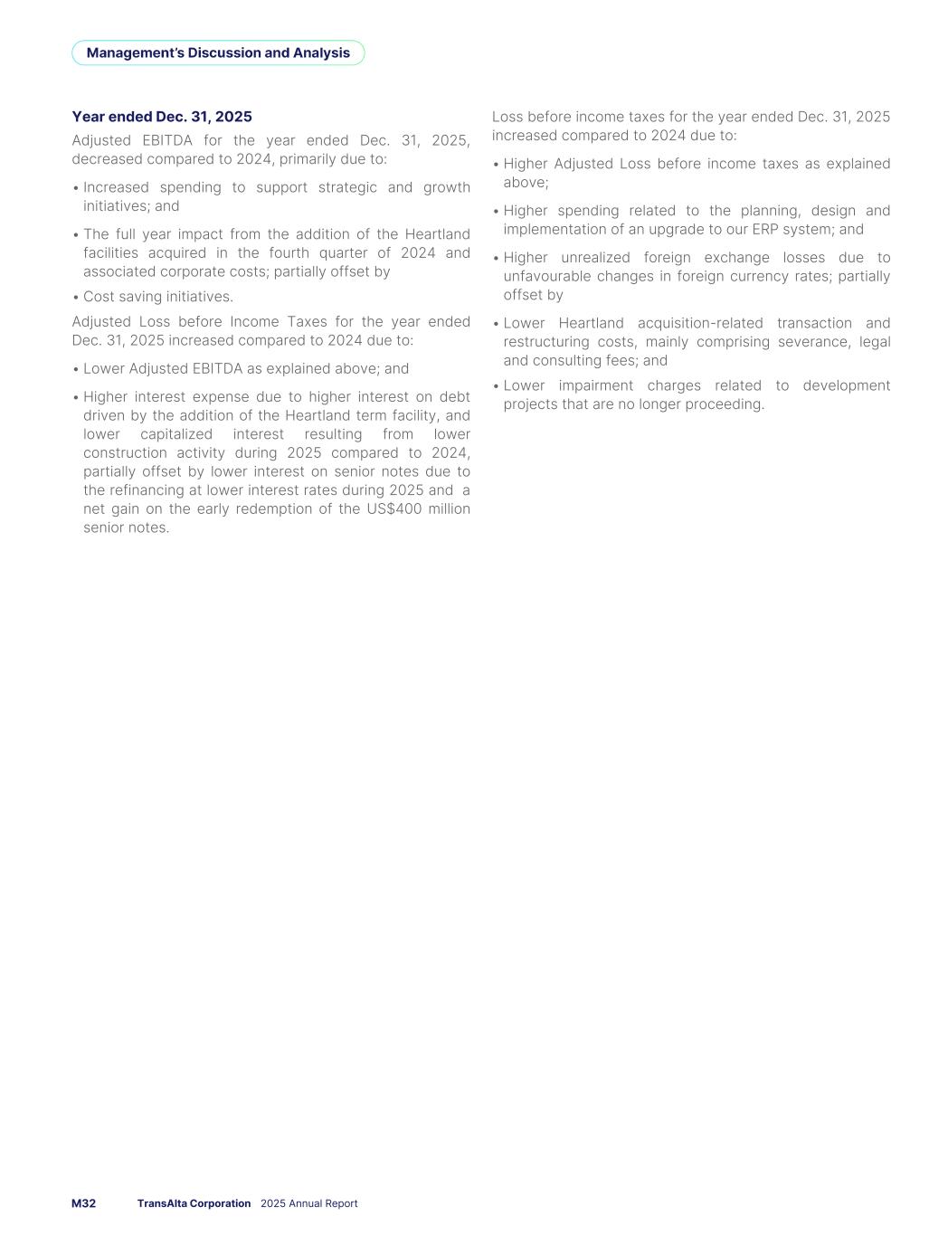 Year ended Dec. 31, 2025 Adjusted EBITDA for the year ended Dec. 31, 2025, decreased compared to 2024, primarily due to: • Increased spending to support strategic and growth initiatives; and • The full year impact from the addition of the Heartland facilities acquired in the fourth quarter of 2024 and associated corporate costs; partially offset by • Cost saving initiatives. Adjusted Loss before Income Taxes for the year ended Dec. 31, 2025 increased compared to 2024 due to: • Lower Adjusted EBITDA as explained above; and • Higher interest expense due to higher interest on debt driven by the addition of the Heartland term facility, and lower capitalized interest resulting from lower construction activity during 2025 compared to 2024, partially offset by lower interest on senior notes due to the refinancing at lower interest rates during 2025 and a net gain on the early redemption of the US$400 million senior notes. Loss before income taxes for the year ended Dec. 31, 2025 increased compared to 2024 due to: • Higher Adjusted Loss before income taxes as explained above; • Higher spending related to the planning, design and implementation of an upgrade to our ERP system; and • Higher unrealized foreign exchange losses due to unfavourable changes in foreign currency rates; partially offset by • Lower Heartland acquisition-related transaction and restructuring costs, mainly comprising severance, legal and consulting fees; and • Lower impairment charges related to development projects that are no longer proceeding. M32 TransAlta Corporation 2025 Annual Report