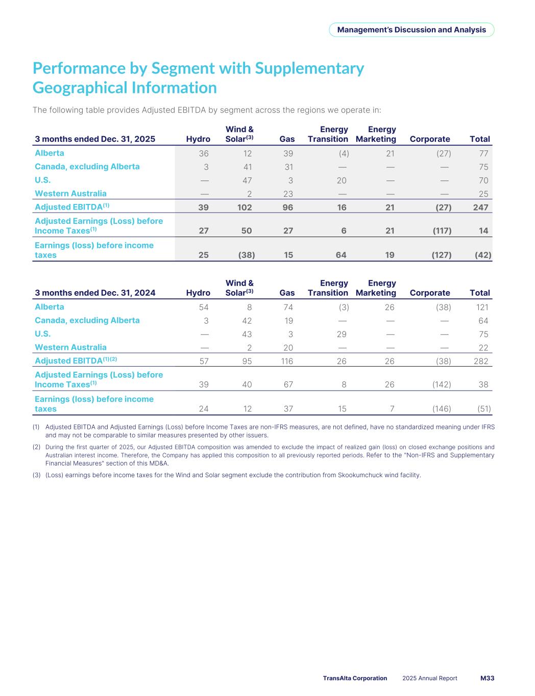 Performance by Segment with Supplementary Geographical Information The following table provides Adjusted EBITDA by segment across the regions we operate in: 3 months ended Dec. 31, 2025 Hydro Wind & Solar(3) Gas Energy Transition Energy Marketing Corporate Total Alberta 36 12 39 (4) 21 (27) 77 Canada, excluding Alberta 3 41 31 — — — 75 U.S. — 47 3 20 — — 70 Western Australia — 2 23 — — — 25 Adjusted EBITDA(1) 39 102 96 16 21 (27) 247 Adjusted Earnings (Loss) before Income Taxes(1) 27 50 27 6 21 (117) 14 Earnings (loss) before income taxes 25 (38) 15 64 19 (127) (42) 3 months ended Dec. 31, 2024 Hydro Wind & Solar(3) Gas Energy Transition Energy Marketing Corporate Total Alberta 54 8 74 (3) 26 (38) 121 Canada, excluding Alberta 3 42 19 — — — 64 U.S. — 43 3 29 — — 75 Western Australia — 2 20 — — — 22 Adjusted EBITDA(1)(2) 57 95 116 26 26 (38) 282 Adjusted Earnings (Loss) before Income Taxes(1) 39 40 67 8 26 (142) 38 Earnings (loss) before income taxes 24 12 37 15 7 (146) (51) (1) Adjusted EBITDA and Adjusted Earnings (Loss) before Income Taxes are non-IFRS measures, are not defined, have no standardized meaning under IFRS and may not be comparable to similar measures presented by other issuers. (2) During the first quarter of 2025, our Adjusted EBITDA composition was amended to exclude the impact of realized gain (loss) on closed exchange positions and Australian interest income. Therefore, the Company has applied this composition to all previously reported periods. Refer to the "Non-IFRS and Supplementary Financial Measures" section of this MD&A. (3) (Loss) earnings before income taxes for the Wind and Solar segment exclude the contribution from Skookumchuck wind facility. TransAlta Corporation 2025 Annual Report M33