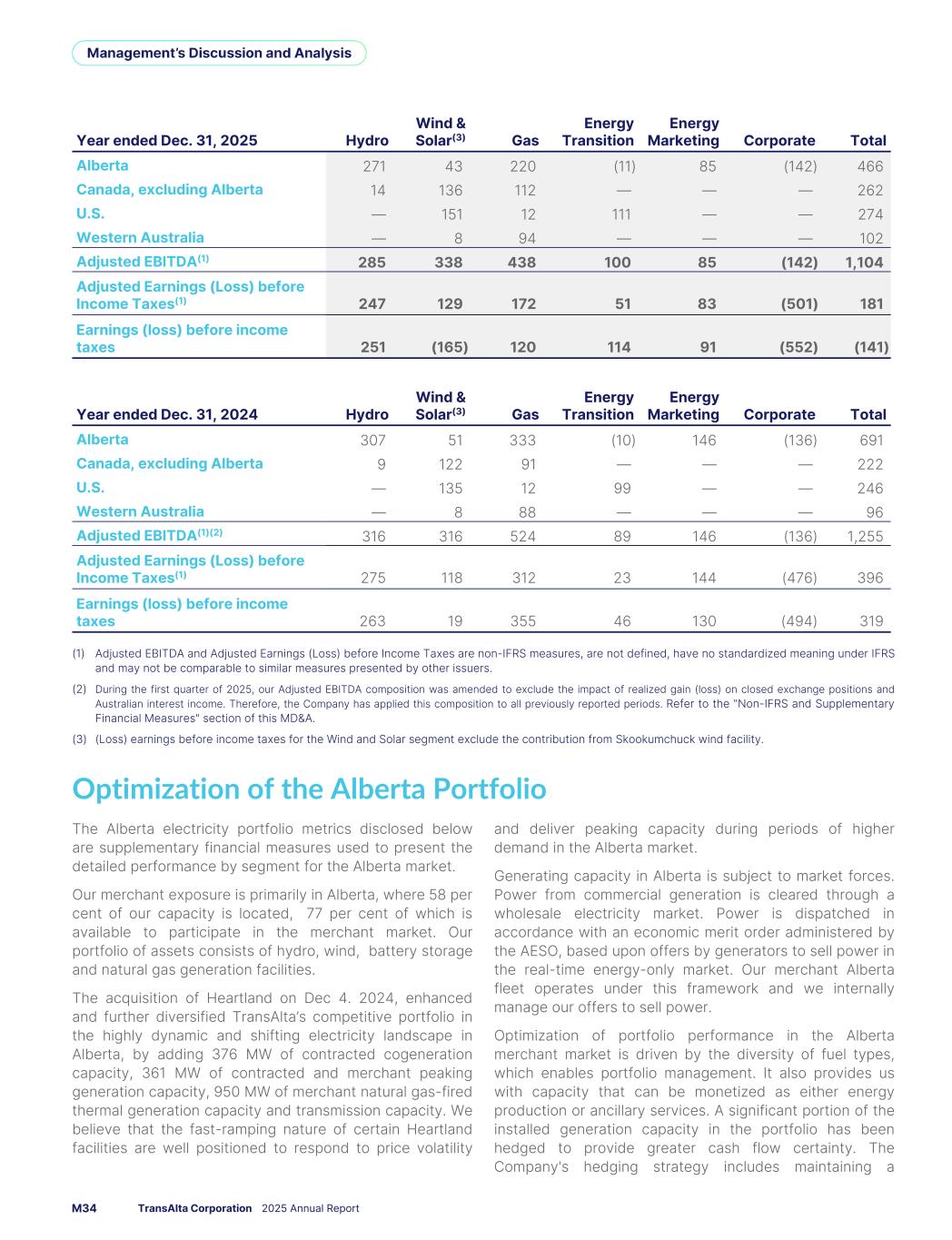 Year ended Dec. 31, 2025 Hydro Wind & Solar(3) Gas Energy Transition Energy Marketing Corporate Total Alberta 271 43 220 (11) 85 (142) 466 Canada, excluding Alberta 14 136 112 — — — 262 U.S. — 151 12 111 — — 274 Western Australia — 8 94 — — — 102 Adjusted EBITDA(1) 285 338 438 100 85 (142) 1,104 Adjusted Earnings (Loss) before Income Taxes(1) 247 129 172 51 83 (501) 181 Earnings (loss) before income taxes 251 (165) 120 114 91 (552) (141) Year ended Dec. 31, 2024 Hydro Wind & Solar(3) Gas Energy Transition Energy Marketing Corporate Total Alberta 307 51 333 (10) 146 (136) 691 Canada, excluding Alberta 9 122 91 — — — 222 U.S. — 135 12 99 — — 246 Western Australia — 8 88 — — — 96 Adjusted EBITDA(1)(2) 316 316 524 89 146 (136) 1,255 Adjusted Earnings (Loss) before Income Taxes(1) 275 118 312 23 144 (476) 396 Earnings (loss) before income taxes 263 19 355 46 130 (494) 319 (1) Adjusted EBITDA and Adjusted Earnings (Loss) before Income Taxes are non-IFRS measures, are not defined, have no standardized meaning under IFRS and may not be comparable to similar measures presented by other issuers. (2) During the first quarter of 2025, our Adjusted EBITDA composition was amended to exclude the impact of realized gain (loss) on closed exchange positions and Australian interest income. Therefore, the Company has applied this composition to all previously reported periods. Refer to the "Non-IFRS and Supplementary Financial Measures" section of this MD&A. (3) (Loss) earnings before income taxes for the Wind and Solar segment exclude the contribution from Skookumchuck wind facility. Optimization of the Alberta Portfolio The Alberta electricity portfolio metrics disclosed below are supplementary financial measures used to present the detailed performance by segment for the Alberta market. Our merchant exposure is primarily in Alberta, where 58 per cent of our capacity is located, 77 per cent of which is available to participate in the merchant market. Our portfolio of assets consists of hydro, wind, battery storage and natural gas generation facilities. The acquisition of Heartland on Dec 4. 2024, enhanced and further diversified TransAlta’s competitive portfolio in the highly dynamic and shifting electricity landscape in Alberta, by adding 376 MW of contracted cogeneration capacity, 361 MW of contracted and merchant peaking generation capacity, 950 MW of merchant natural gas-fired thermal generation capacity and transmission capacity. We believe that the fast-ramping nature of certain Heartland facilities are well positioned to respond to price volatility and deliver peaking capacity during periods of higher demand in the Alberta market. Generating capacity in Alberta is subject to market forces. Power from commercial generation is cleared through a wholesale electricity market. Power is dispatched in accordance with an economic merit order administered by the AESO, based upon offers by generators to sell power in the real-time energy-only market. Our merchant Alberta fleet operates under this framework and we internally manage our offers to sell power. Optimization of portfolio performance in the Alberta merchant market is driven by the diversity of fuel types, which enables portfolio management. It also provides us with capacity that can be monetized as either energy production or ancillary services. A significant portion of the installed generation capacity in the portfolio has been hedged to provide greater cash flow  certainty. The Company's hedging strategy includes maintaining a M34 TransAlta Corporation 2025 Annual Report